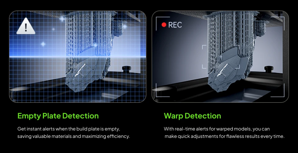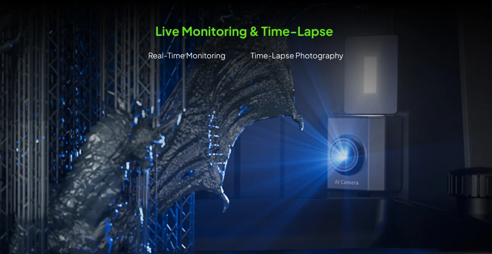 Камера AI предлагает мониторинг в реальном времени и мгновенные оповещения о пустых пластинах и деформированных моделях, что позволяет вам решать их без промедления.Благодаря встроенной камере вы можете легко проверять прогресс печати днем и ночью, а функция замедления времени позволяет легко запечатлеть и делиться своим творческим путешествием.