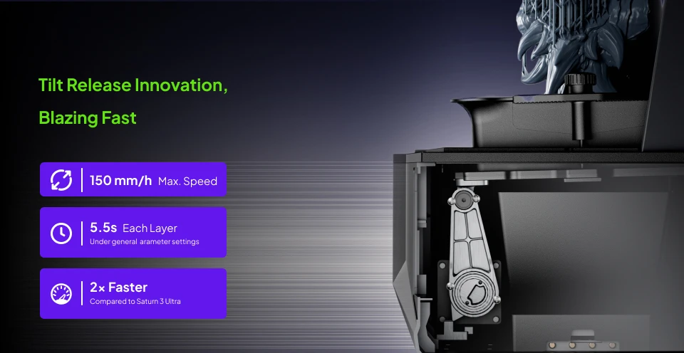 Инновационная функция освобождения наклона, быстрое прилегание Saturn 4 Ultra 16K оснащена передовой технологией освобождения наклона, позволяющей быстро и легко очищать модели.Благодаря впечатляющей скорости до 150 мм/ч вы сможете в кратчайшие сроки оживить свои самые сложные дизайны, обеспечивая при этом непревзойденную детализацию и качество каждого отпечатка.