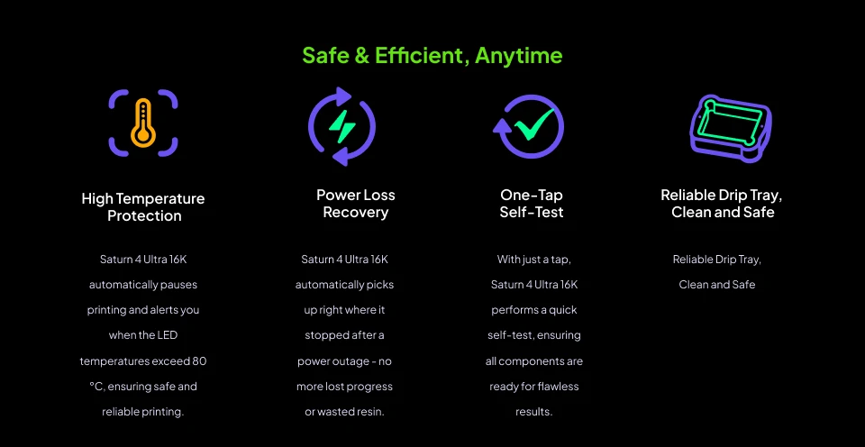Усовершенствованная защита от перегрева Saturn 4 Ultra 16K автоматически приостанавливает печать и предупреждает вас, когда температура светодиода превышает 80°С.°C, обеспечивающие безопасную и надежную печать.