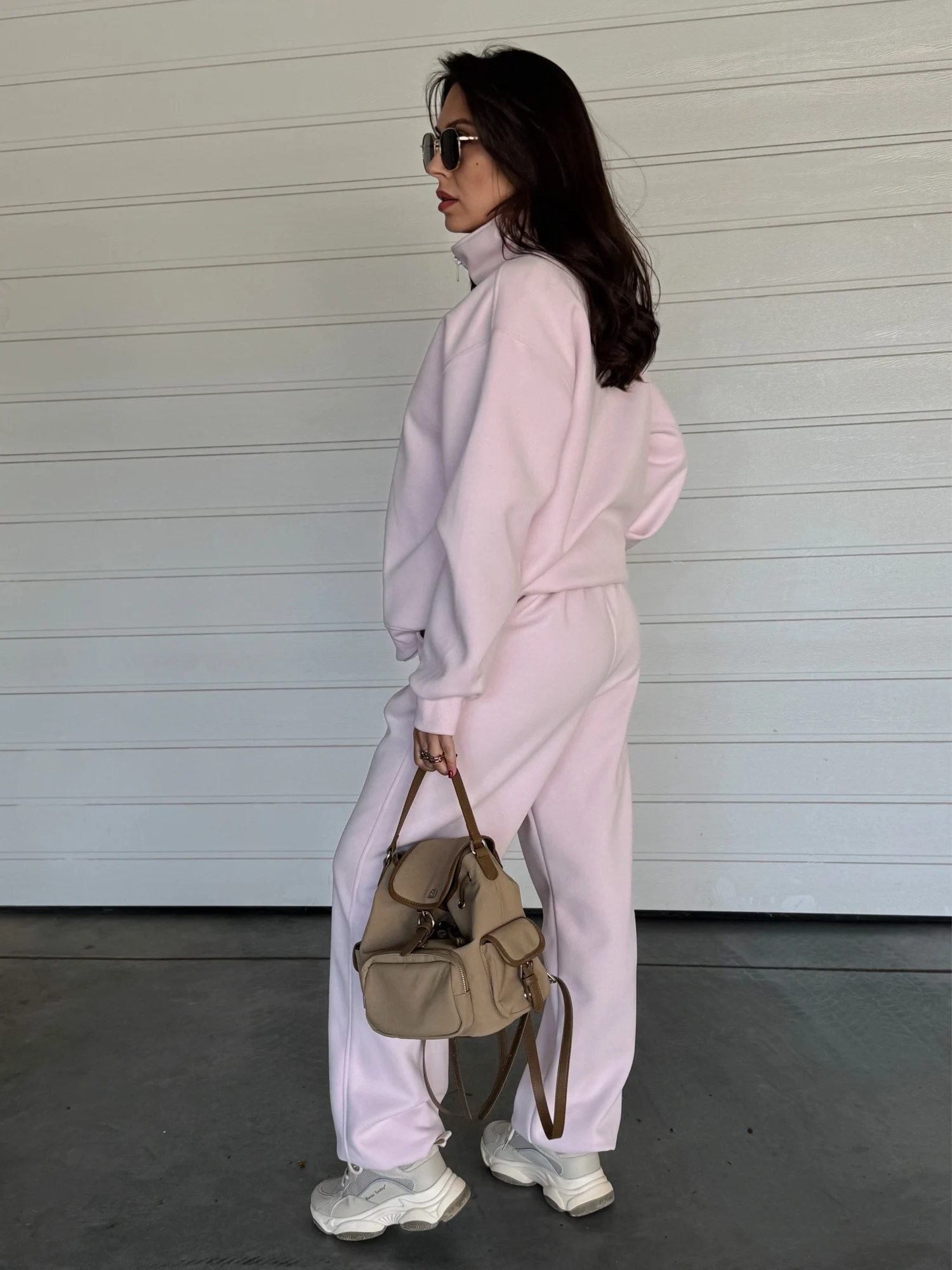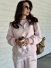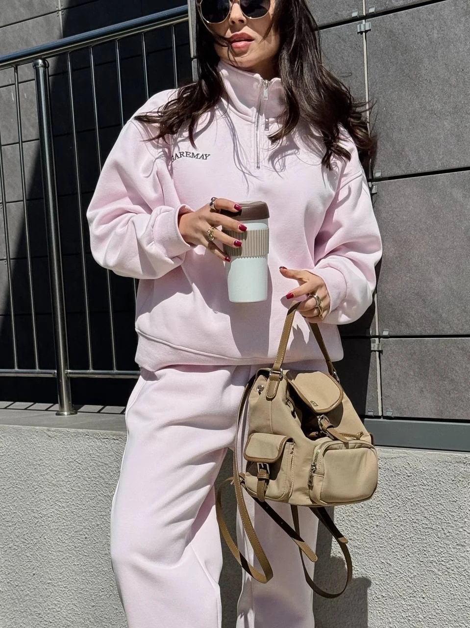 Трикотажный спортивный костюм На свои параметры 88/66/88 см, грудь 75С и рост 160 см брала костюм в размере S. Состав: 80% хлопок, 20% полиэстер. Не утепленный, но теплый. У костюма в светло-розовом цвете вышивка лого в черном цвете.