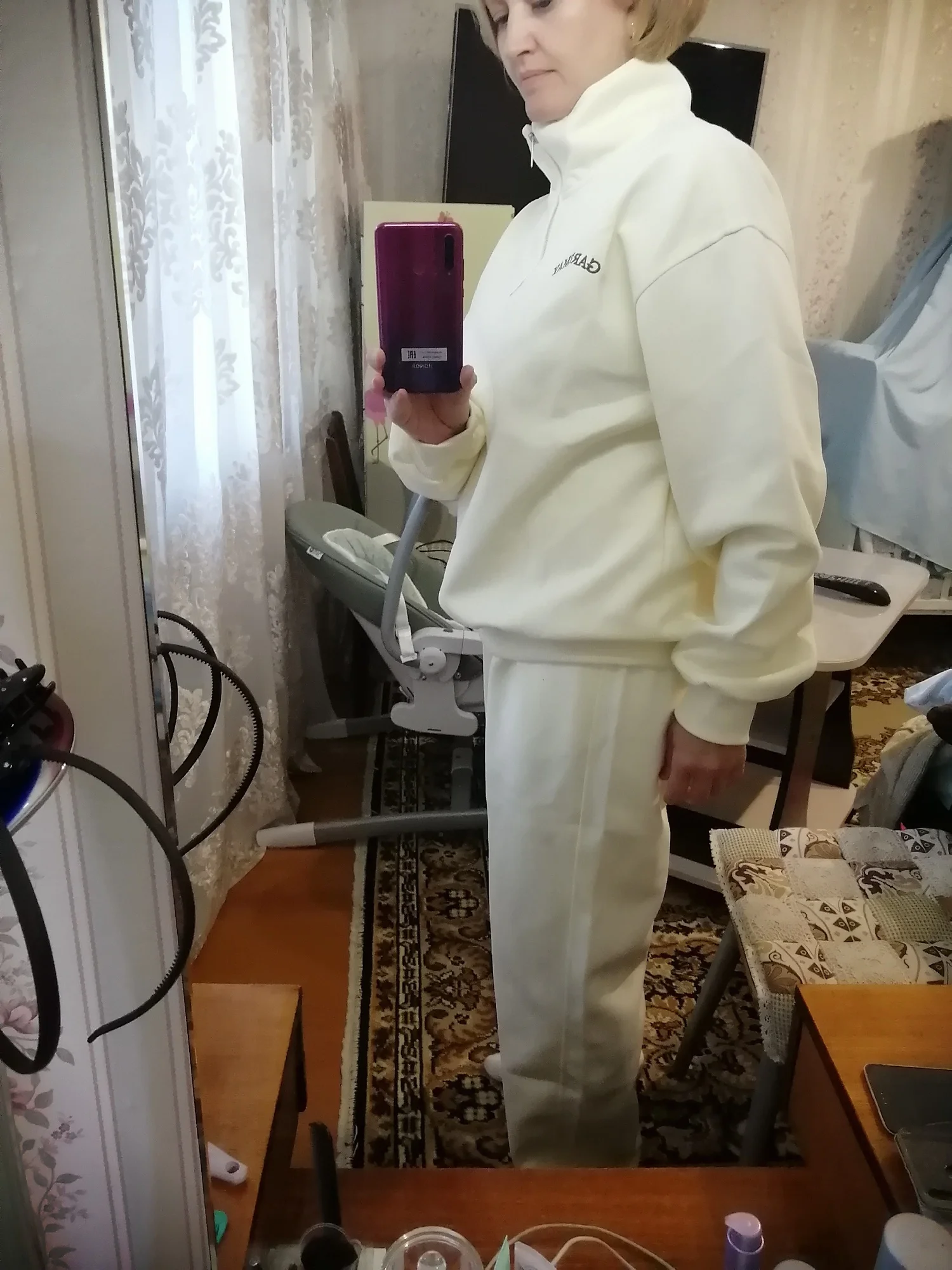 Прекрасный костюм! Хоть в полотне и присутствует синтетика, но трикотаж мягкий, не скрипит между пальцами и очень приятный к телу. Полагаю из-за не натурального состава и цена такая небольшая. На ярлык какая-то противоречия информация по составу полотна. Впрочем, костюм выглядит красиво и дорого. На мою фигуру костюм сел свободно - оверсайз. Но я сама так хотела, из-за кофты. Очень уж мне хотелось иметь такую спортивную свободную кофту. Да, брюки длинноваты - внизу гормошкой. Но резинки внизу брючин спасли ситуацию. У меня небольшой рост: 156 см и большая грудь. Поэтому мне сложно подобрать идеальный костюм. Обычно, либо брюки длинные, либо в плечах и груди всё узко. А в этом костюме мне прям очень удобно. Померила и снимать не хотелось! Я довольна покупкой. И всем рекомендую, берите, не пожалеете! Я ношу российский размер 44-46. Заказала этот костюм в размере М. Мои параметры: обхват талии 75см (живот обвис после родов), обхват бёдер 96см, обхват груди 95см, ширина плеч 36 см.Ekaterina S. 21 июня 2025
