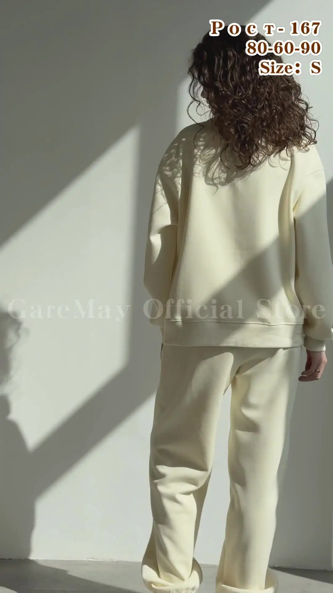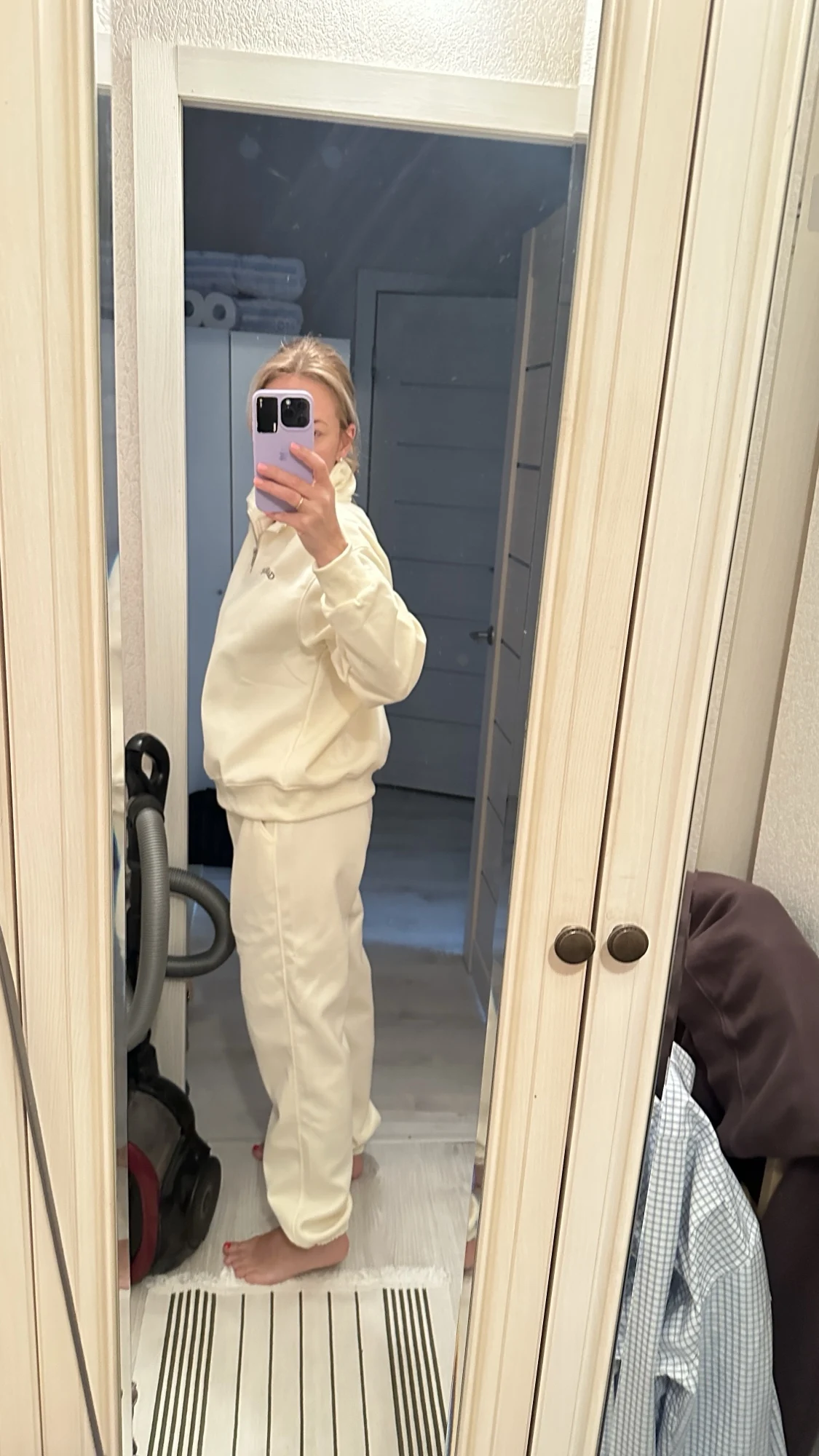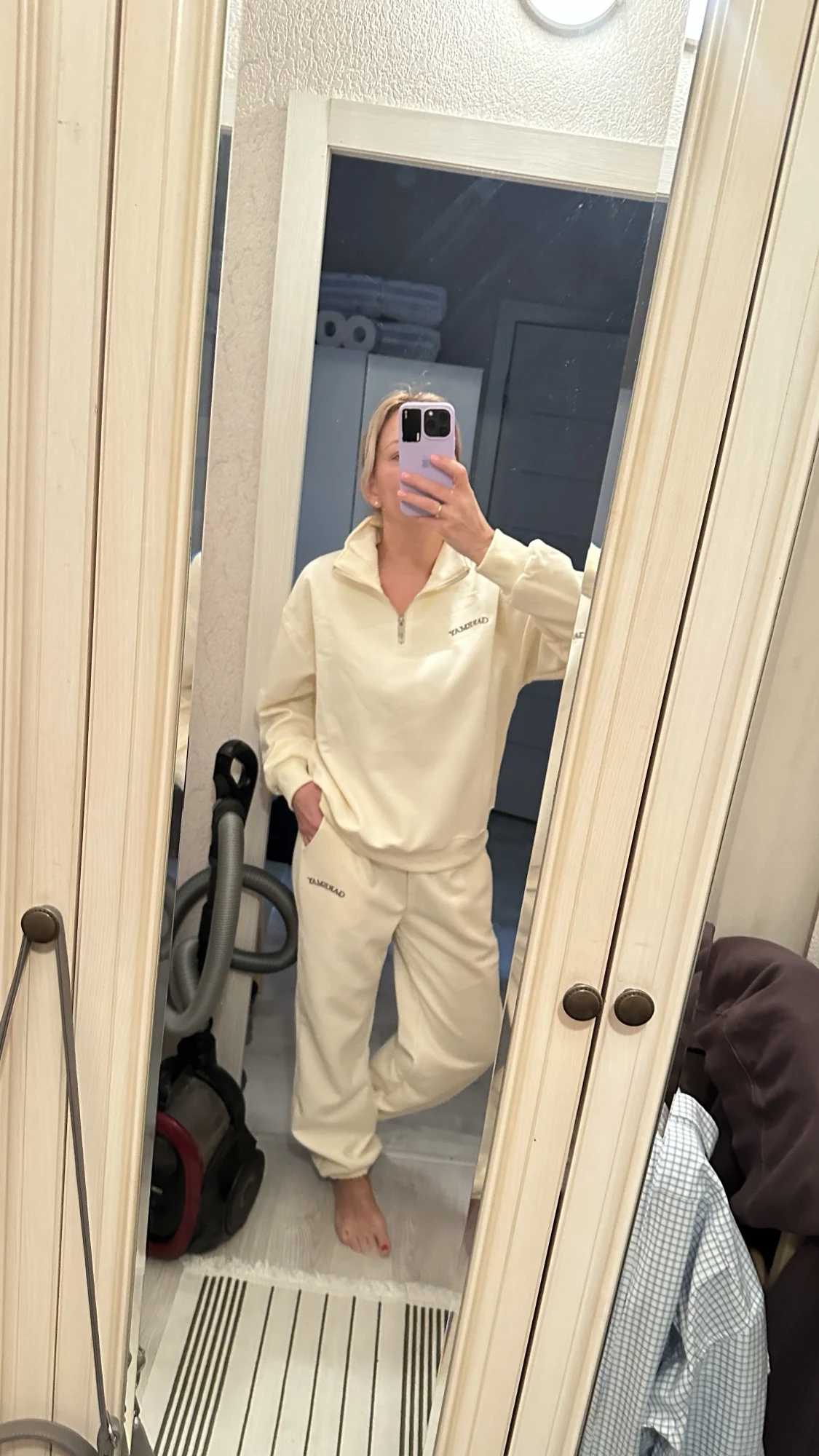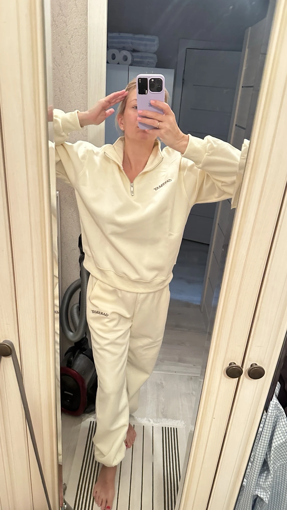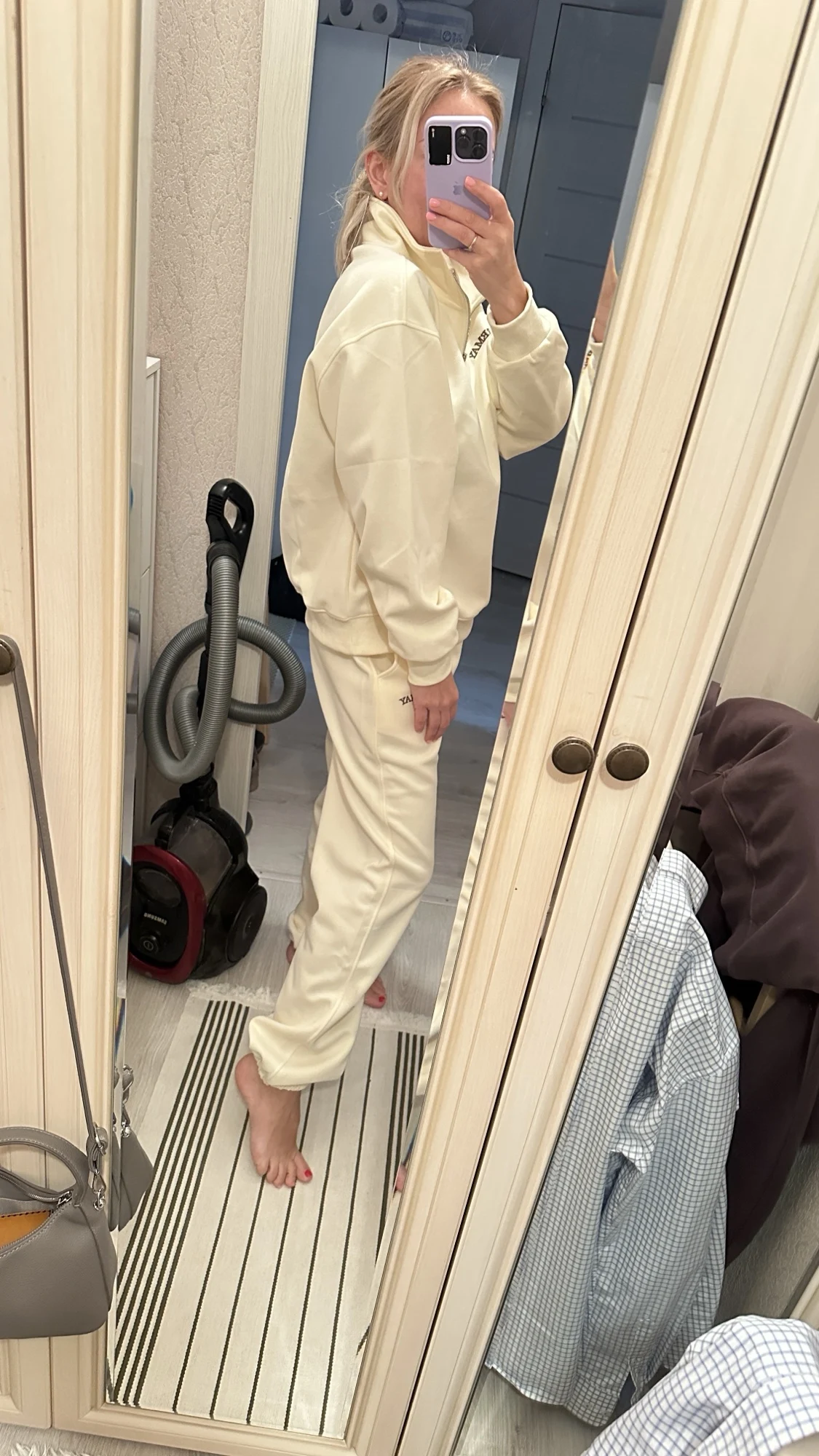 Спортивный костюм в цвете сливочного масла. Безумно понравился цвет! Очень здорово освежает) На мои параметры 80/62/93, рост 165 см размер S сел достаточно свободно. Есть запас под большие параметры, в том числе и по росту. Состав внешнего материала: 80% хлопок, 20% полиэстер. Внутренний: 97% полиэстер, 3% спандекс. Костюм без утепления, но материал плотный, держит форму. Качество хорошее.