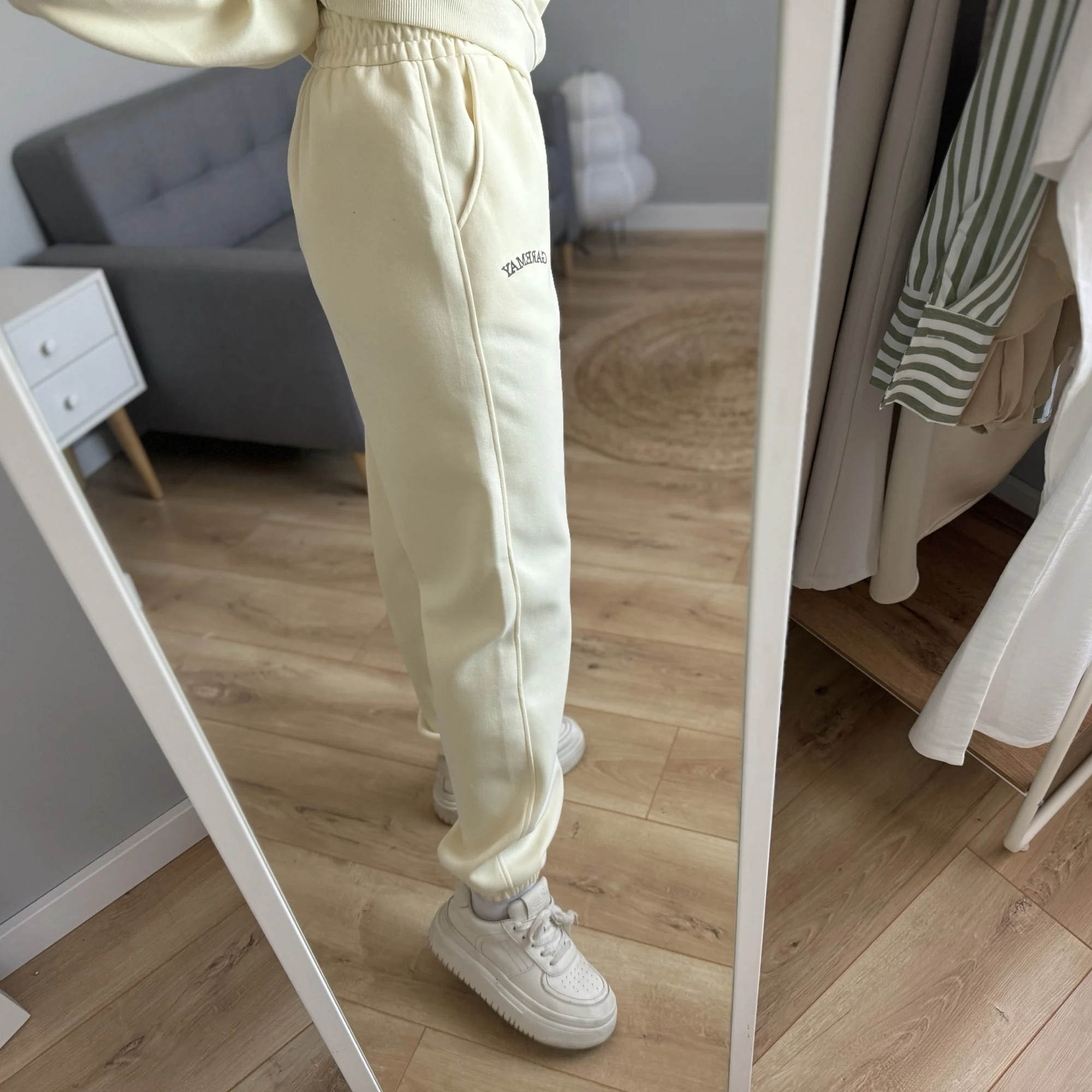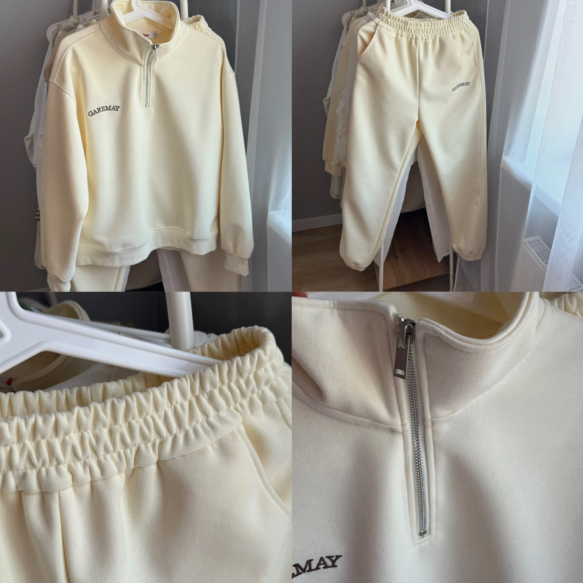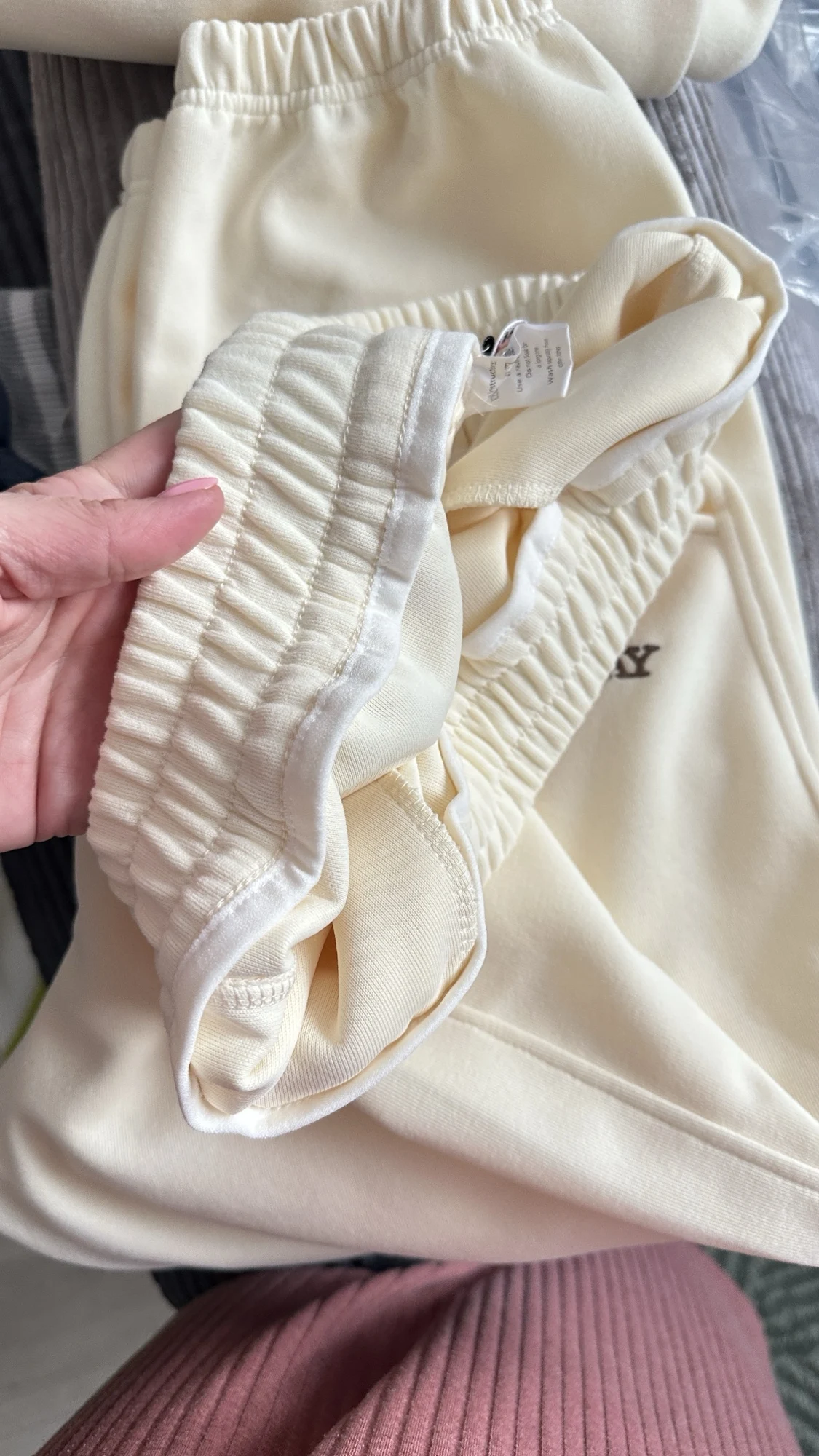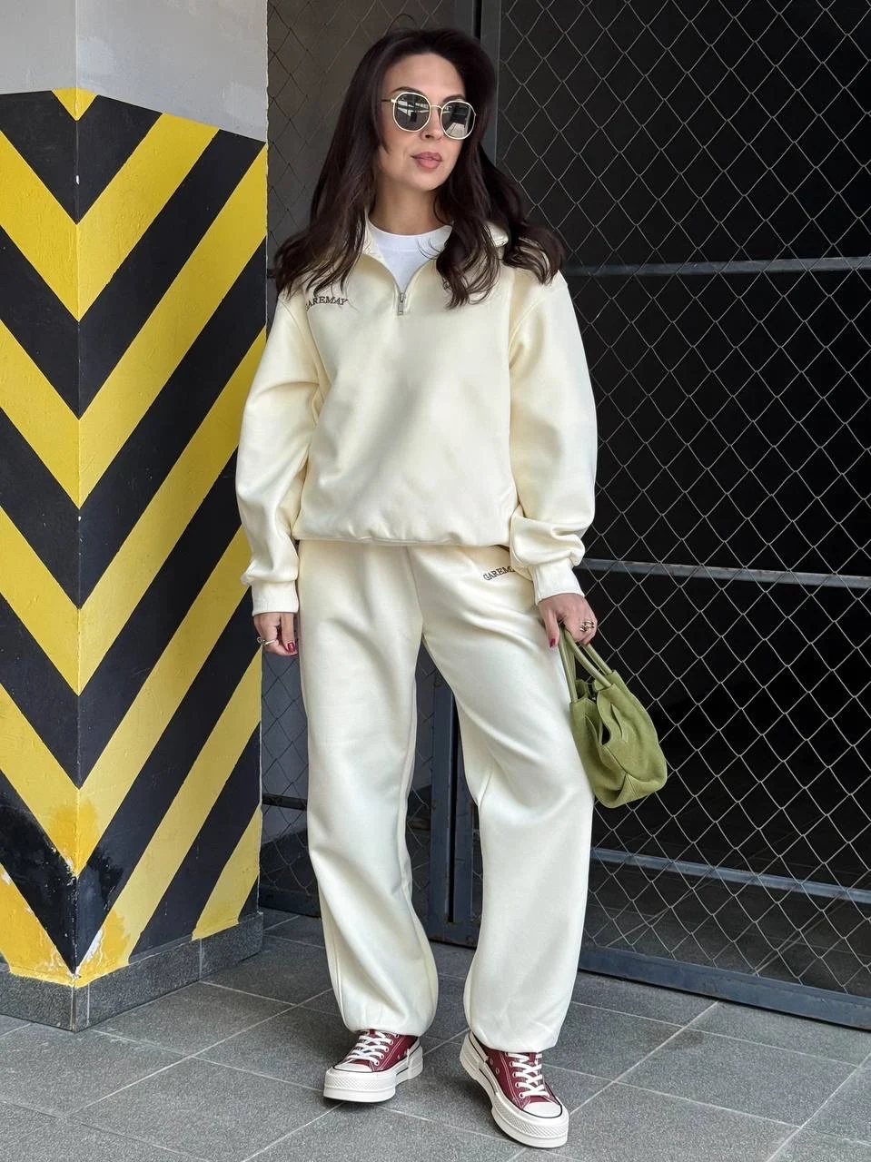 Спортивный костюм в цвете сливочного масла. Безумно понравился цвет! Очень здорово освежает) На мои параметры 80/62/93, рост 165 см размер S сел достаточно свободно. Есть запас под большие параметры, в том числе и по росту. Состав внешнего материала: 80% хлопок, 20% полиэстер. Внутренний: 97% полиэстер, 3% спандекс. Костюм без утепления, но материал плотный, держит форму. Качество хорошее.