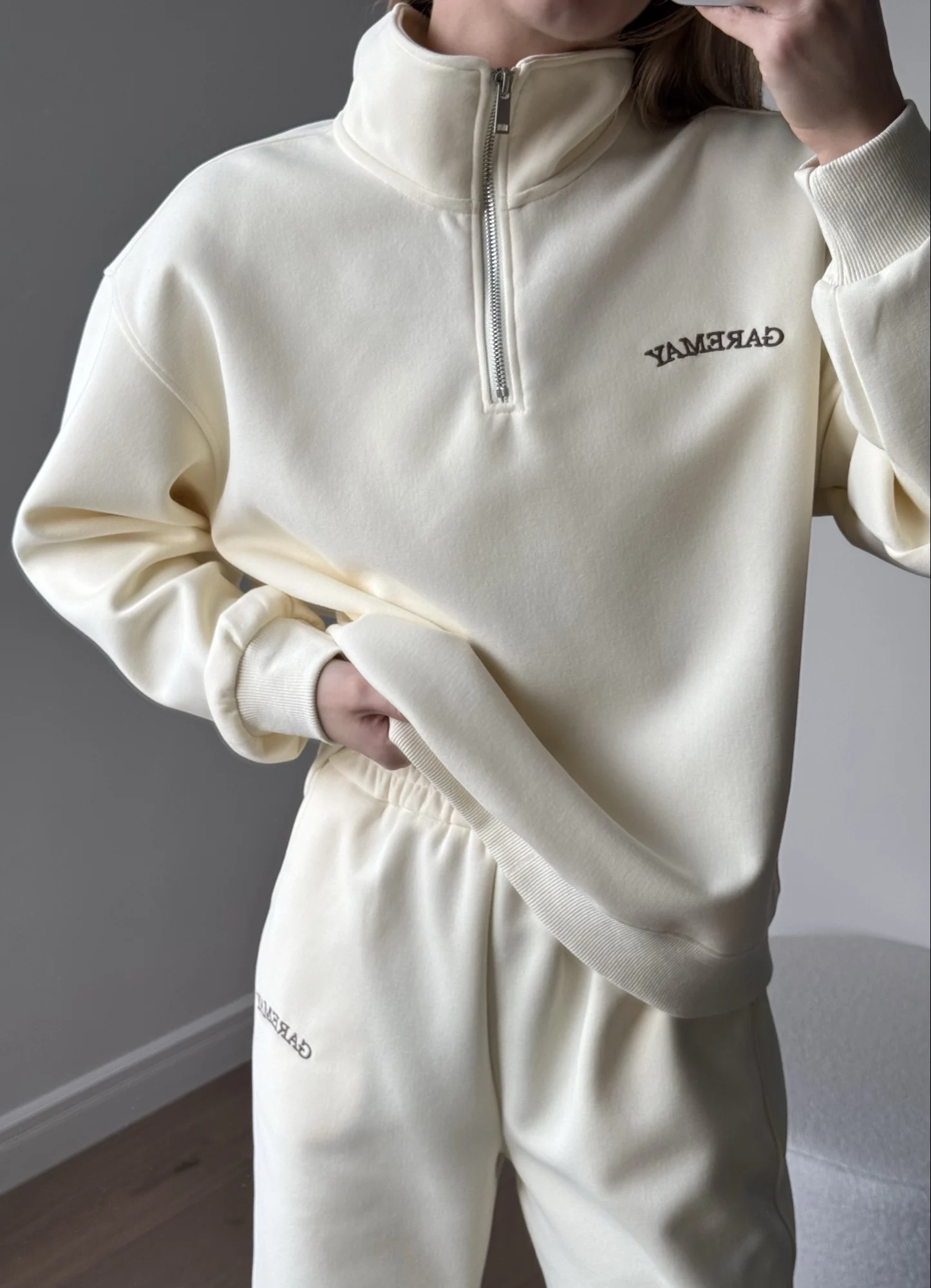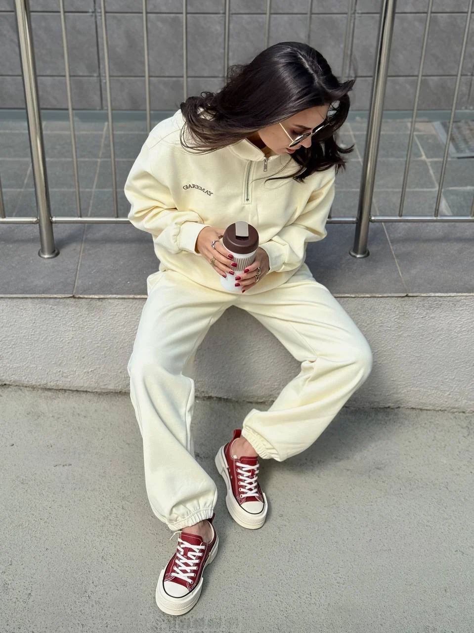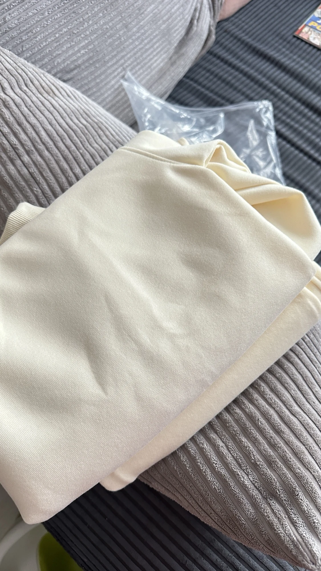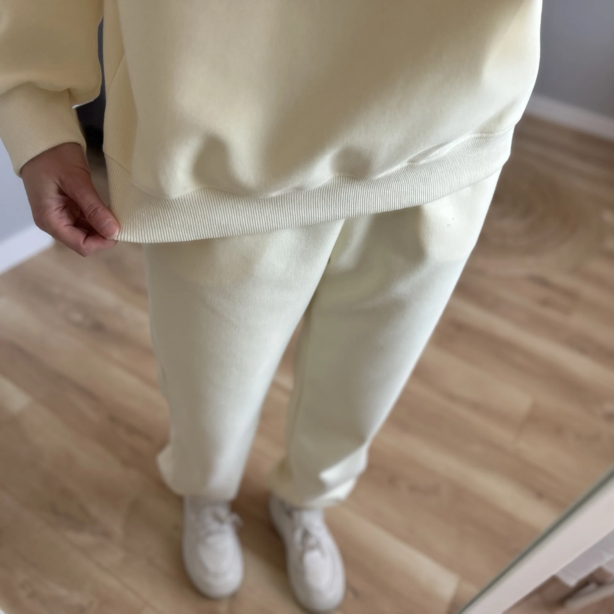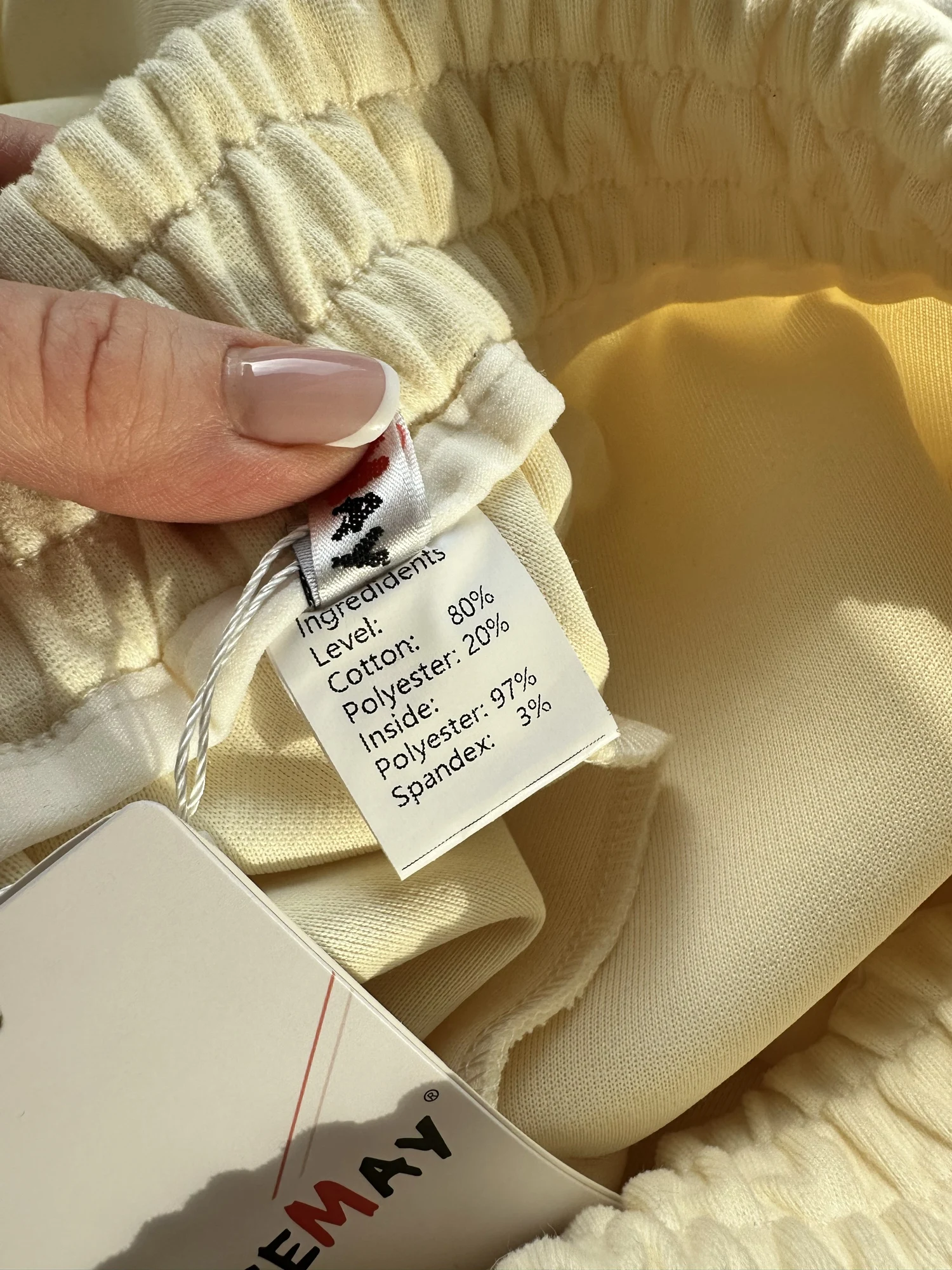 Спортивный костюм в цвете сливочного масла. Безумно понравился цвет! Очень здорово освежает) На мои параметры 80/62/93, рост 165 см размер S сел достаточно свободно. Есть запас под большие параметры, в том числе и по росту. Состав внешнего материала: 80% хлопок, 20% полиэстер. Внутренний: 97% полиэстер, 3% спандекс. Костюм без утепления, но материал плотный, держит форму. Качество хорошее.