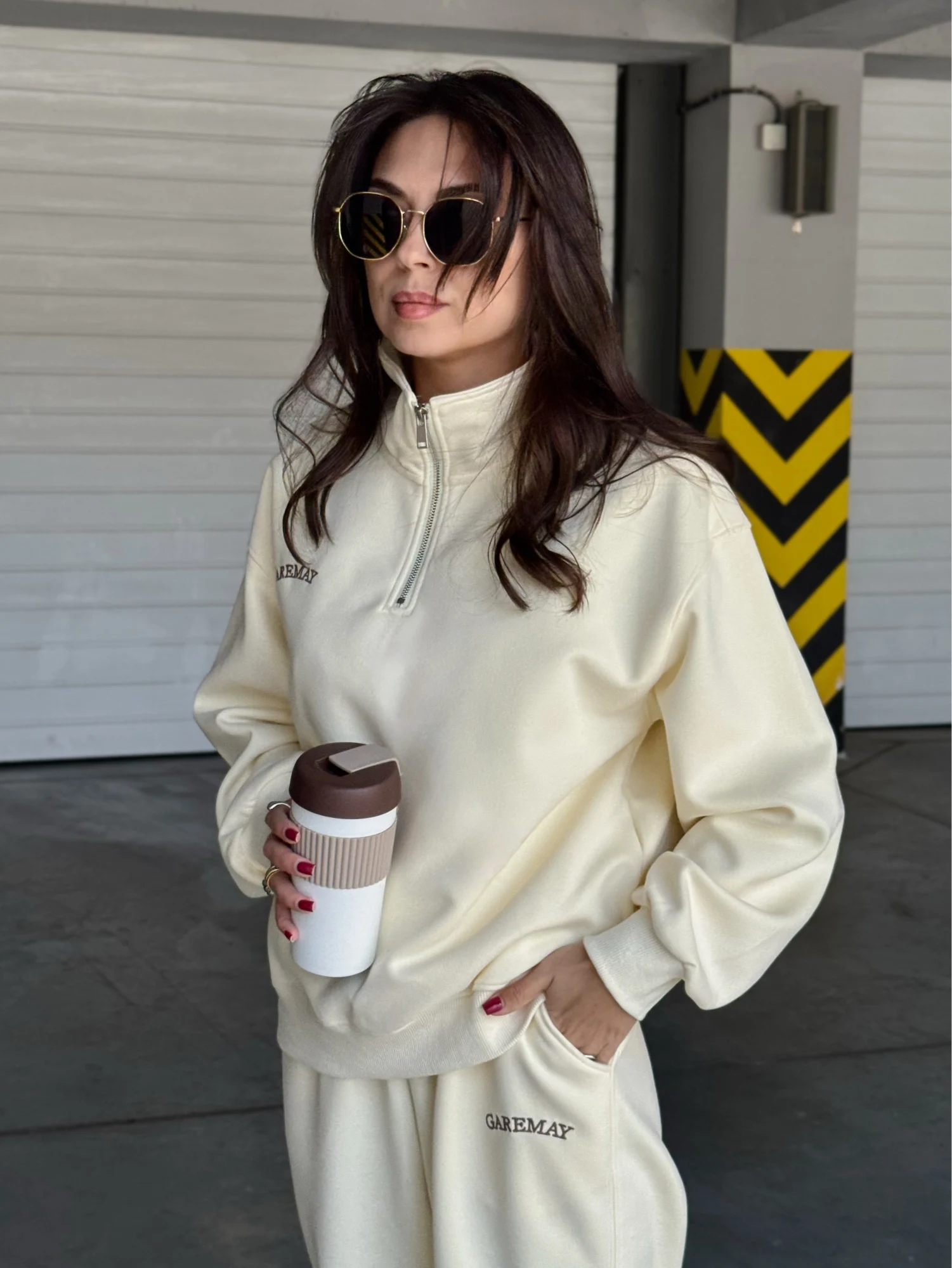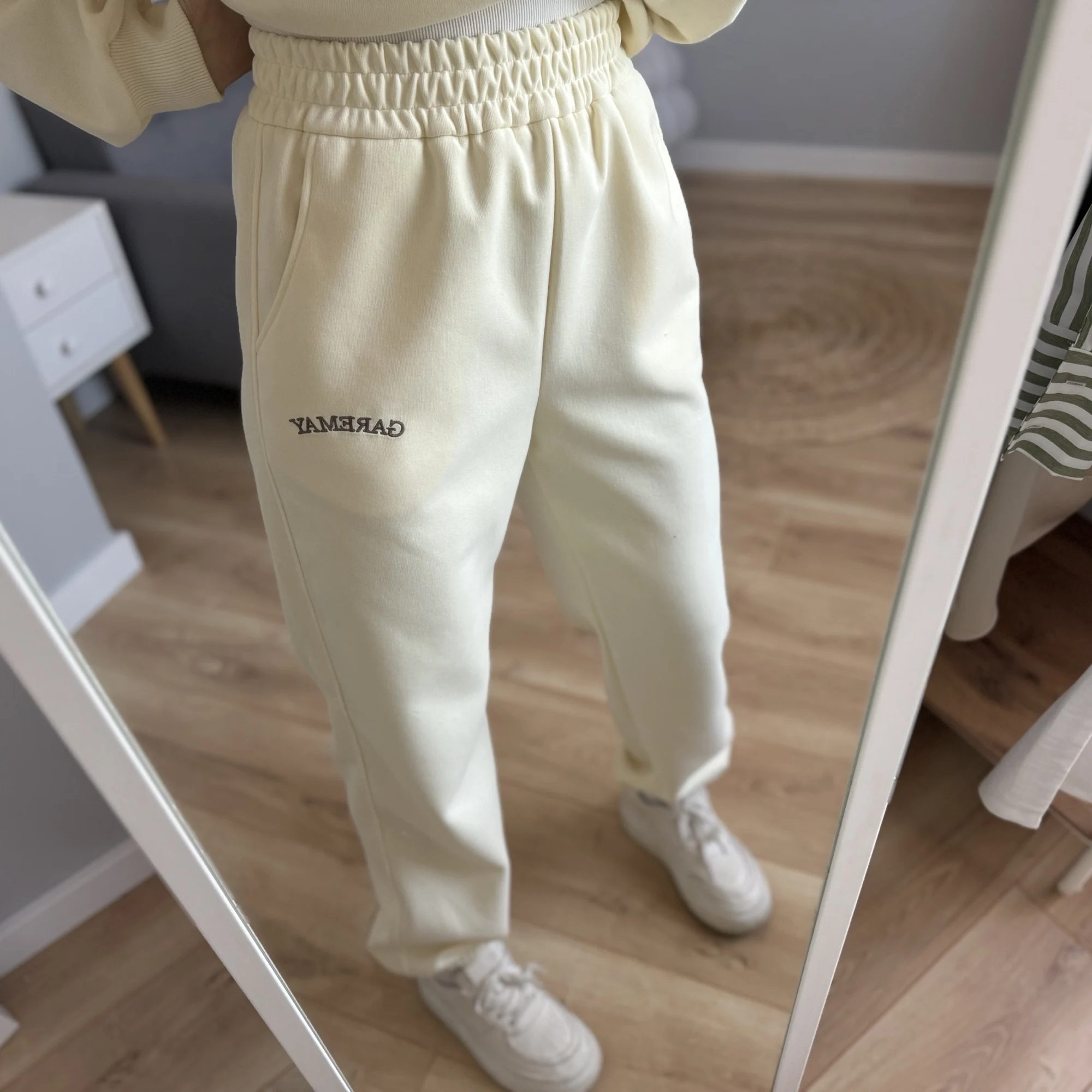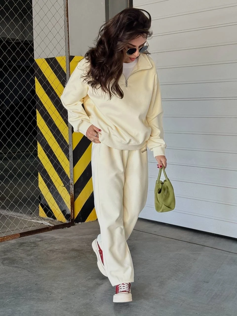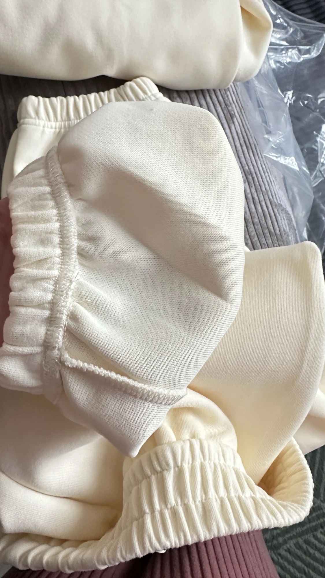 Спортивный костюм в цвете сливочного масла. Безумно понравился цвет! Очень здорово освежает) На мои параметры 80/62/93, рост 165 см размер S сел достаточно свободно. Есть запас под большие параметры, в том числе и по росту. Состав внешнего материала: 80% хлопок, 20% полиэстер. Внутренний: 97% полиэстер, 3% спандекс. Костюм без утепления, но материал плотный, держит форму. Качество хорошее.