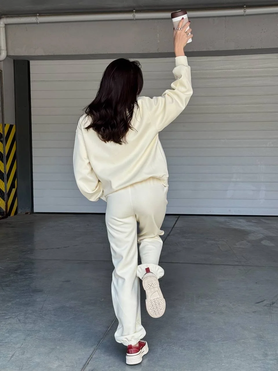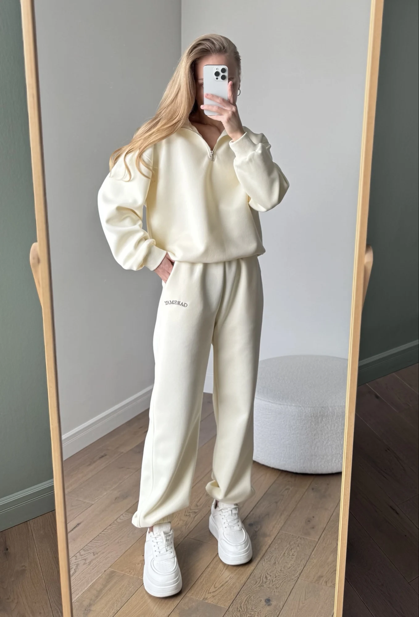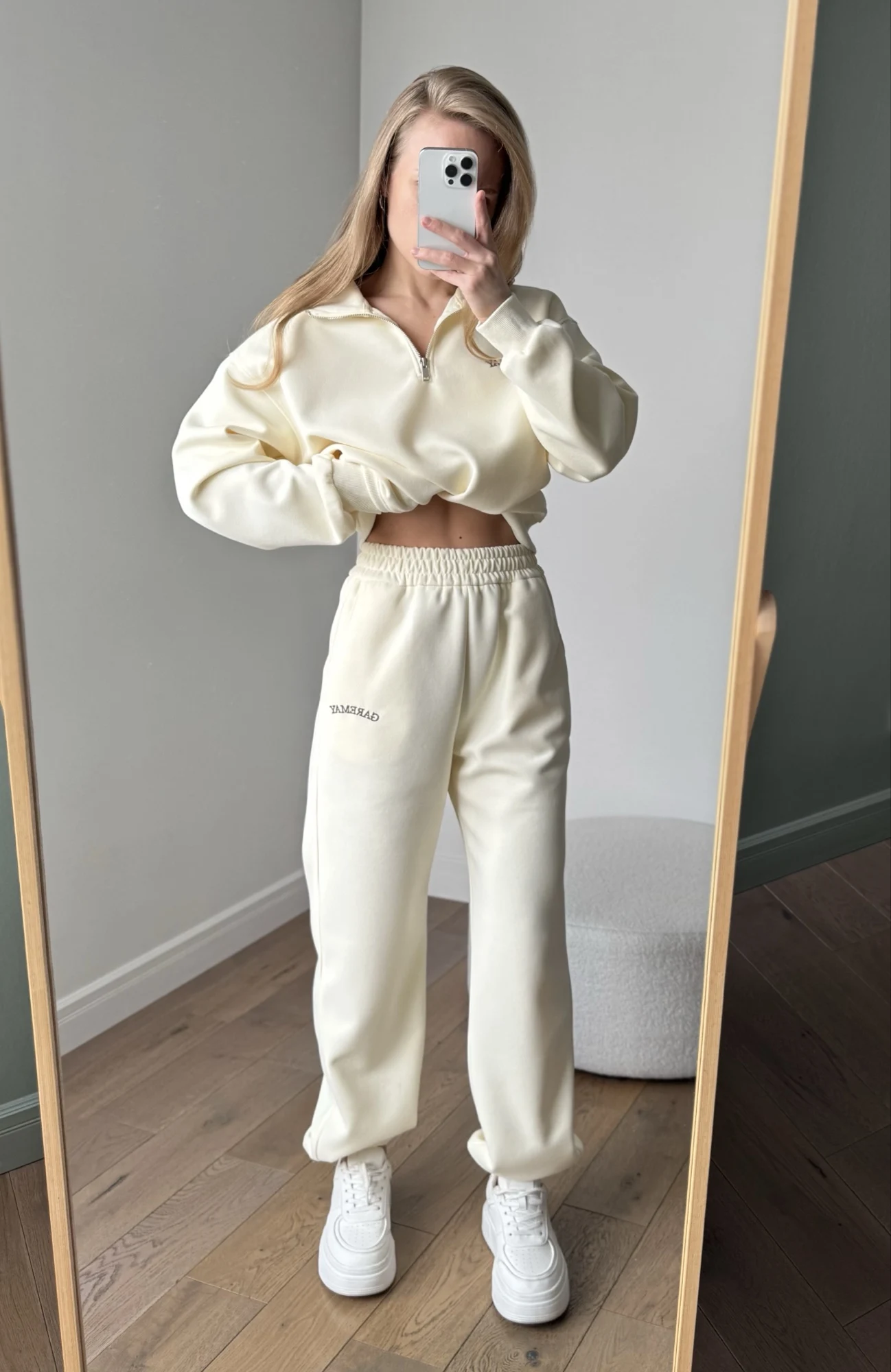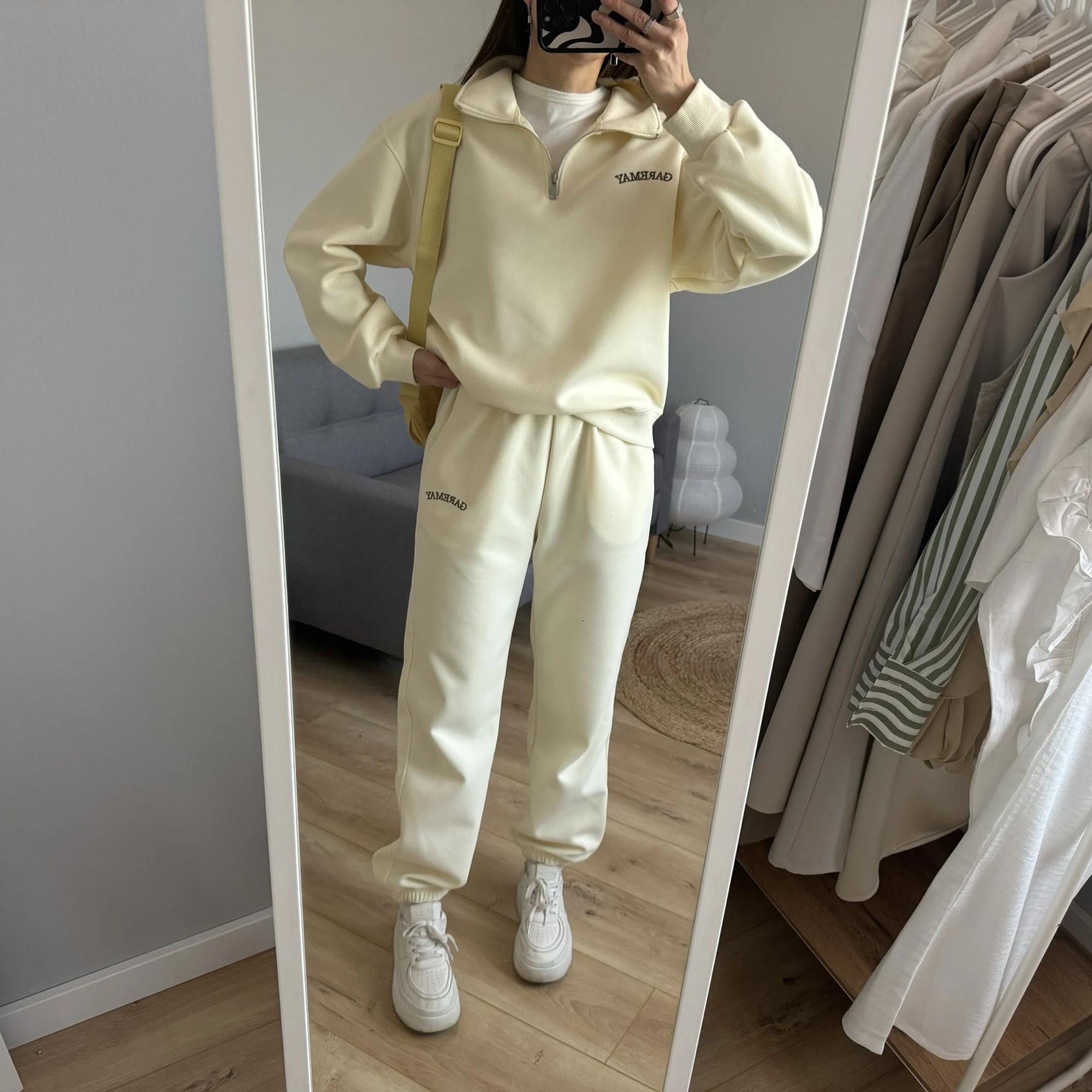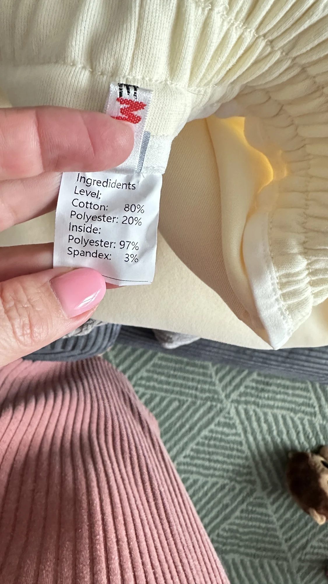 Спортивный костюм в цвете сливочного масла. Безумно понравился цвет! Очень здорово освежает) На мои параметры 80/62/93, рост 165 см размер S сел достаточно свободно. Есть запас под большие параметры, в том числе и по росту. Состав внешнего материала: 80% хлопок, 20% полиэстер. Внутренний: 97% полиэстер, 3% спандекс. Костюм без утепления, но материал плотный, держит форму. Качество хорошее.