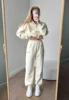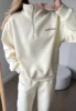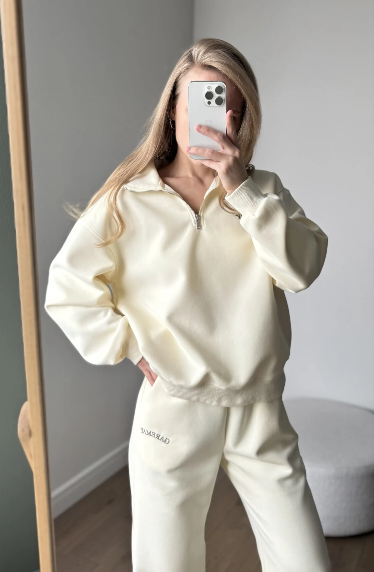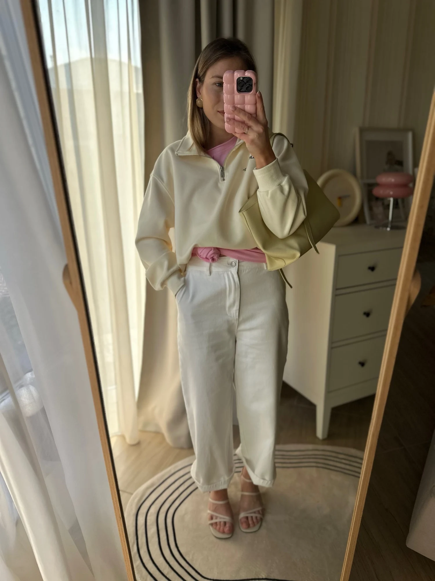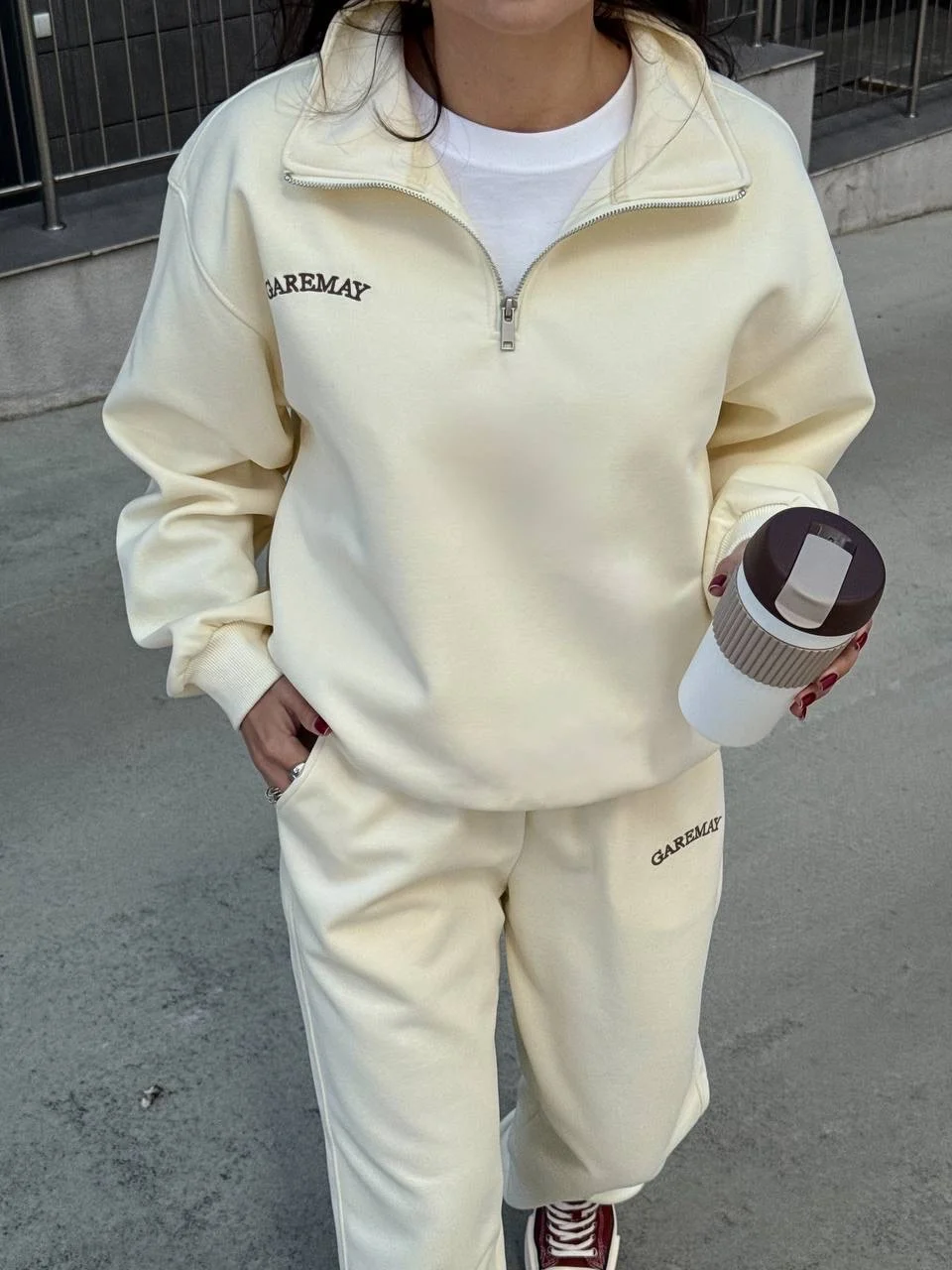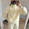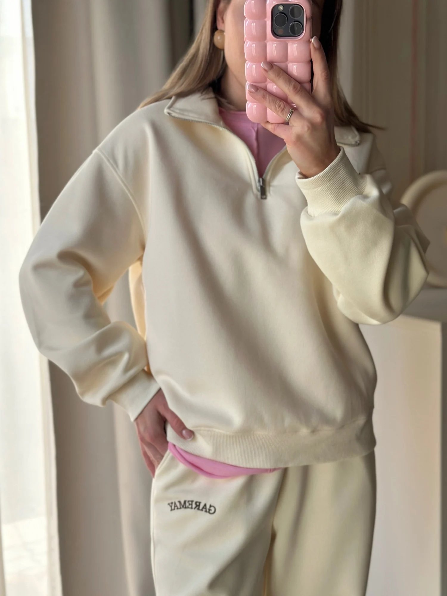 Спортивный костюм в цвете сливочного масла. Безумно понравился цвет! Очень здорово освежает) На мои параметры 80/62/93, рост 165 см размер S сел достаточно свободно. Есть запас под большие параметры, в том числе и по росту. Состав внешнего материала: 80% хлопок, 20% полиэстер. Внутренний: 97% полиэстер, 3% спандекс. Костюм без утепления, но материал плотный, держит форму. Качество хорошее.