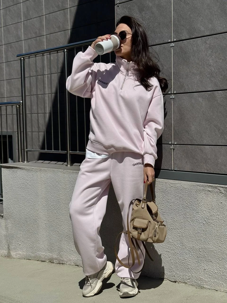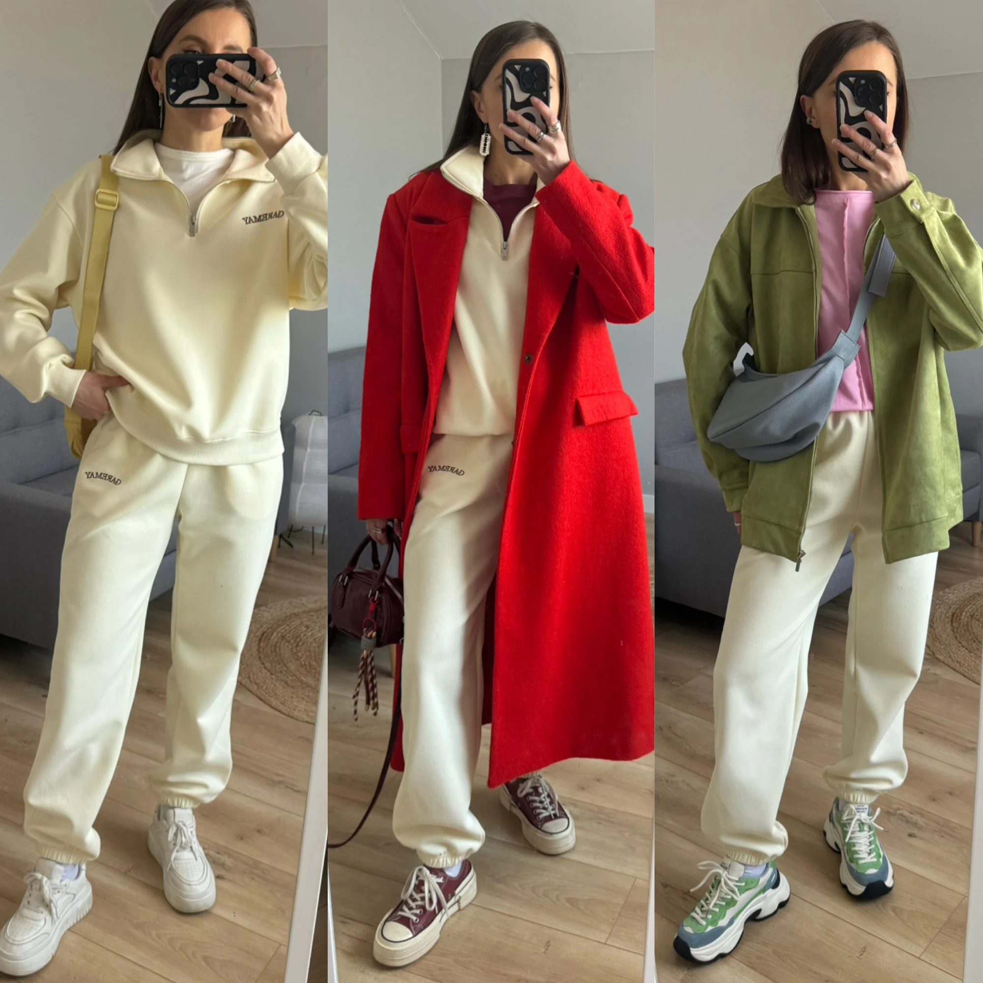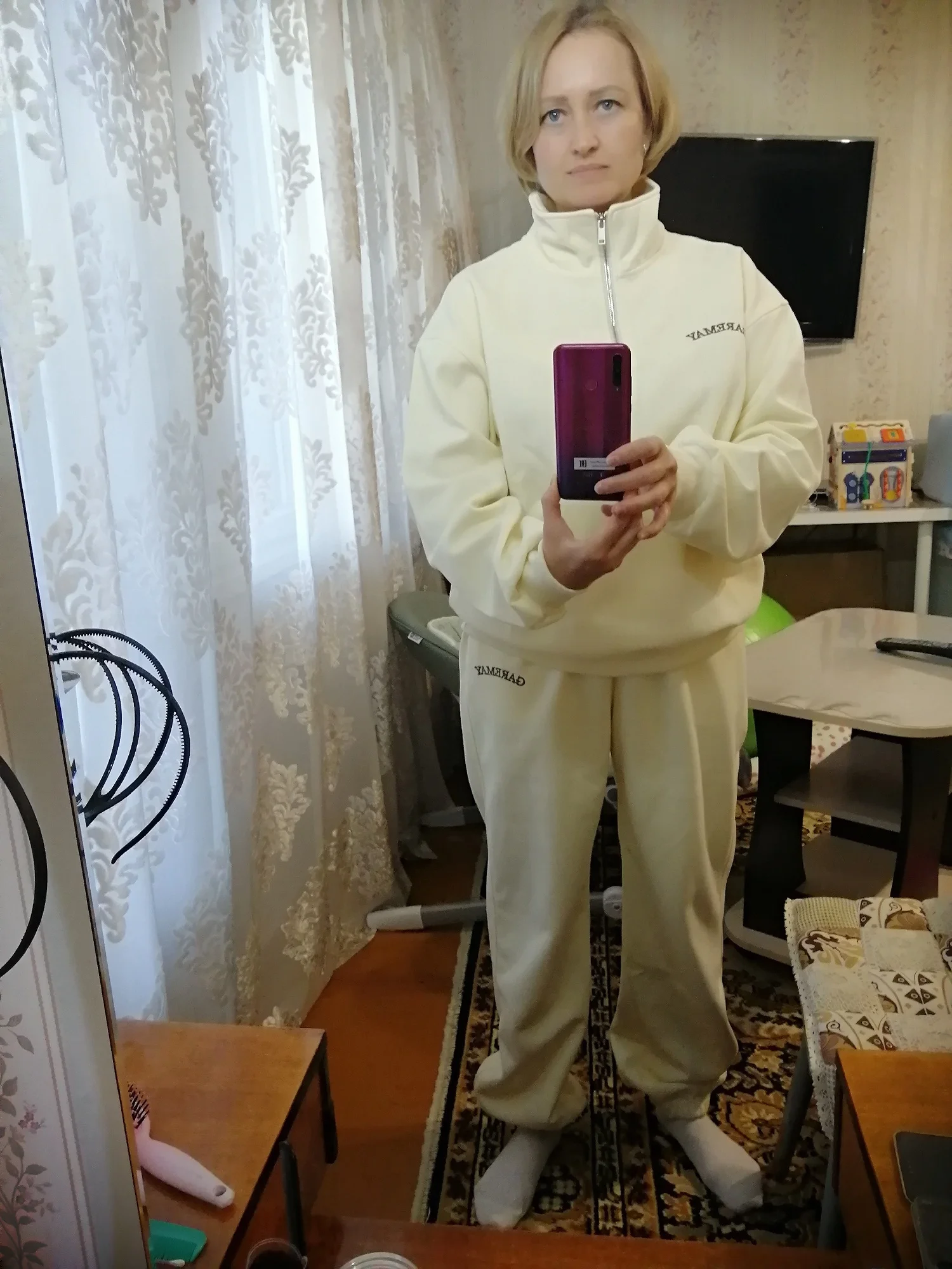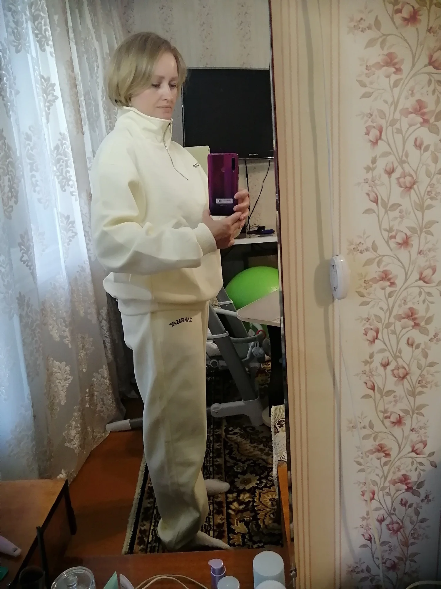Трикотажный спортивный костюм На свои параметры 88/66/88 см, грудь 75С и рост 160 см брала костюм в размере S. По объемам и длине хороший запас - подойдет и на высокий рост. На свой рост брюки подворачиваю резинкой во внутрь - так лучше смотрится и мне более комфортно. Мне брюки длинные, без подворота внизу сборят. Состав: 80% хлопок, 20% полиэстер. Не утепленный, но теплый. Очень мягкий и комфортный. У свитшота горловина-стойка на замке. Брюки джоггеры с резинкой внизу штанин. Имеют глубокие боковые карманы. Пояс на резинке, не давит, очень комфортная посадка. У костюма в светло-желтом цвете вышивка лого бренда в коричневом («кофе с молоком») цвете, а у светло-розового костюма - вышивка лого в черном цвете. Мой любимый спортивный костюм! Ношу его круглогодично - и летом, и зимой (с термобельем, конечно). Мой костюм в цвете «меланж» уже точно пережил 100 стирок - качество ткани превосходное - остался первоначальный вид и состояние, без катышков! Материал у костюмов потрясающий - на ощупь бархатистый и тактильно есть схожесть с велюром. В общем, рекомендую!