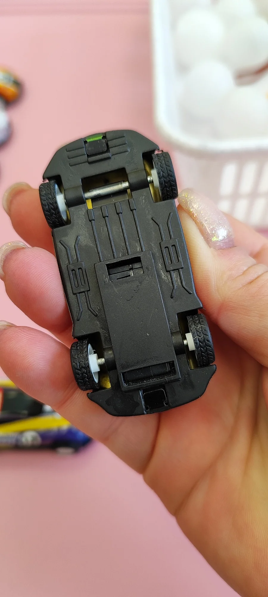 Здравствуйте. На скрине есть цена за которую этот товар мне достался. Машинка не хрупкая. Ребенок(полтора года) не выпускает её из рук. Она прошла все краш-тесты и, как видно по фото-не пострадала. Колеса: шина не снимается и это +! Корпус не снимается и, это тоже плюс! Пластик мегакрепкий, выдержал вес ребёнка в 15 кг. Прокрашен! Это не бумажная наклейка, как у многих продавцов, а качественно прокрашеный пластик! В общем рекомендую. Купила бы такую рублей за сто. Но тут достался, практически, даром!