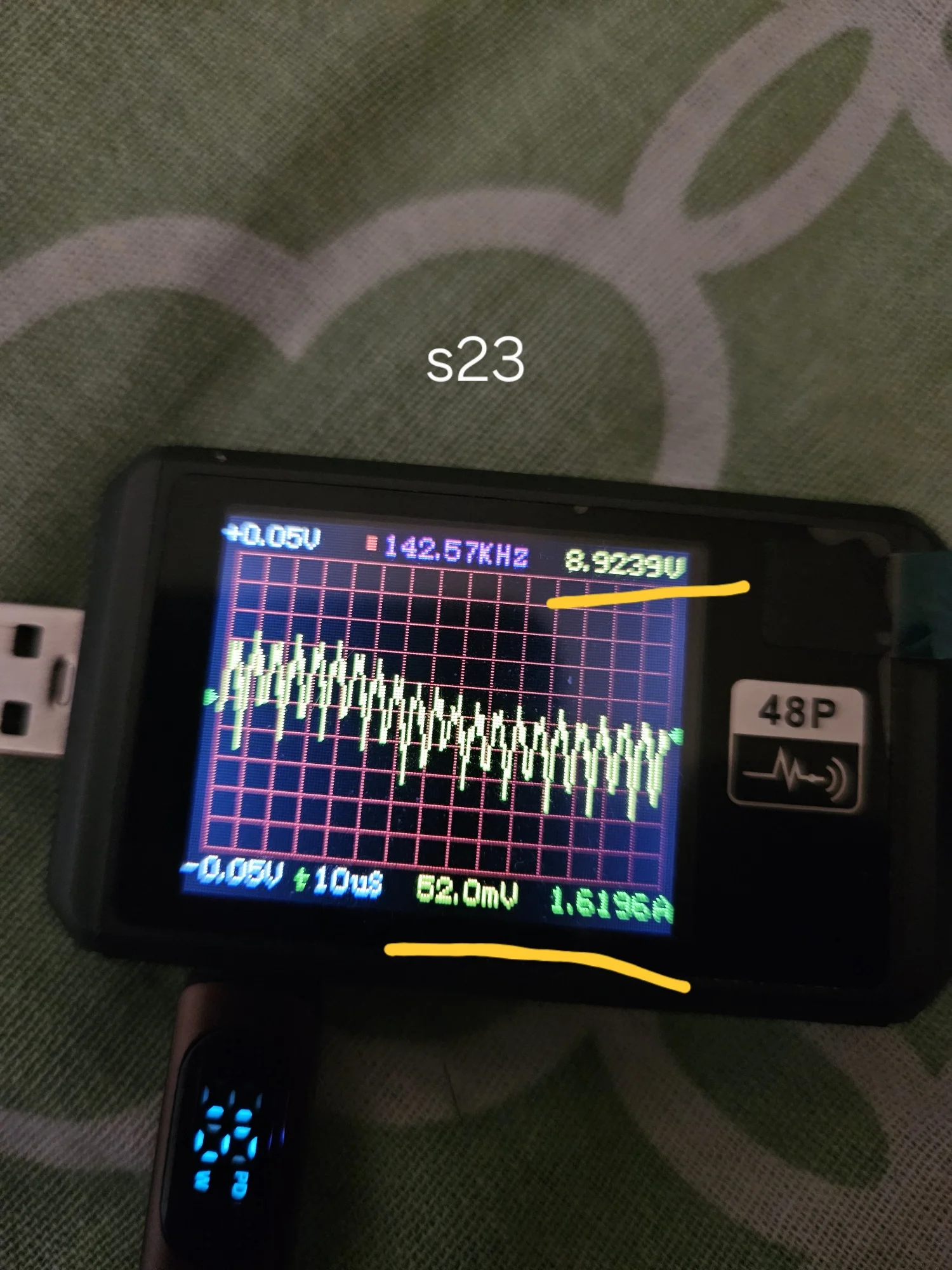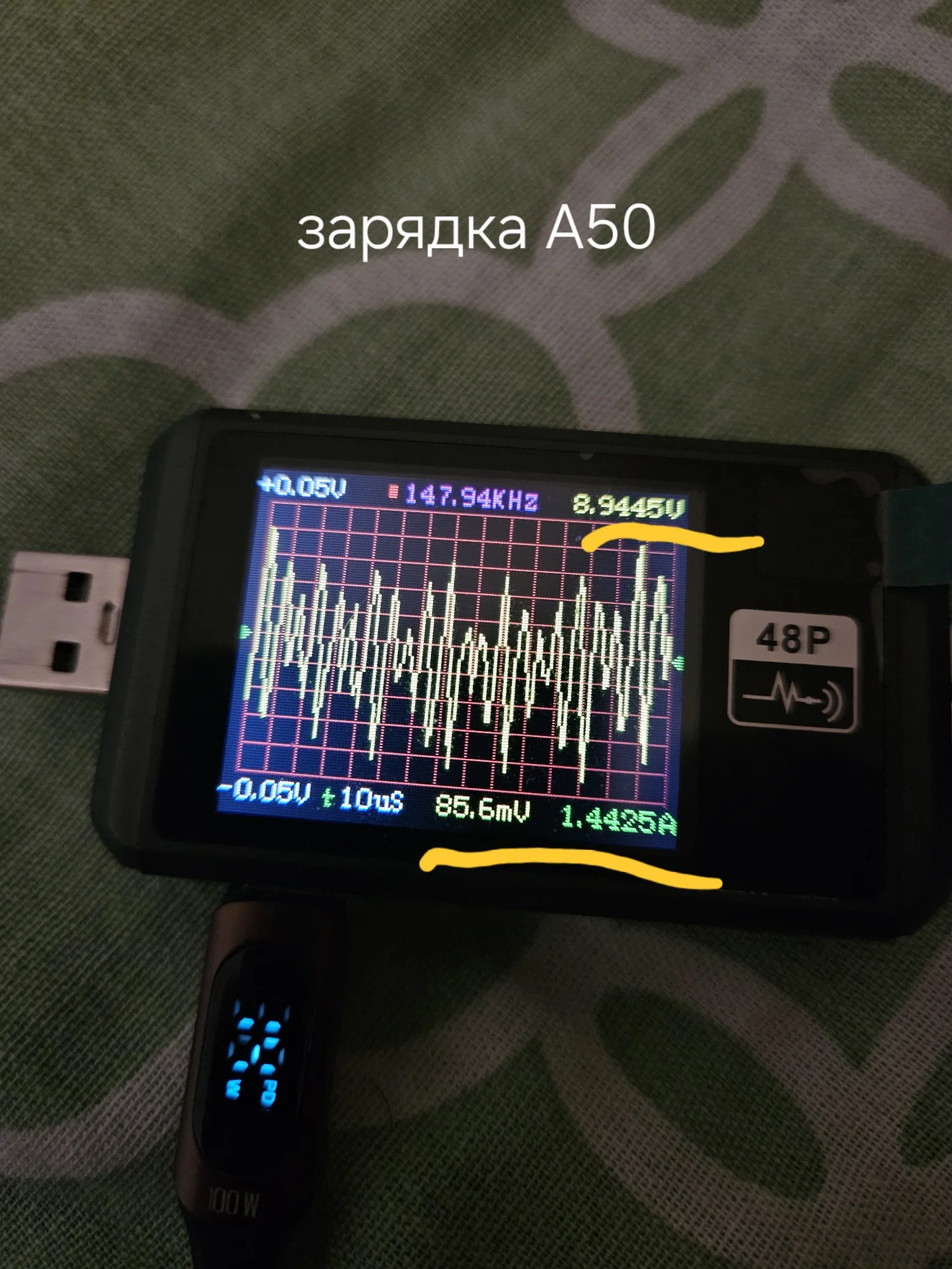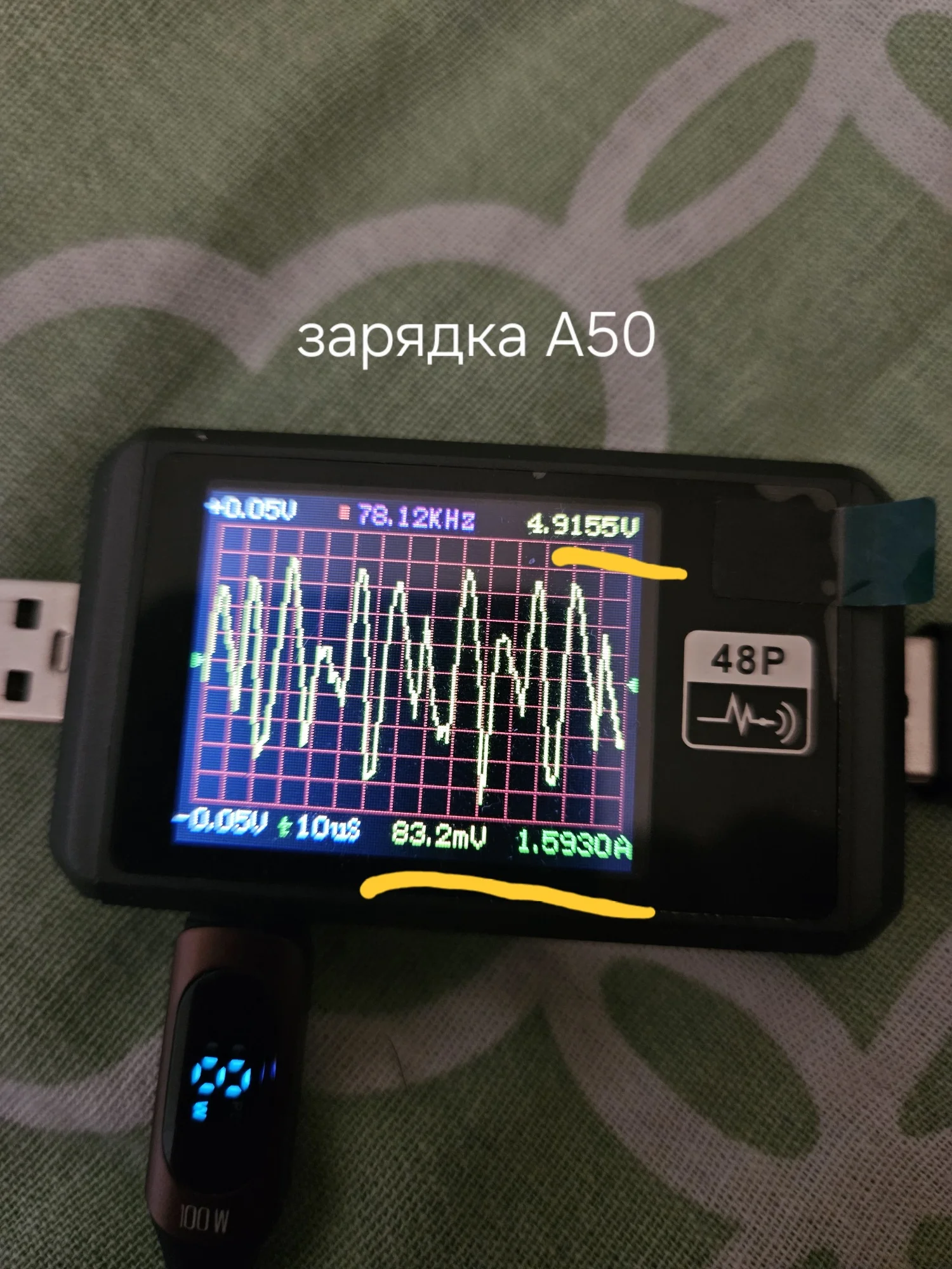Здравствуйте. При одновременной зарядке быстрая зарядка отключается. По пульсациям при зарядке Самсунг S23 график более ровный, стабильный, а у А50 график скачет. Говорят нормой пульсаций является не более 2%, т.е. при 5в это 100 мв, при 9в мв 180. При обоих напряжениях на s 23 около 1% и менее. Тестер конечно не профессиональный, но более менее дает приближенные цифры. Тестер был подключен к блочку не напрямую, а через провод, чтобы исключить помехи