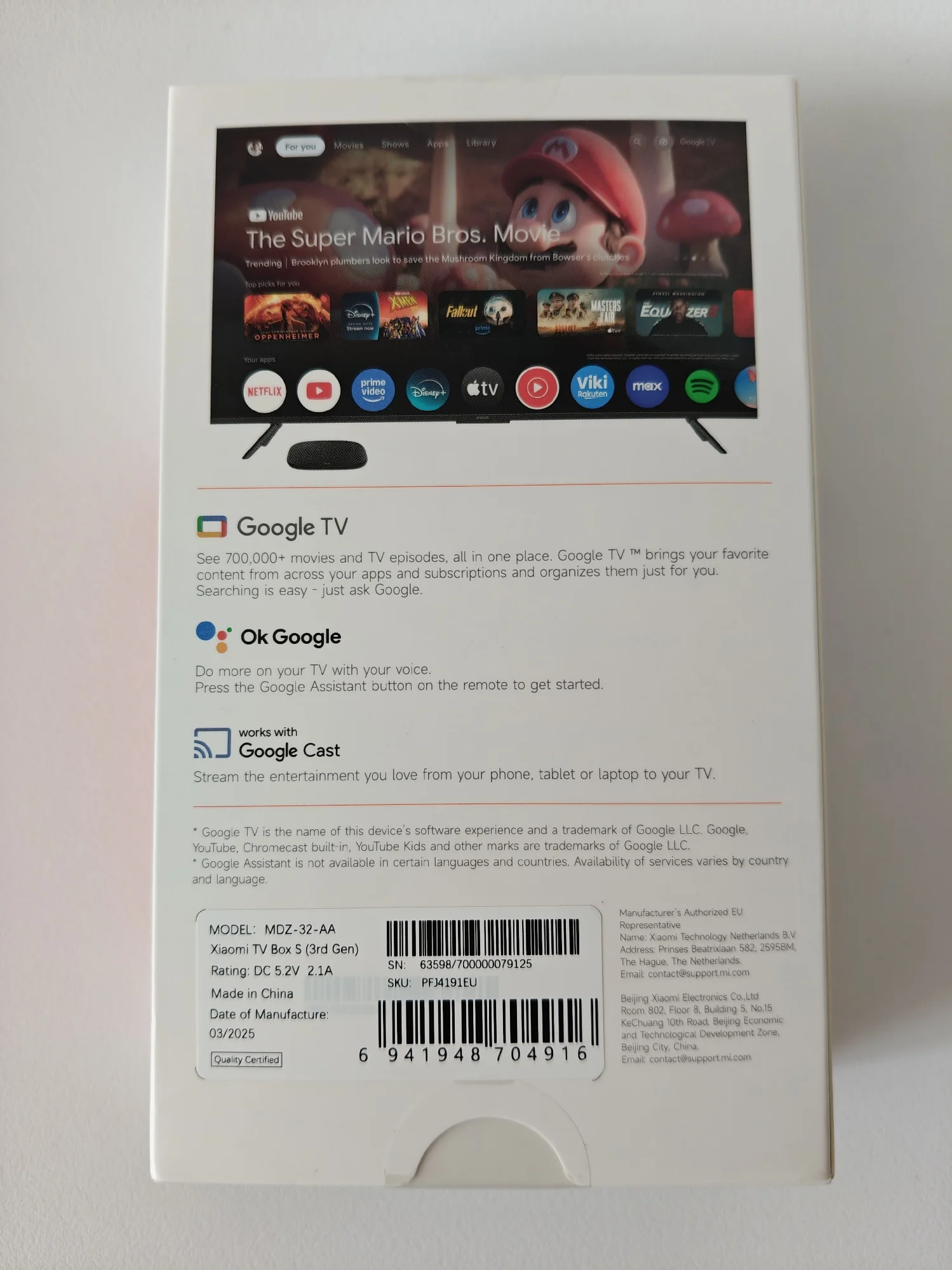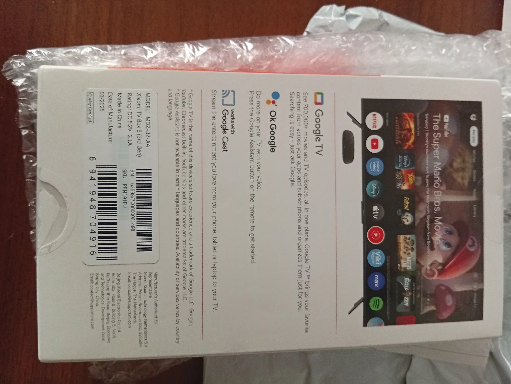 Отличное обновление легендарной приставки от Xiaomi. Новенькое третье поколение Box S. Неповторимое соотношение цены к параметрам и качеству (железо, софт и долгая поддержка). Новейший процессор AmLogic S905X5M. Весомая прибавка мощности, которая реально ощущается. Обновление WiFi с 5 до 6 версии. Очень нужное расширение памяти с 8 до 32Гб. Новейшая система Google TV на основе андроид 14. В системе сильно больше настроек экрана и вариантов как и что делать с картинкой, чем во 2 поколении. В работе ощутимо шустрее при 4к картинке. Пульт и блок питания такие же как во 2 поколении. Сама приставка чуть компактнее и более зализала, теперь без граней и углов. В общем отличный выбор за свои деньги, за сертифицированный аппарат с поддержкой всех последних стандартов. Один из лучших проверенных продавцов с быстрой отправкой.Svyatoslav P. 12 апреля 2025