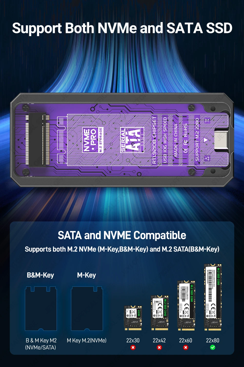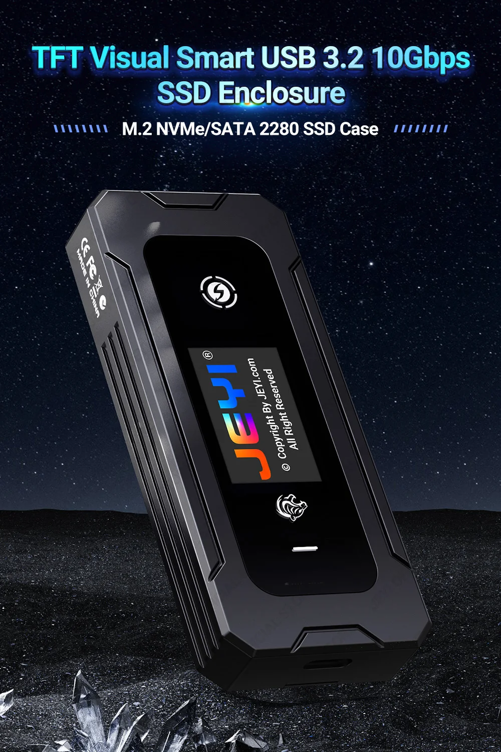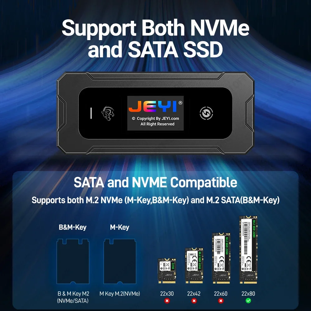 Корпус JEYI Visual Smart M.2 NVMe / SATA SSD, USB 3.2 10 Гбит/с, 10 режимов, температура в реальном времени, поддержка M-Key B+M Key UASP