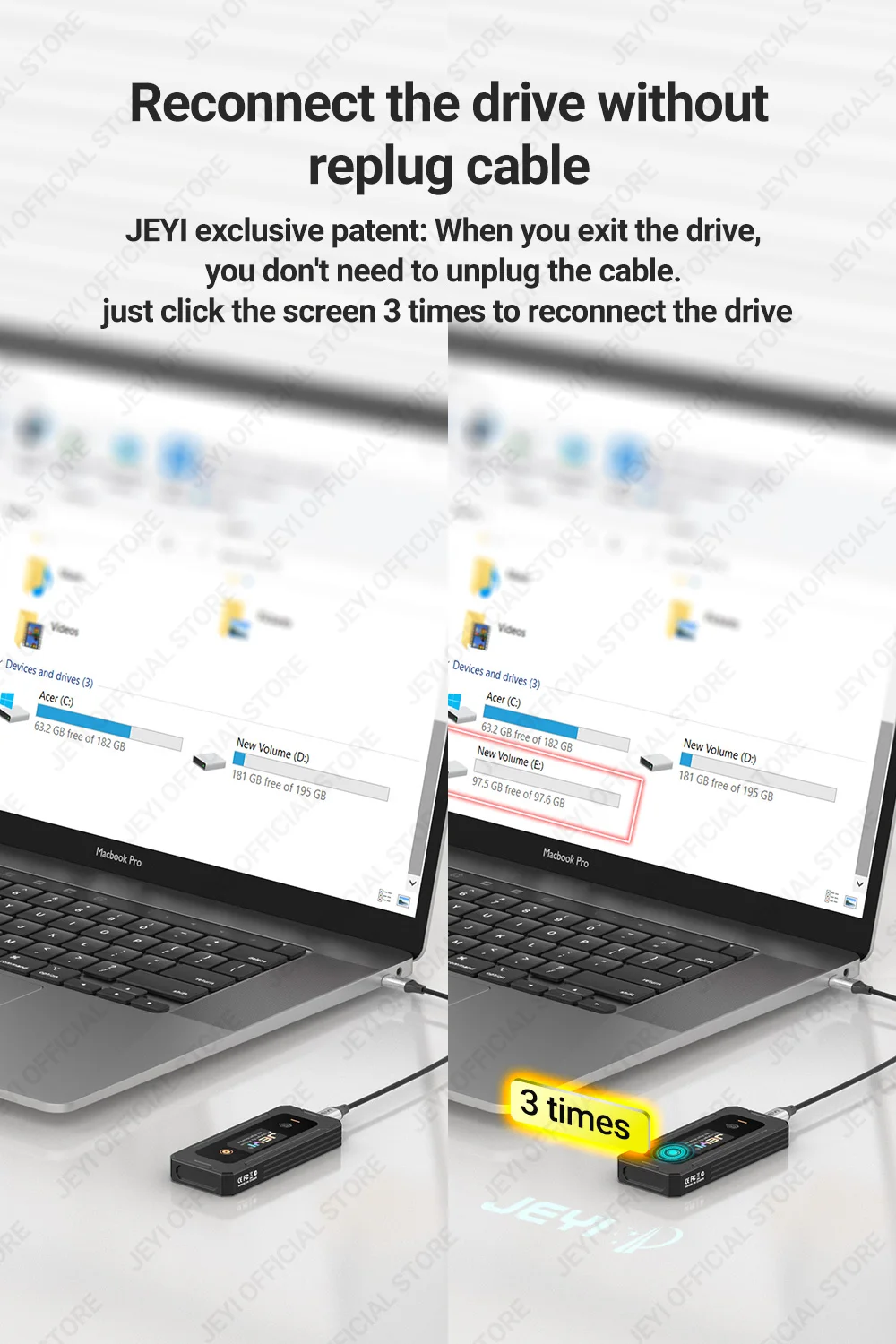 Эксклюзивный патент JEYI: когда вы выходите из диска, вам не нужно отсоединять кабель, просто нажмите на экран 3 раза, чтобы повторно подключить диск.