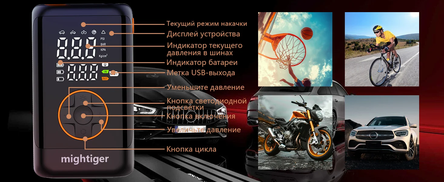 (1) Если аккумулятор устройства достаточно, его можно использовать непосредственно в качестве портативного воздушного насоса.