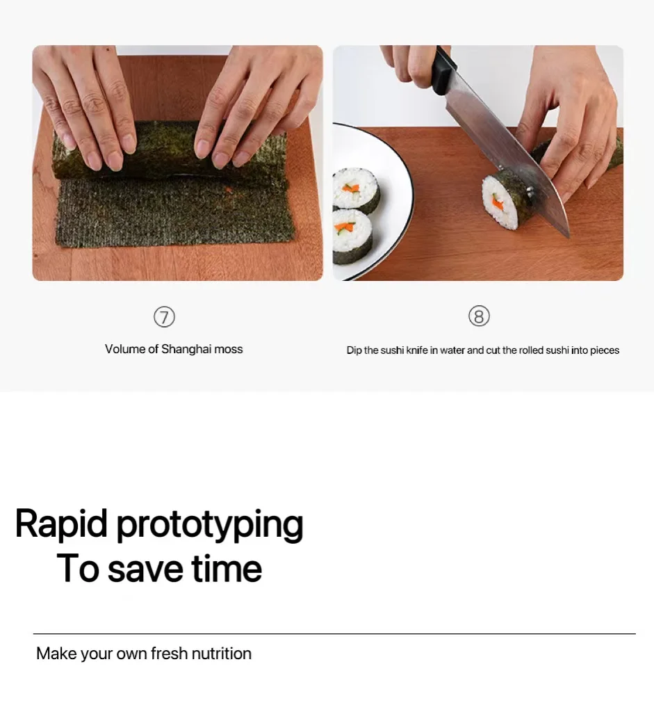 4.Изысканный дизайн: компактный дизайн, простой в использовании, подходит даже для детей, может использоваться для приготовления суши, является идеальным семейным подарком для друзей и новичков, которые любят суши, а также подходит для больших вечеринок.