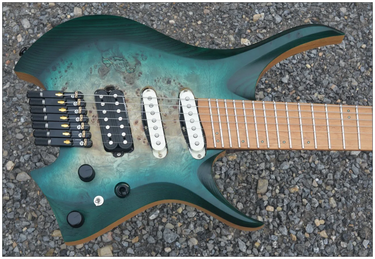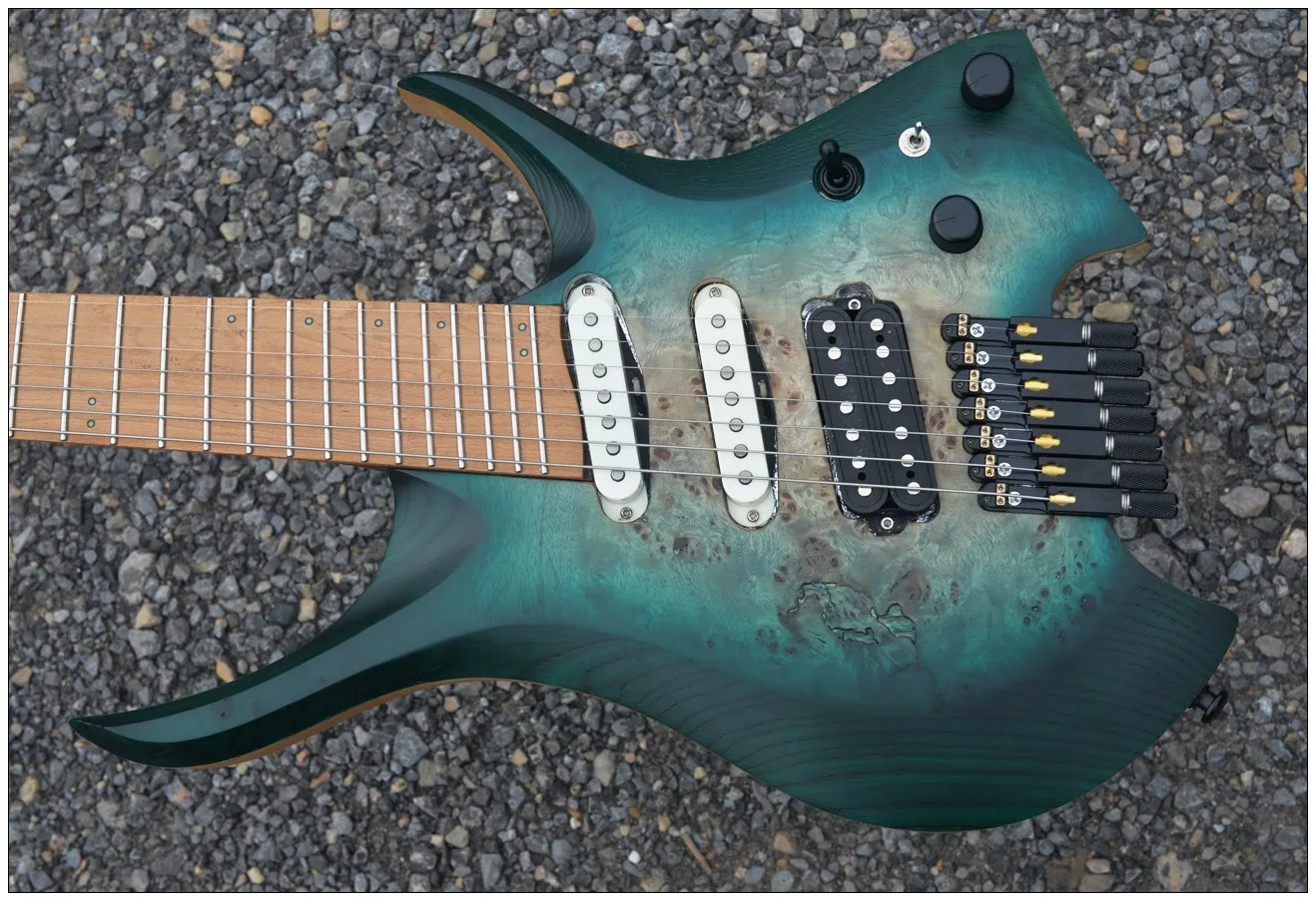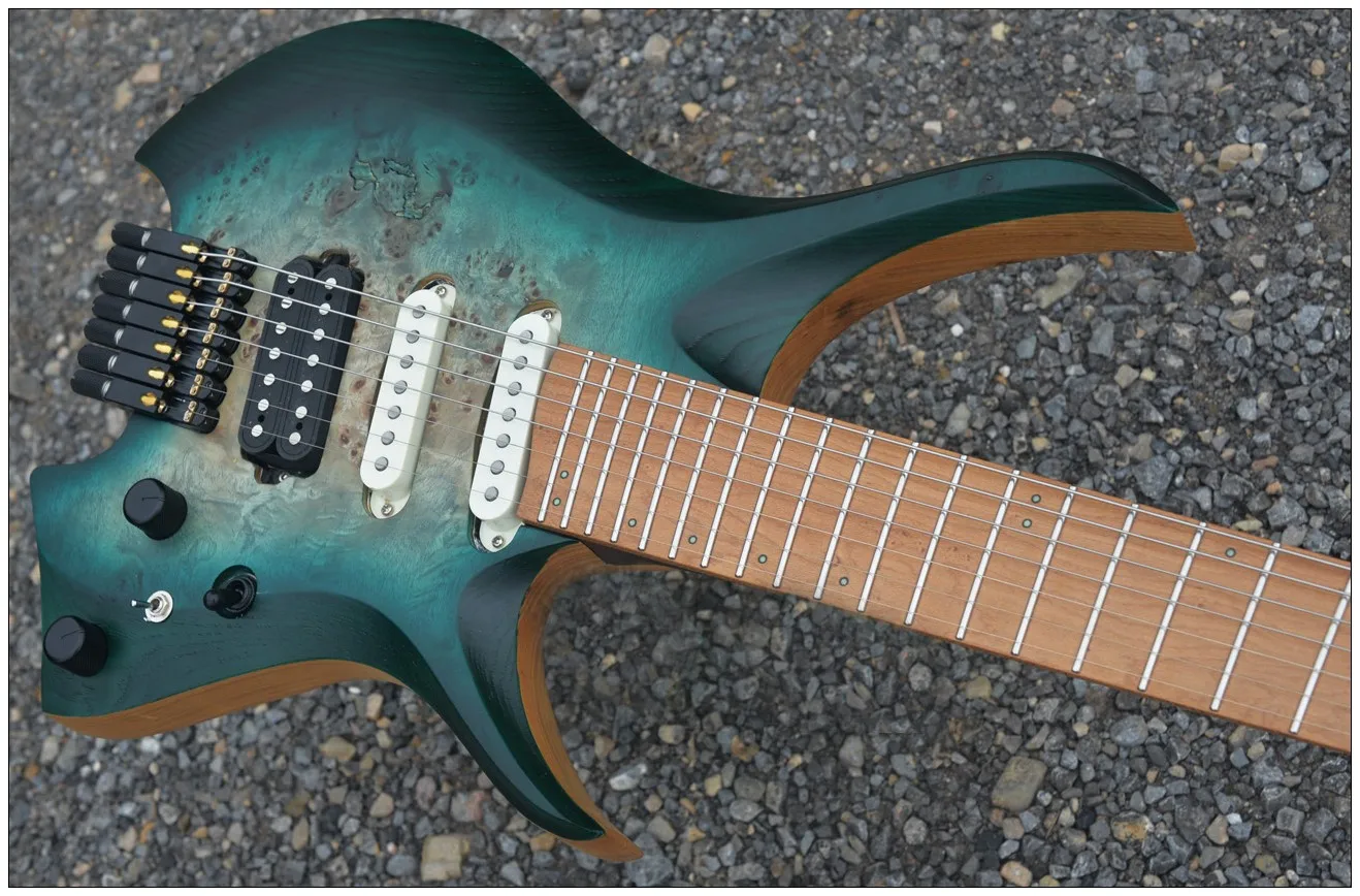 2024 Fanned Лады 7 струн безголовая электрическая гитара зеленый цвет кленовый шейный жареный birdseye кленовый гриф пепельный Древесина венге