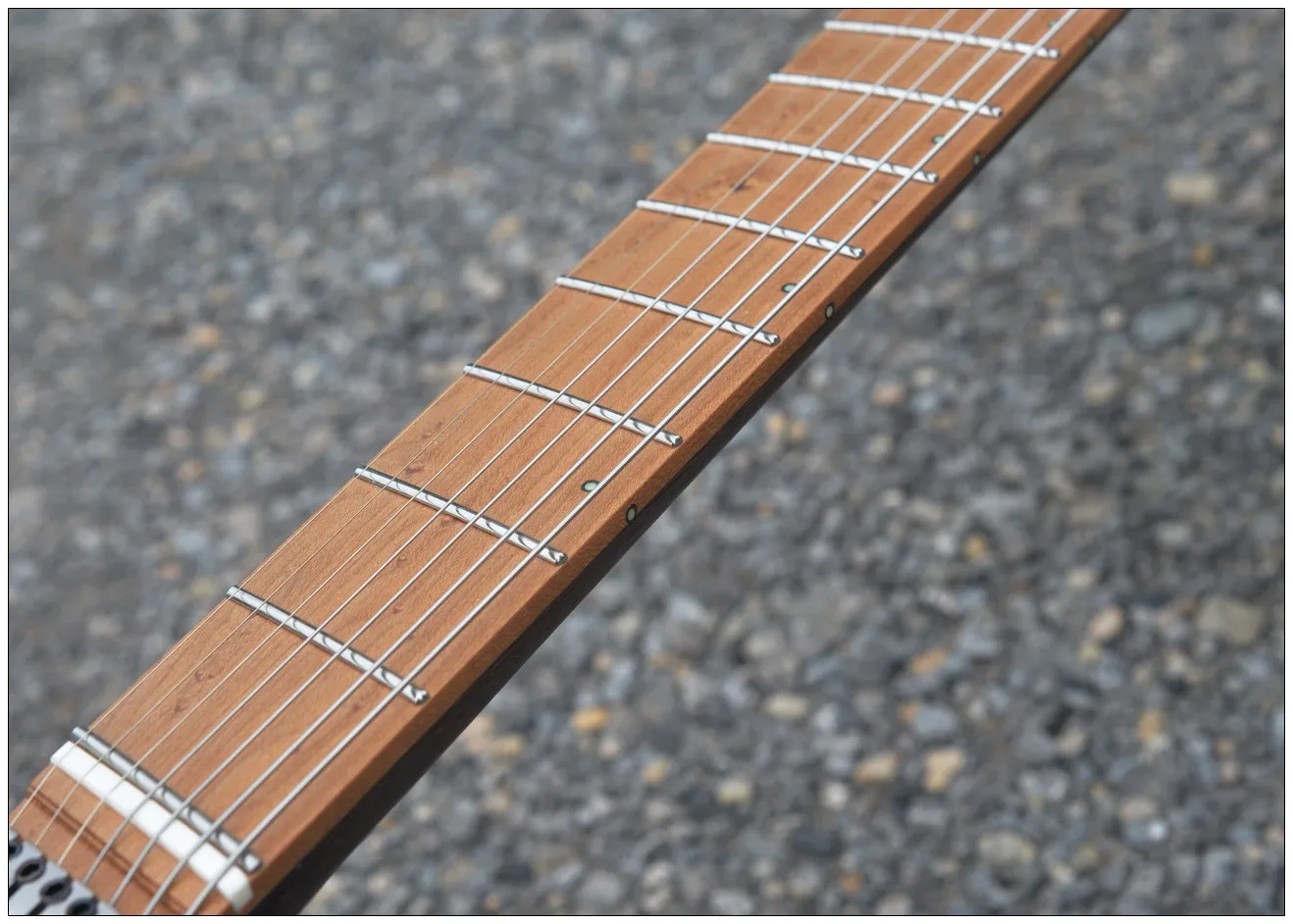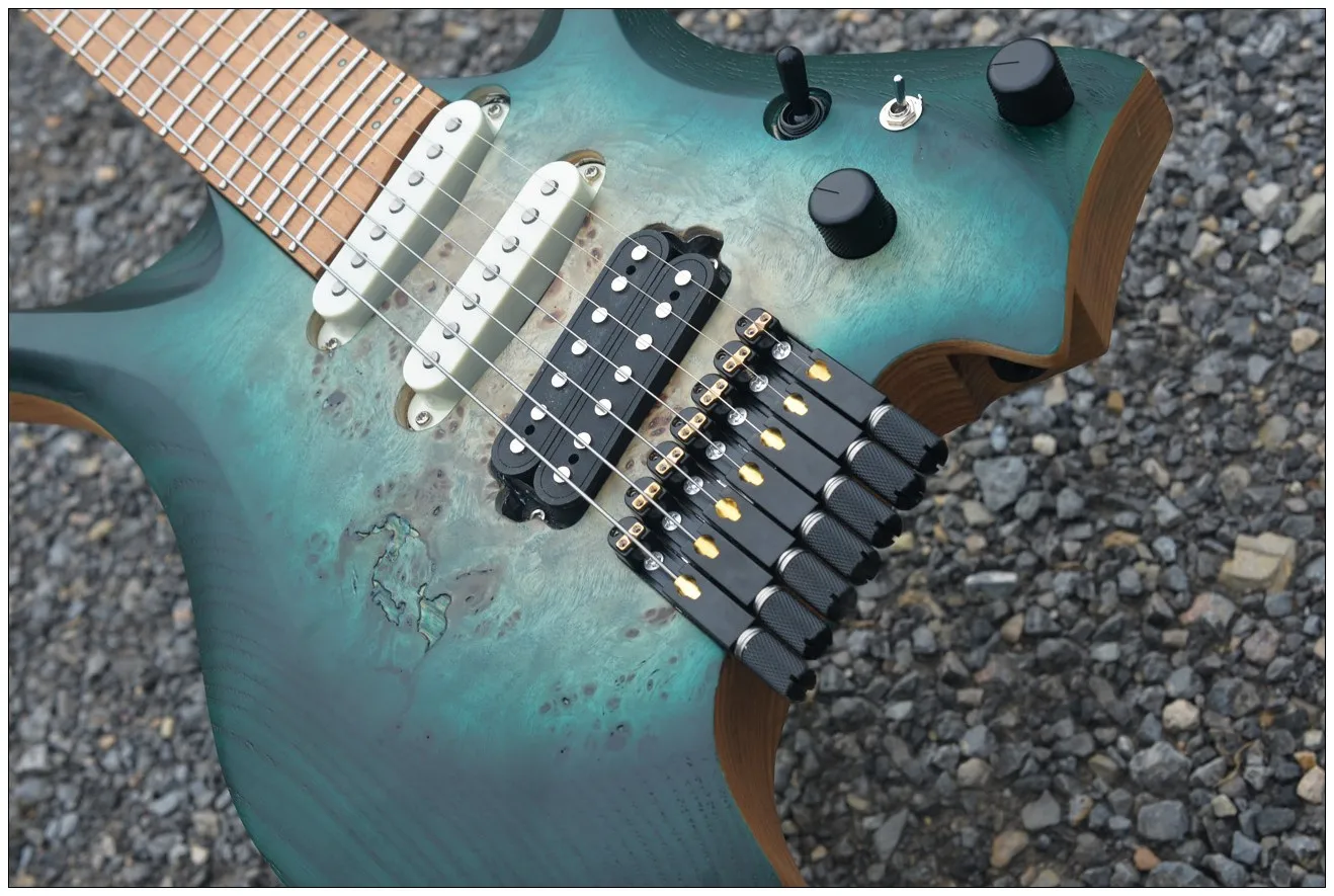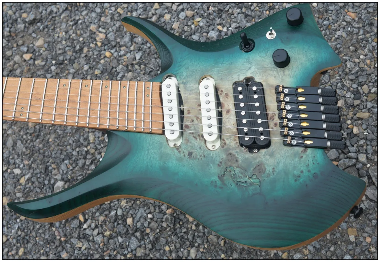 2024 Fanned Лады 7 струн безголовая электрическая гитара зеленый цвет кленовый шейный жареный birdseye кленовый гриф пепельный Древесина венге