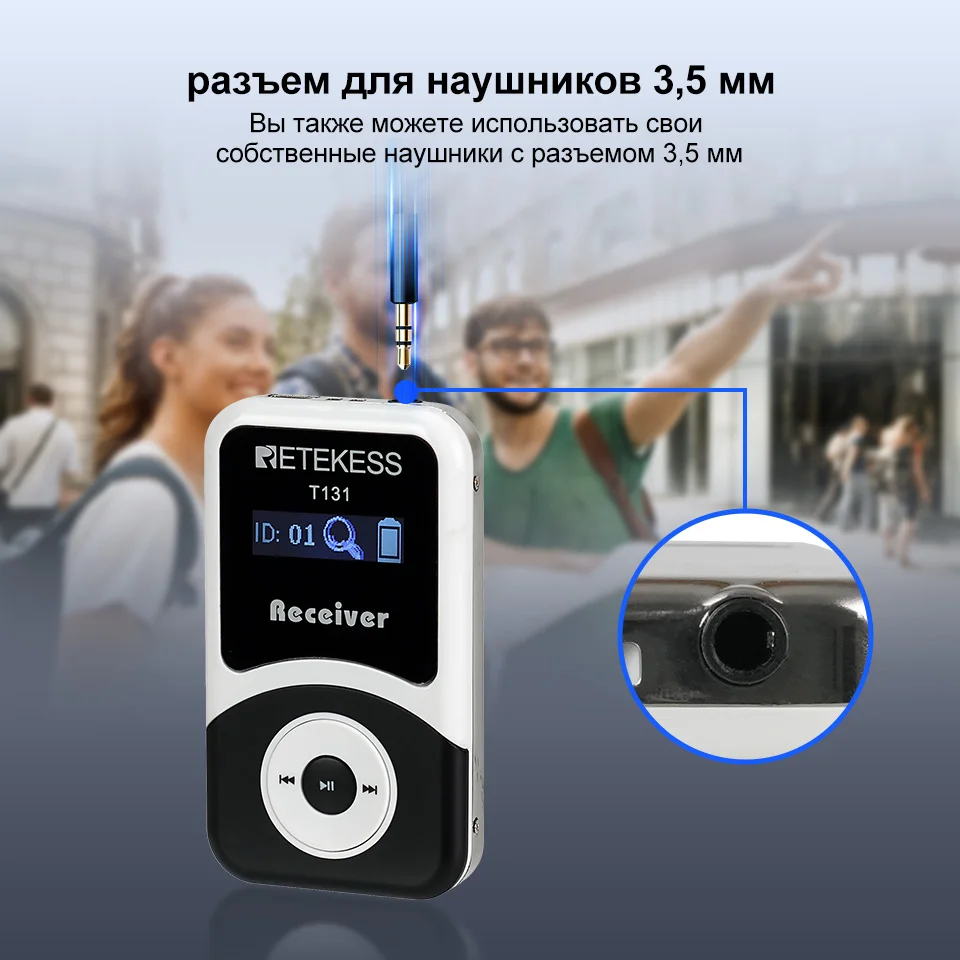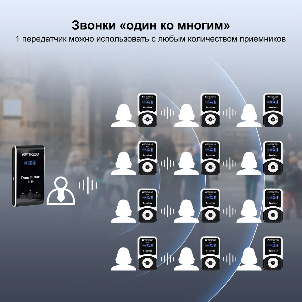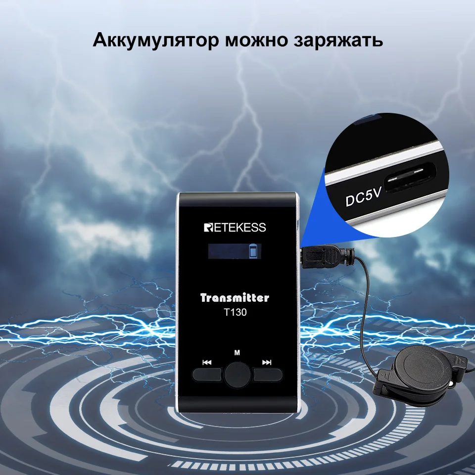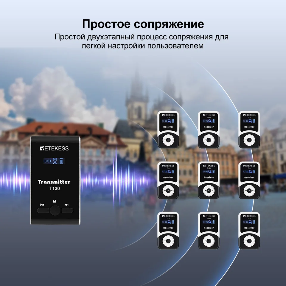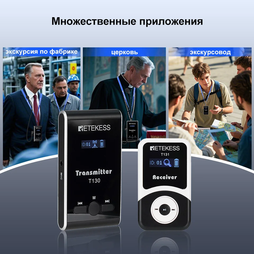 Эта беспроводная гид-система состоит из T131 передатчик и T130 приемника. Динамик носит передатчик с микрофоном и аудитории одежда приемник с наушником. С одним передатчиком можно подключить множество приемник в соответствии с вашими потребностями. Это обеспечивает стабильный сигнал от PLL и то и другое bulit в аккумуляторная Бетти.