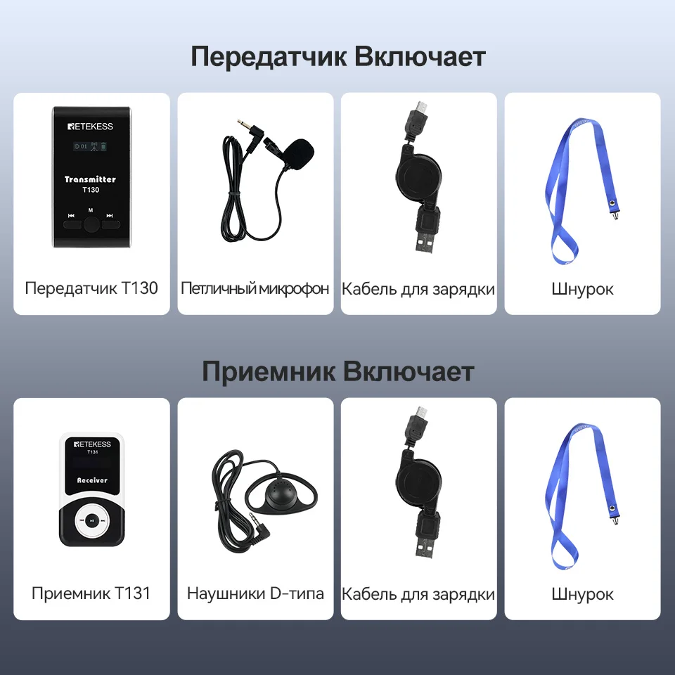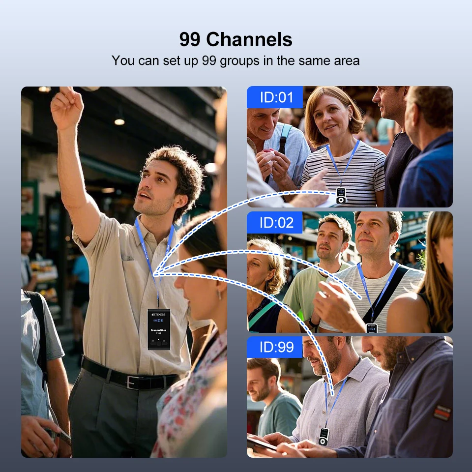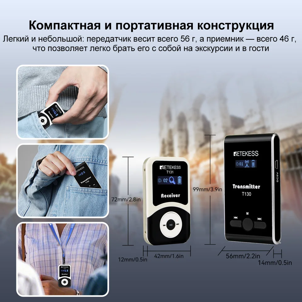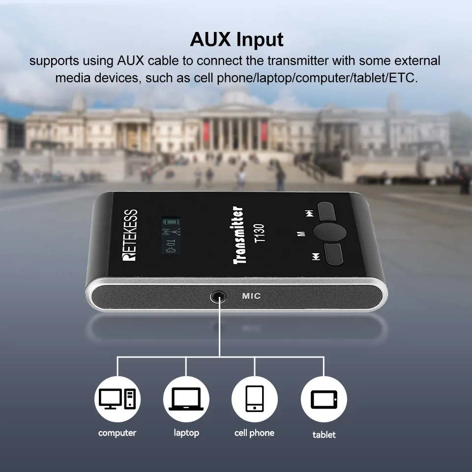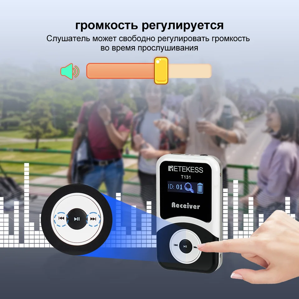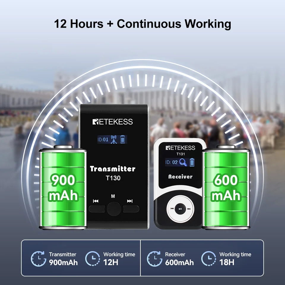 Эта беспроводная гид-система состоит из T131 передатчик и T130 приемника. Динамик носит передатчик с микрофоном и аудитории одежда приемник с наушником. С одним передатчиком можно подключить множество приемник в соответствии с вашими потребностями. Это обеспечивает стабильный сигнал от PLL и то и другое bulit в аккумуляторная Бетти.