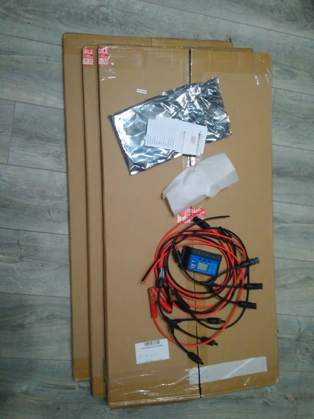 Доставка из России 10 дней. Комплект соответствует описанию, пришло без повреждений. Панели опробованы на ранневесеннем солнце, небо в легкой дымке. Напряжение на выходе 20-20,5 В, ток КЗ 4,3-4,75 А.
