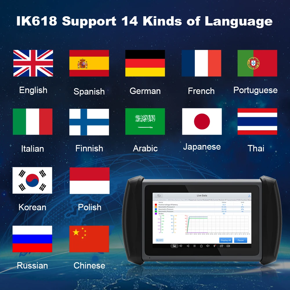 XTOOL IK618 поддерживает 14 языков: английский, испанский, немецкий, французский, португальский, итальянский, финский, арабский, японский, тайский, корейский, польский, русский, китайский
