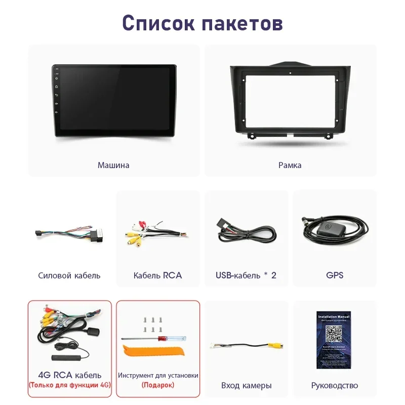 - Особые характеристики:Функции Wi-Fi, поддержка управления рулевым колесом, Поддержка сети 3G, Поддержка сети 4G, Встроенный GPS, Мобильный телефон, MP3-плеер