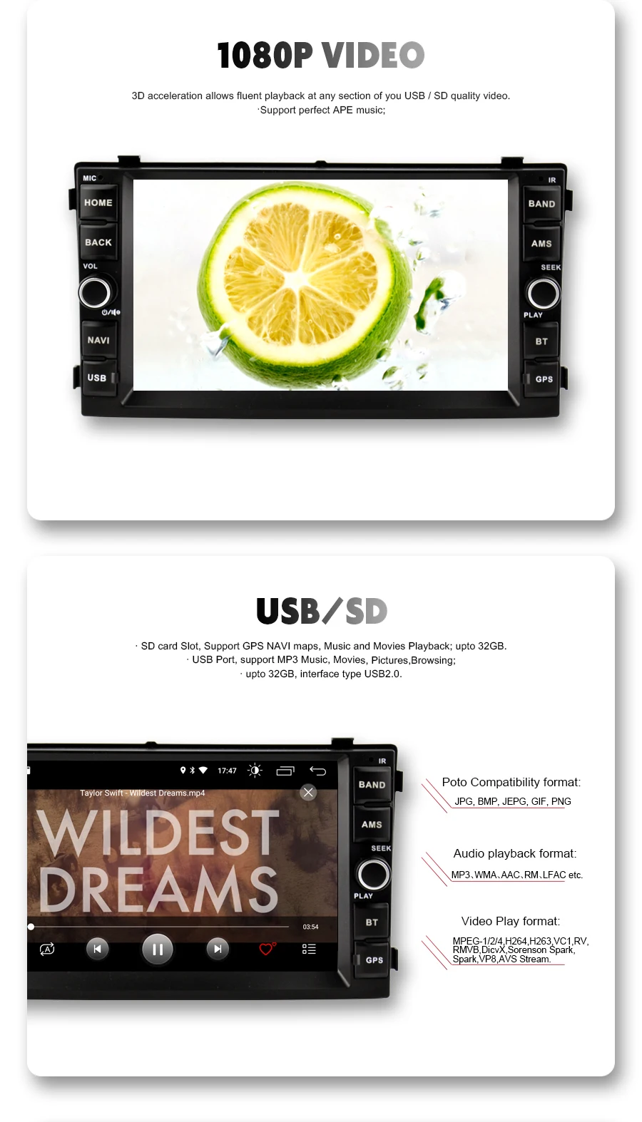 - Особые характеристики:Функции Wi-Fi, поддержка управления рулевым колесом, Поддержка сети 3G, Встроенный GPS, MP3-плеер, Голосовое управление, Цифровой процессор (DSP), Carplay, Android Auto, Реверсивный вход, Разделенный экран