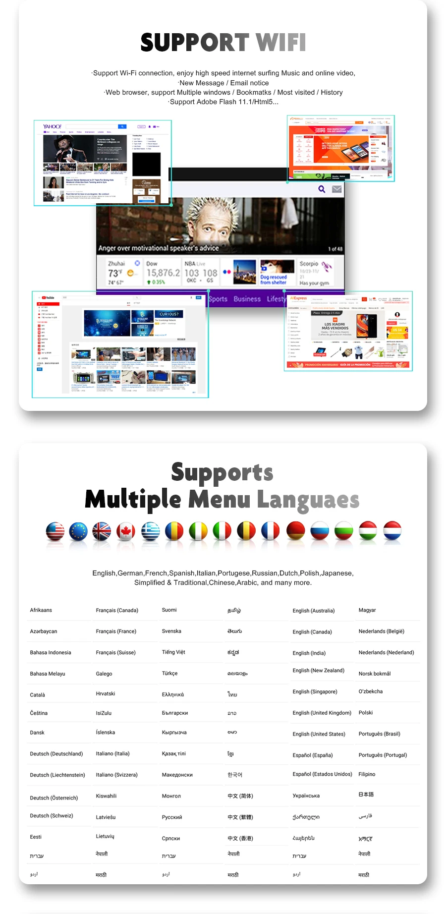 - Язык экранного меню:Китайский (упрощенный), Китайский (Традиционный), Арабский, Немецкий, Русский, Французский, Корейский, Японский, Иврит, Греческий, Испанский, Итальянский, Английский