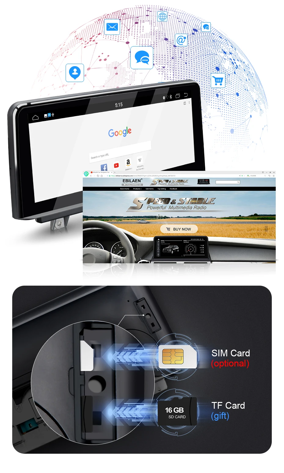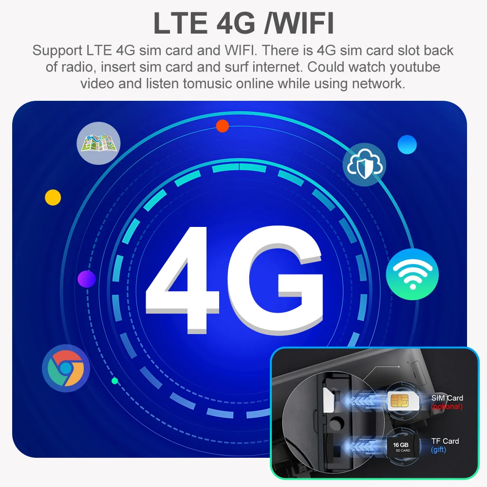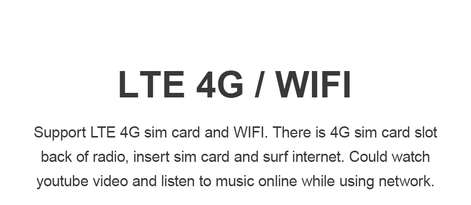 >>> Поддержка LTE 4G и WIFI, есть слот для сим-карты 4G на задней панели радио. Вставьте сим-карту и пользуйтесь интернетом. Можно смотреть видео на YouTube и слушать musci онлайн при использовании сети. Сим-карта 4G не является обязательной, вы можете купить сим-карту на местном рынке.
