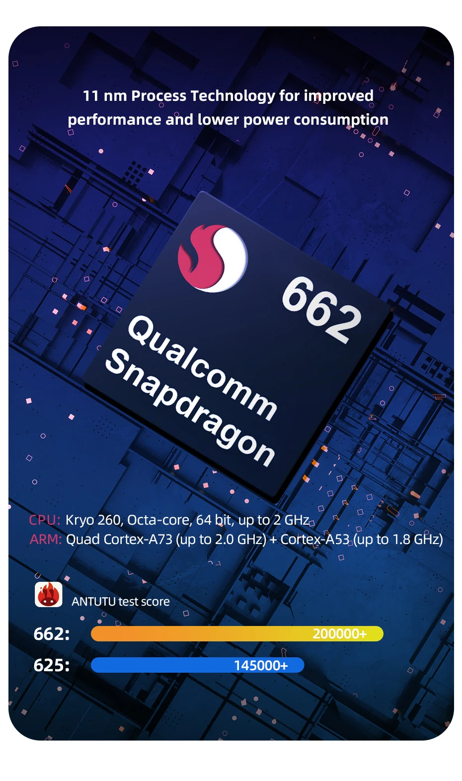 >>> ЦП - это процессорный чип Qualcomm Snapdragon 662 , работающий быстрее и стабильнее, с лучшим рассеиванием тепла, будет наслаждаться плавным использованием приложений
