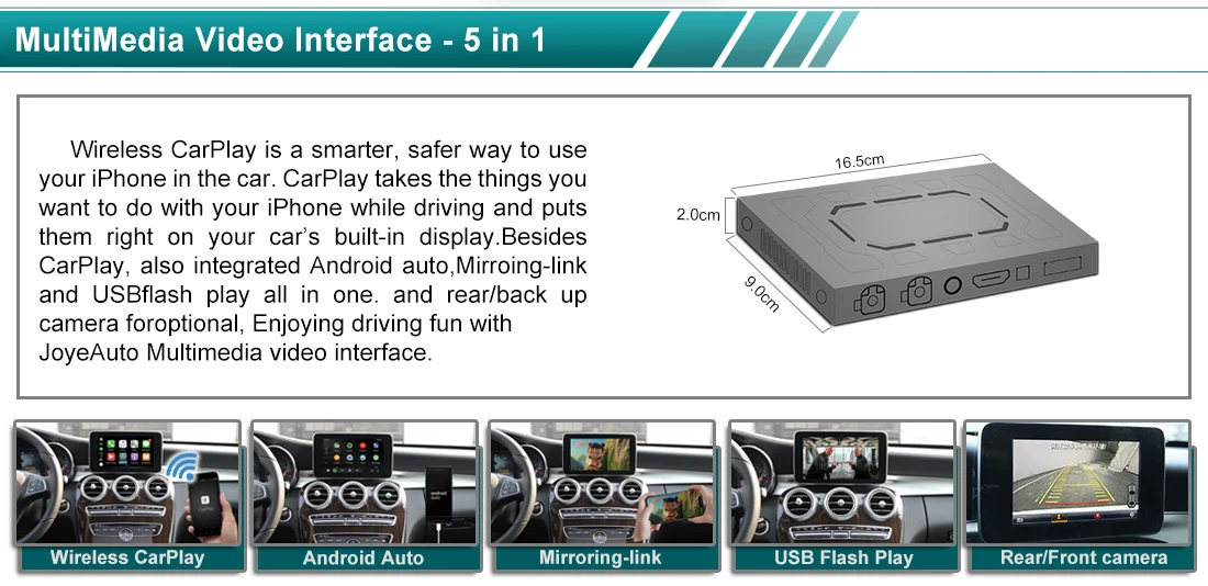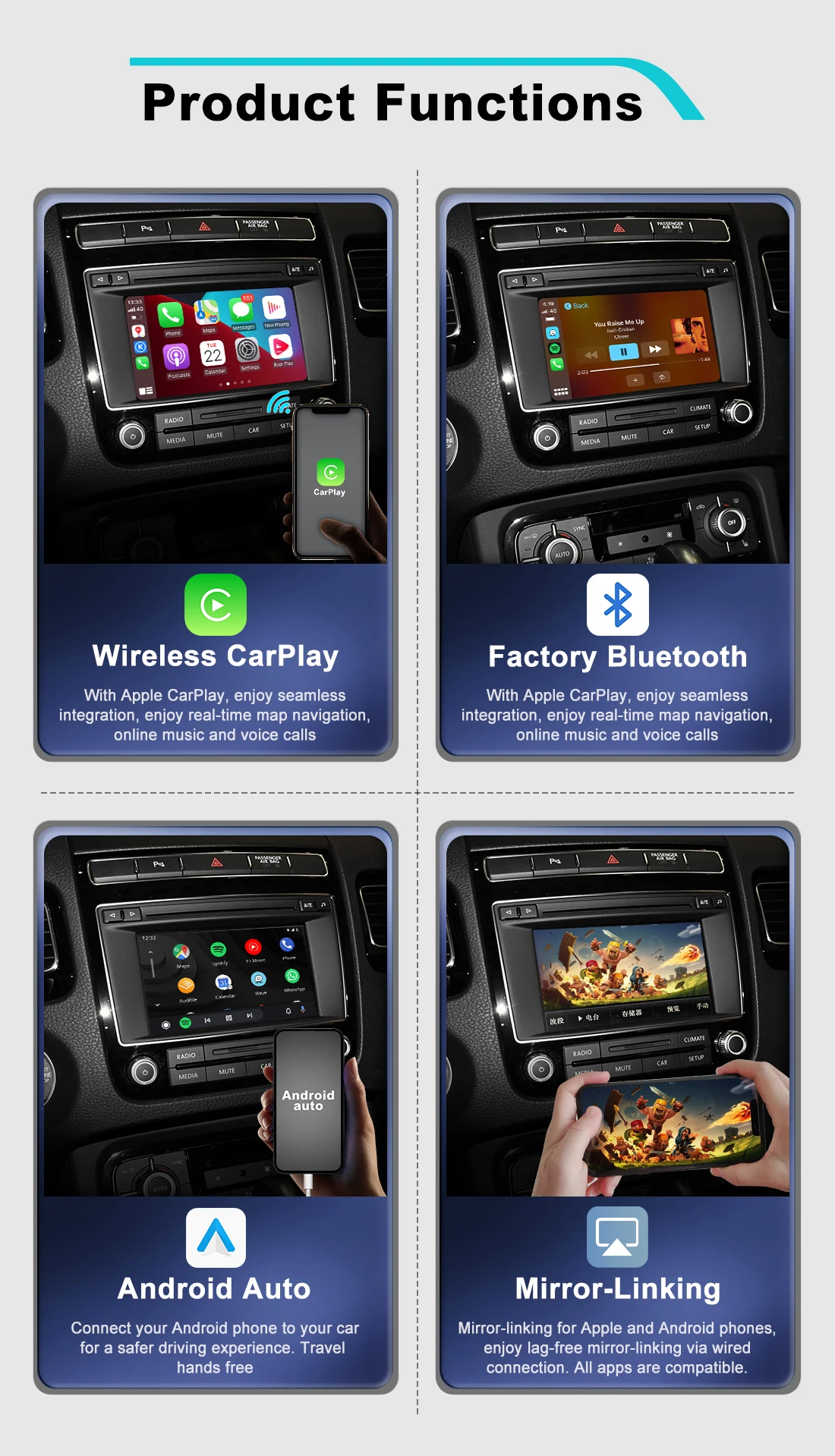 - Functions:Wireless/Wired Apple Carplay, Android Auto/Mirror, USB Flash Play