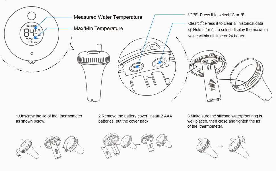 Отличный беспроводной термометр для бассейна от INKBIRD Online Store. У продавца можно выбрать один из двух вариантов устройств - обычный комплект с беспроводной передачей данных на 430 Mhz или комплект с дополнительной возможностью передачи и синхронизации данных через Bluetooth c фирменным приложением Engbird В комплект входит: ✔ Базовый блок; ✔ водонепроницаемый датчик температуры воды в бассейне; ✔ инструкция пользователя. Устройство без проблем синхронизировалось сразу после установки двух батареек AAA в базовую станцию и датчик. Экран яркий, вверху выводятся текущие показания датчика температуры воды, снизу показана температура воздуха, все показания хорошо видны под разными углами. Базовый блок можно как вешать на стену, так и ставить на ровную поверхность при помощи специальной откидывающейся ножки. В этом магазине большой выбор полезных устройств для дома. Уже добавил несколько интересных вариантов в корзину. Экспресс-доставка заняла всего 3 дня.