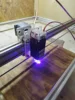 Лазер отличный за свои деньги. От БП ест 18 ватт, 1.5А. Фокусировка на расстоянии примерно 2.5-3см. Пятно прямоугольное. Гравировать пока не пробовал, но фанеру 4мм прожигает насквозь секунд за 5