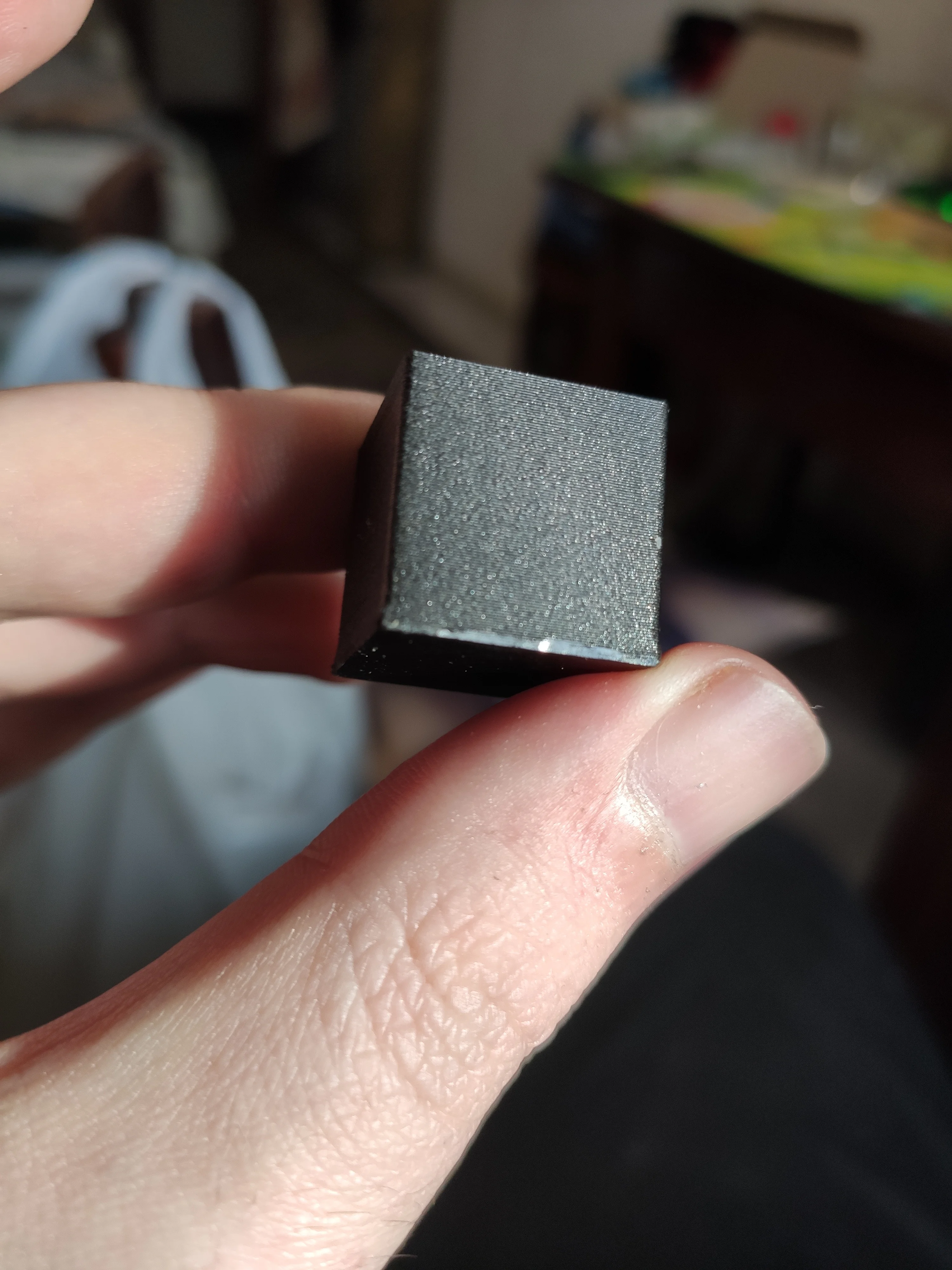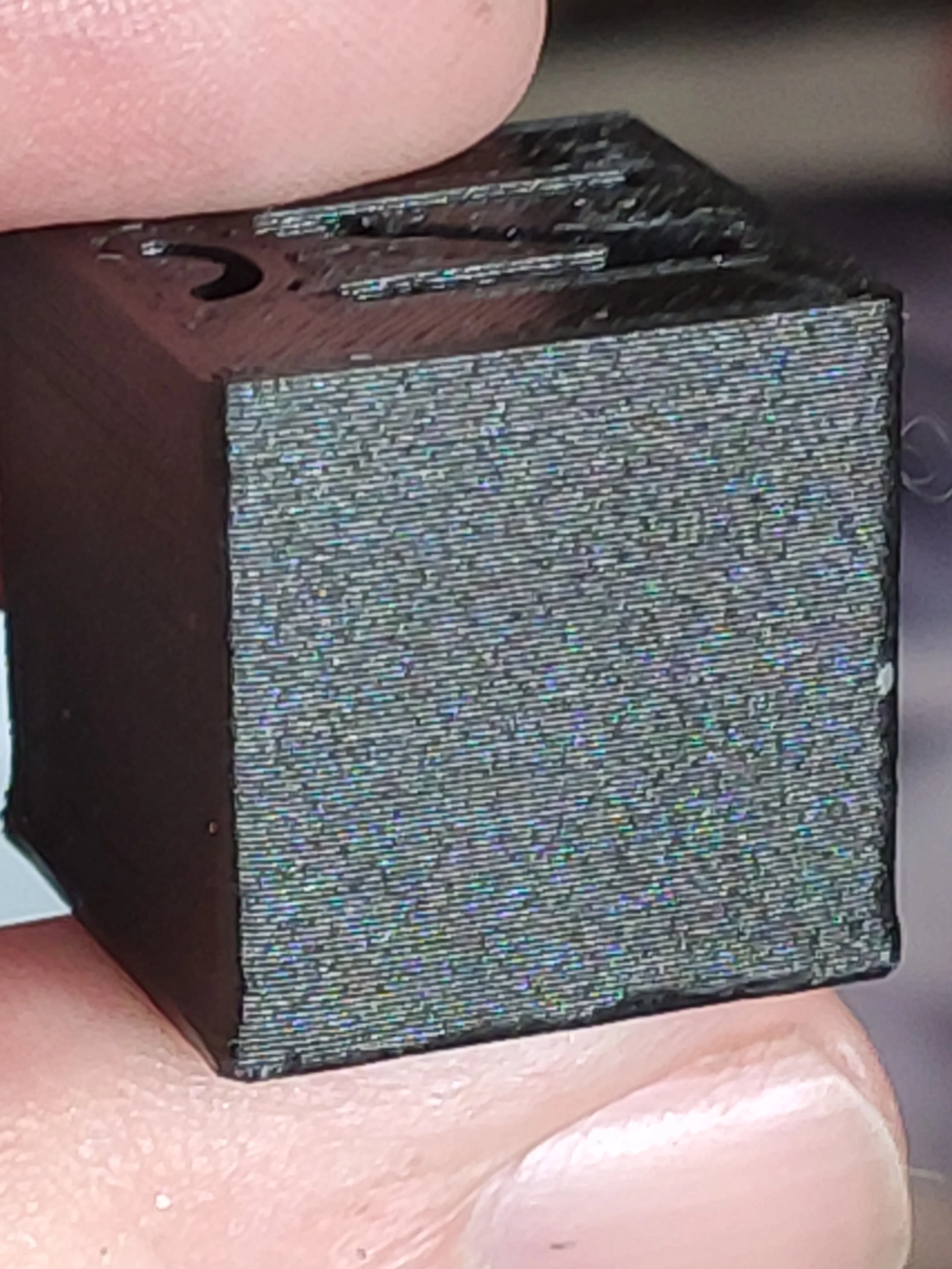 Отличный пластик из углерода, весьма капризный к охлаждению (не любит). Когда я печатал обычный PETG использовался обдув, в этом пластике он противопоказан. Поверхность получается превосходная. Печать 240 / 100.