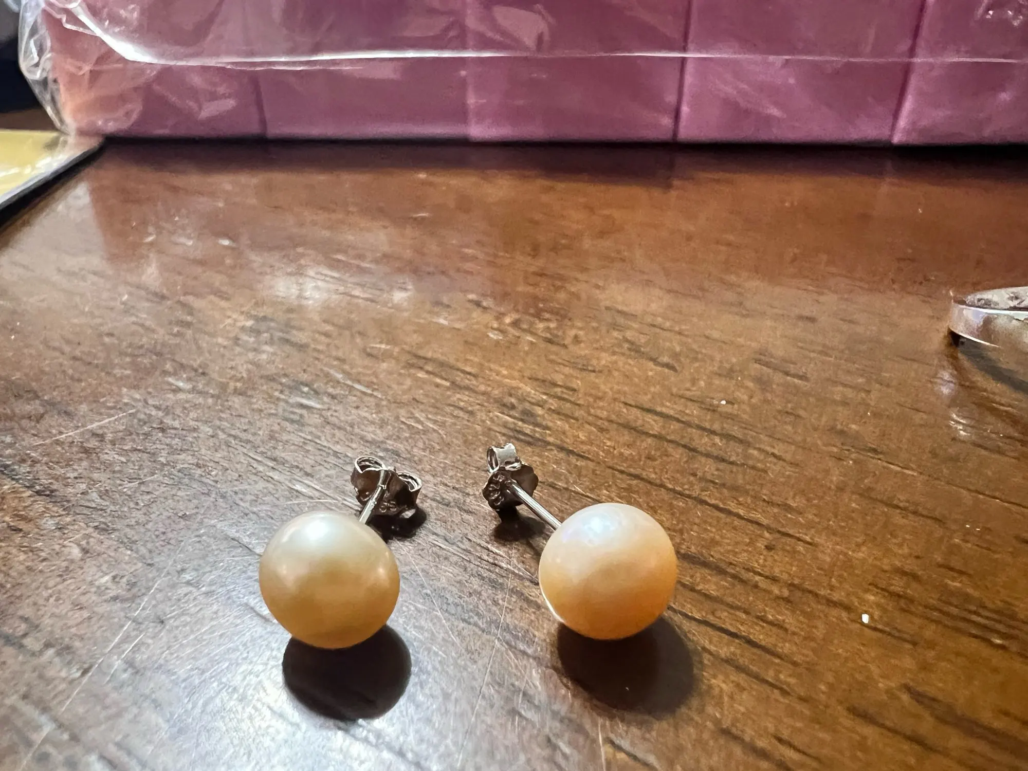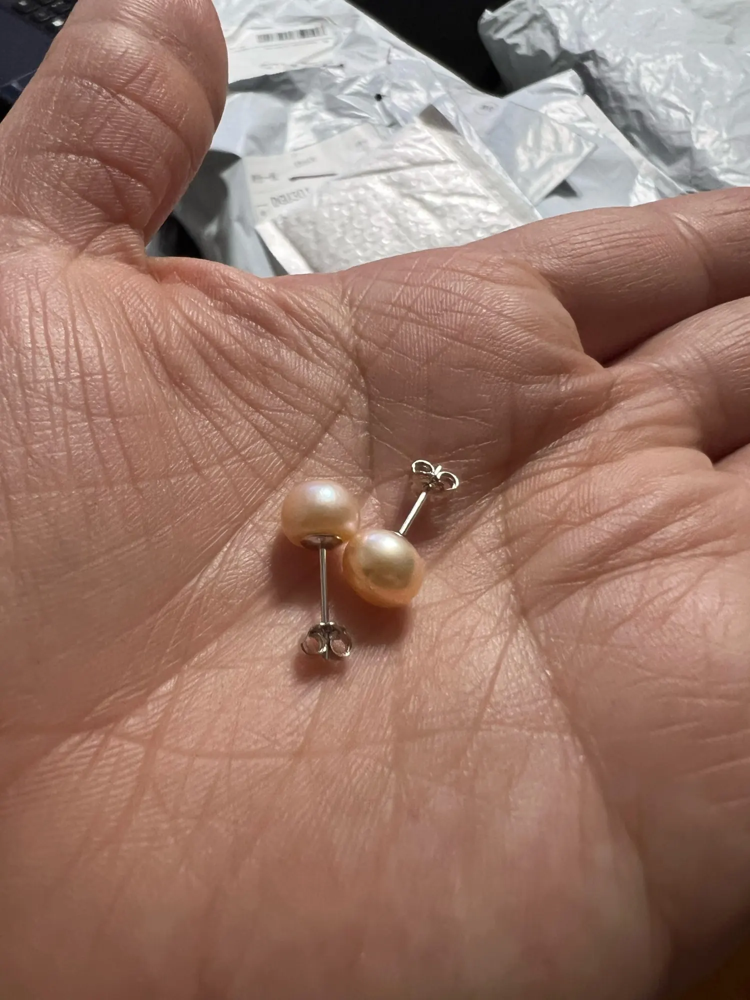 Меньше, чем я думал, и цвет не белый, он похож на бледно-розовый, однако они выглядят хорошо, хорошего качества, но я не знаю, жемчужные ли они и серебристые, надеюсь, они повредят мои уши, но я рекомендую это 100%