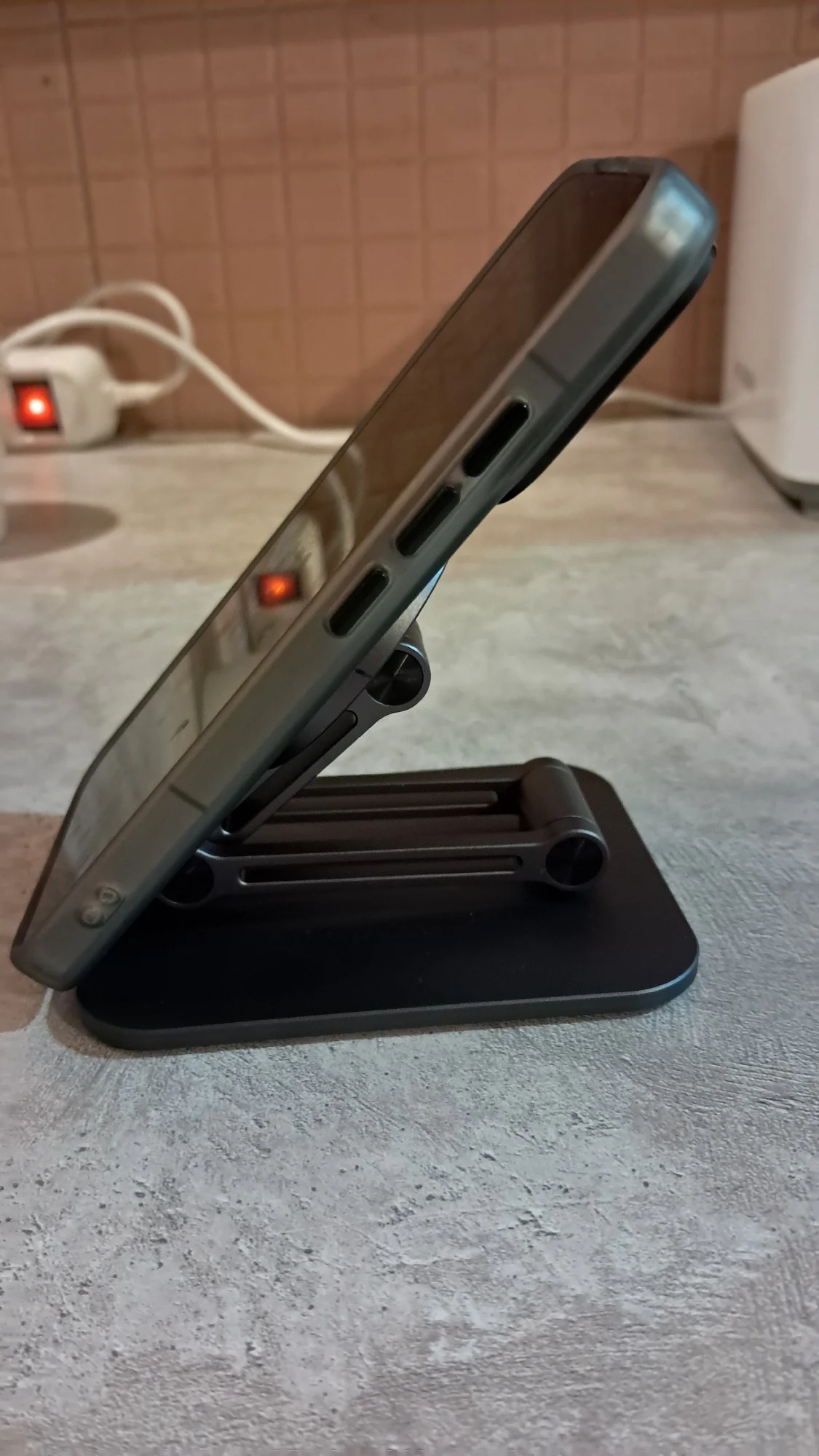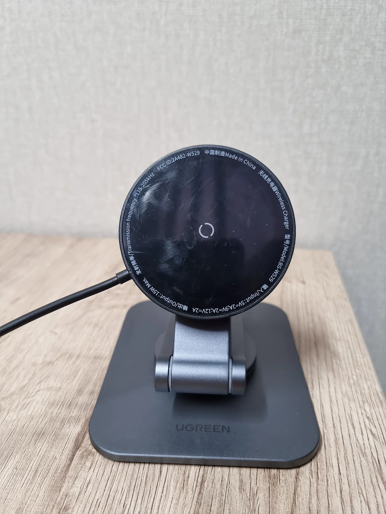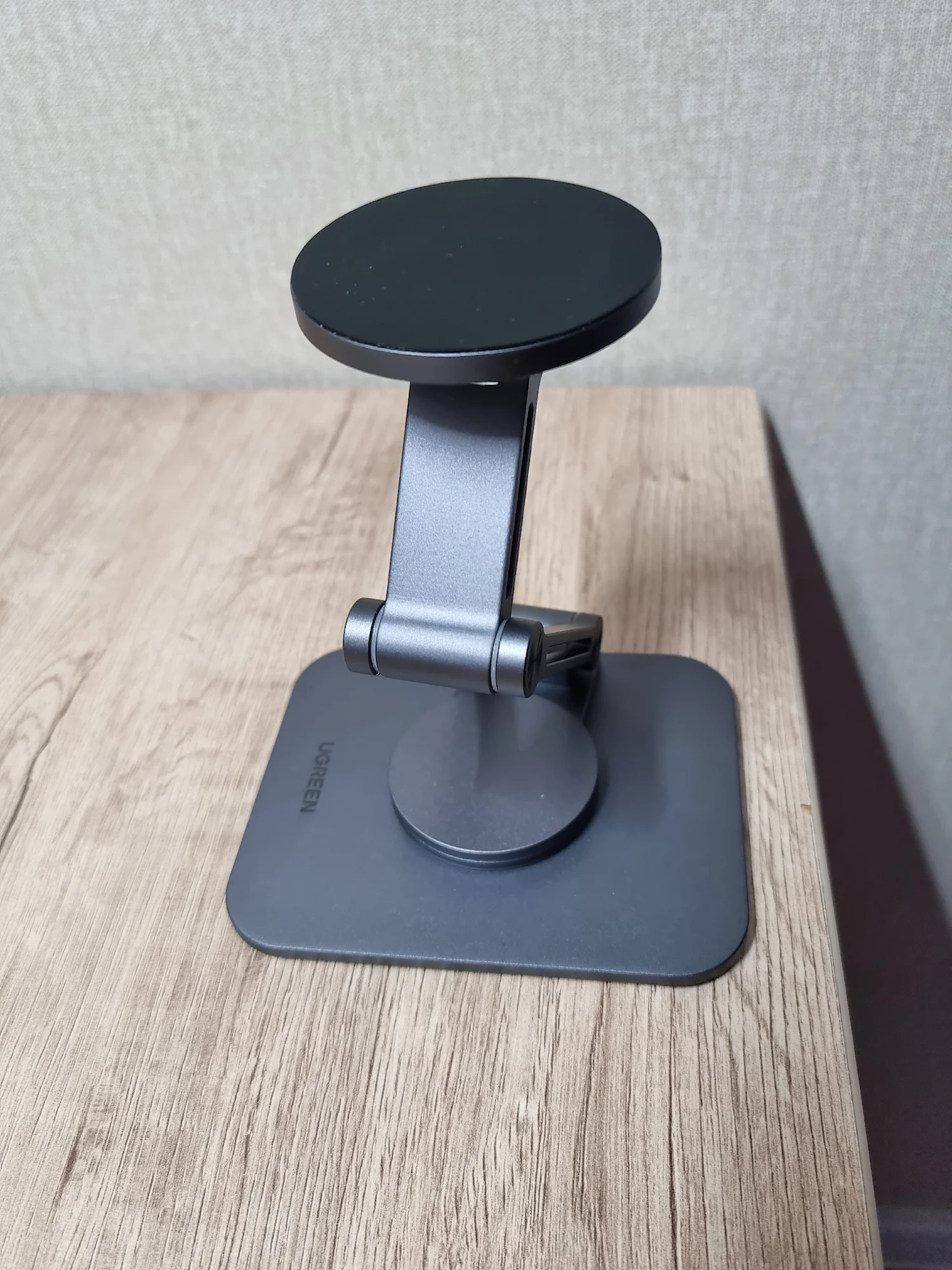 Отличная подставка, например, чтобы кушать и смотреть видеоролик на YouTube. Не заряжает телефон, кабель нужно подключать обычным образом через разъём. Для телефонов без MagSafe в комплекте есть одно металлическое кольцо и влажная салфетка. Можно приклеить кольцо и пользоваться подставкой. Материал - металл, качество офигенное, крепление и механизм шарниров - надёжные! Ножка прорезиненная, скользить по столу не будет.