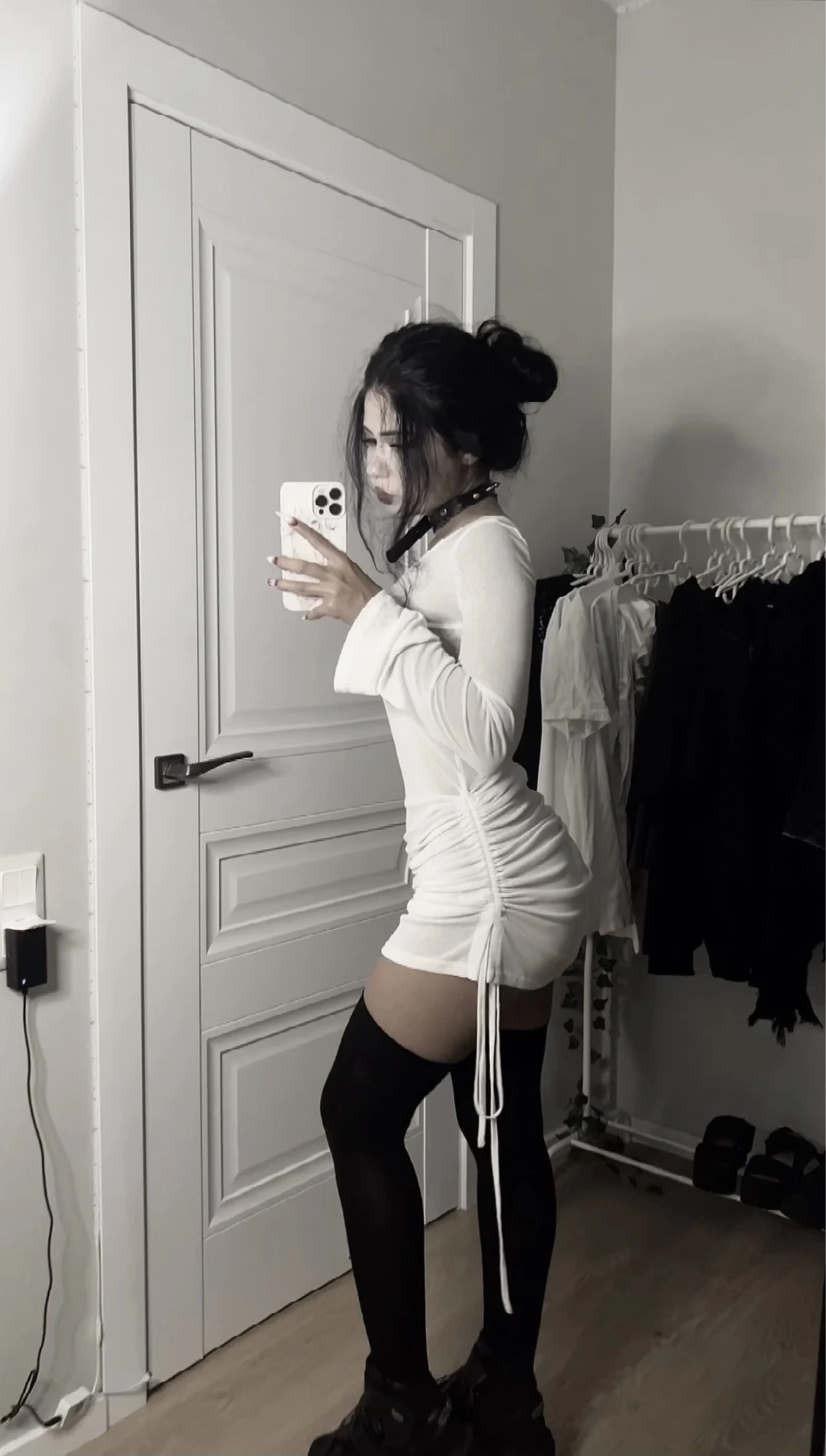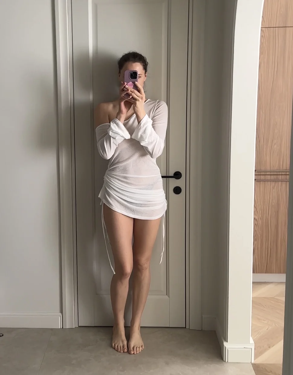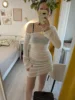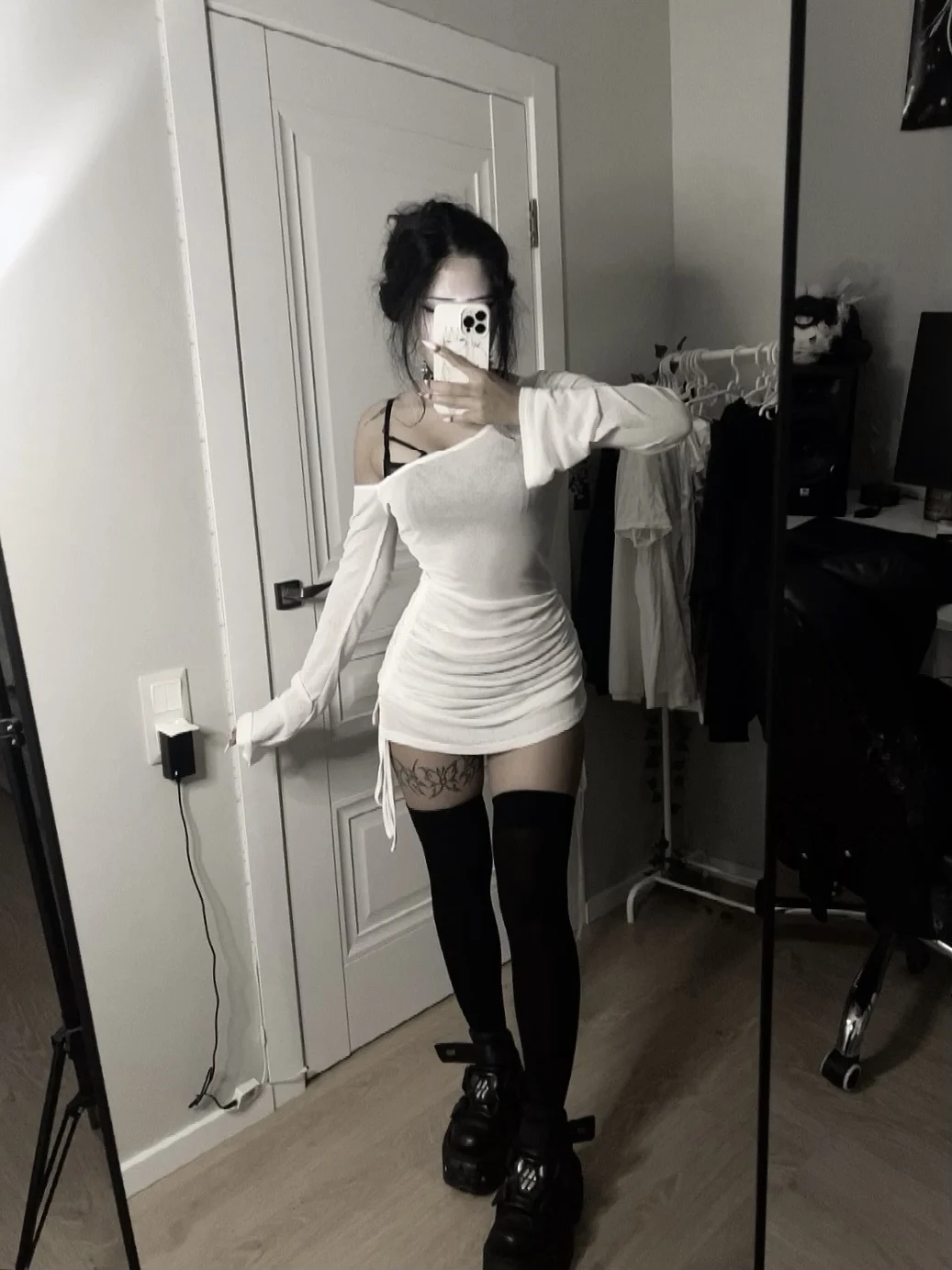 ALLNeon Fairycore White Perspective Oblique Shoulder Long Sleeve Mini Dress...