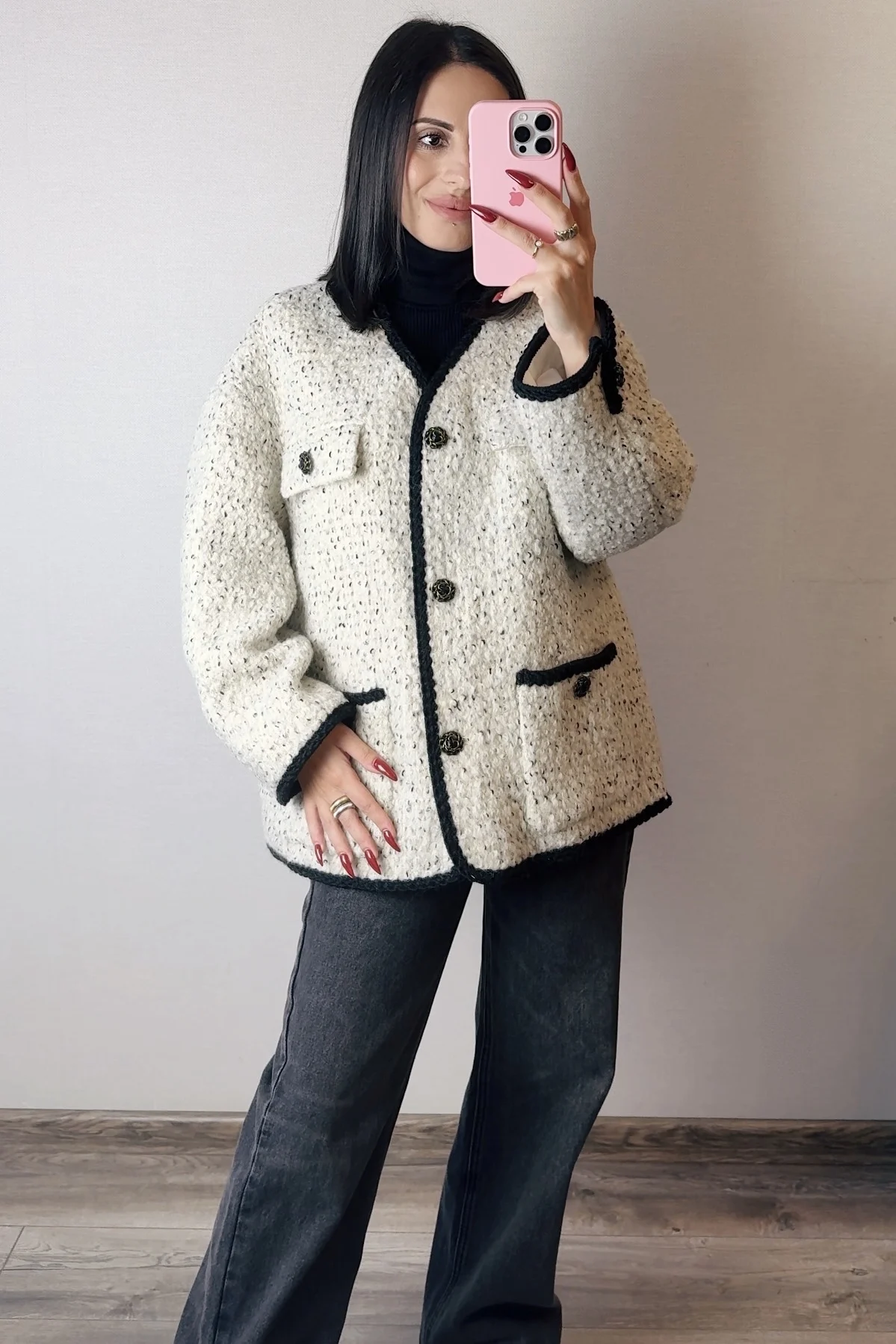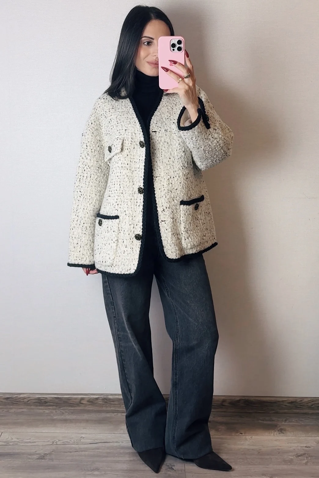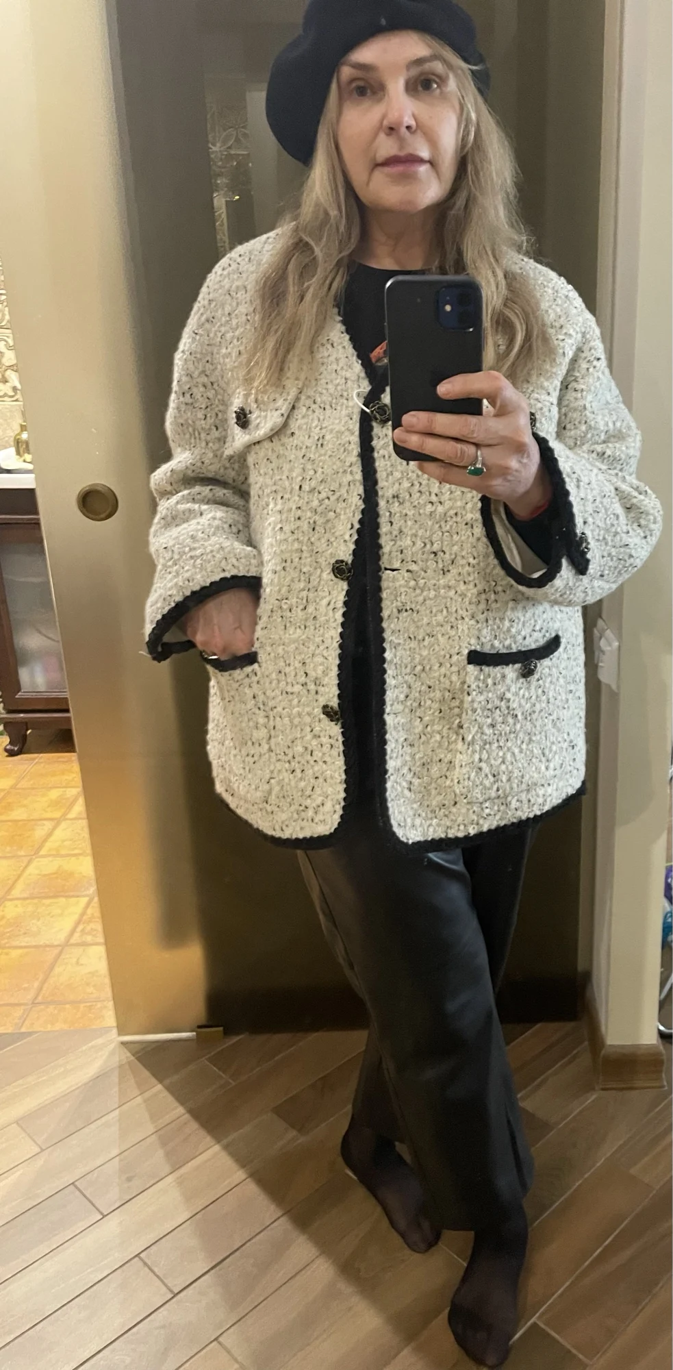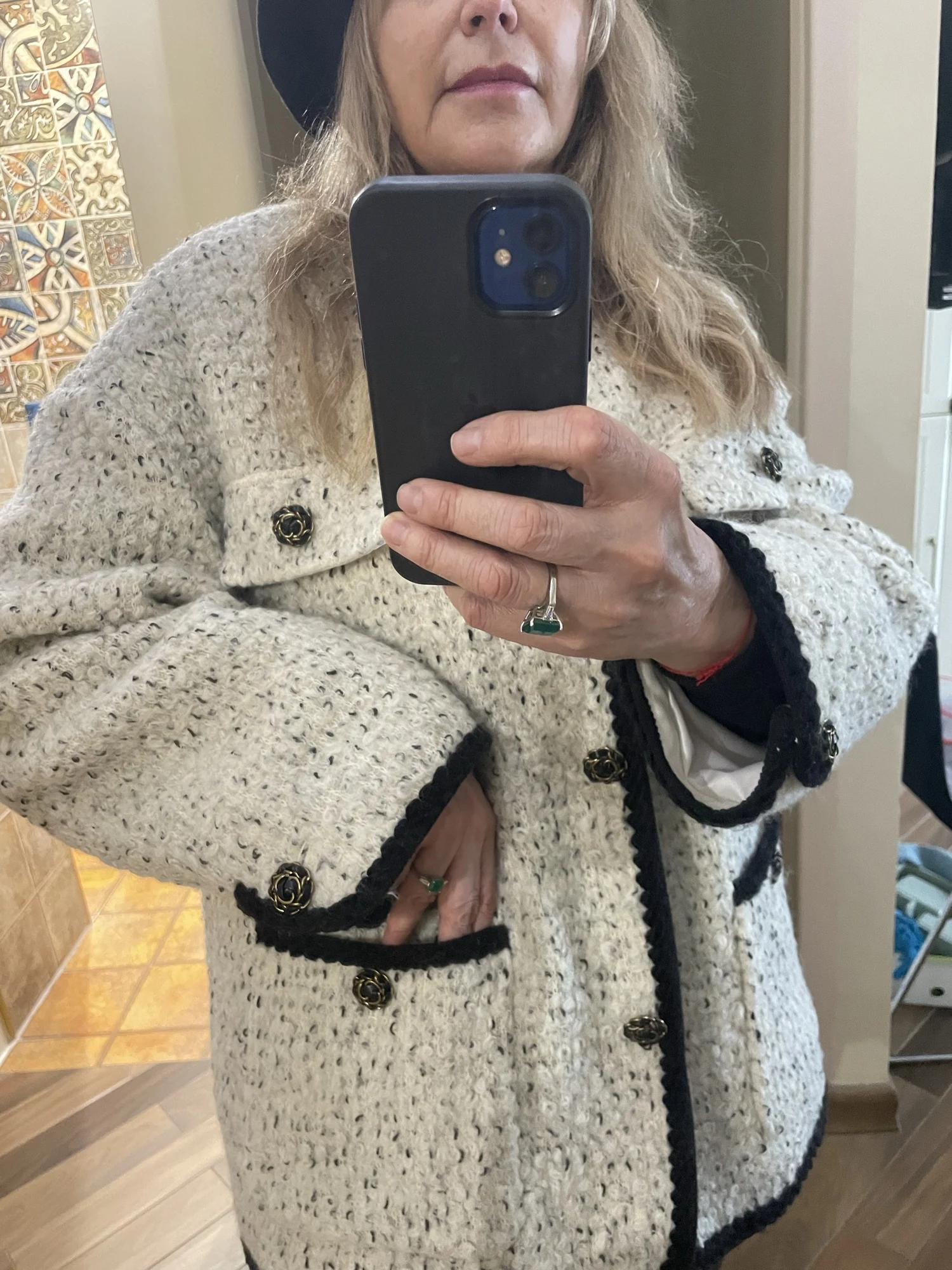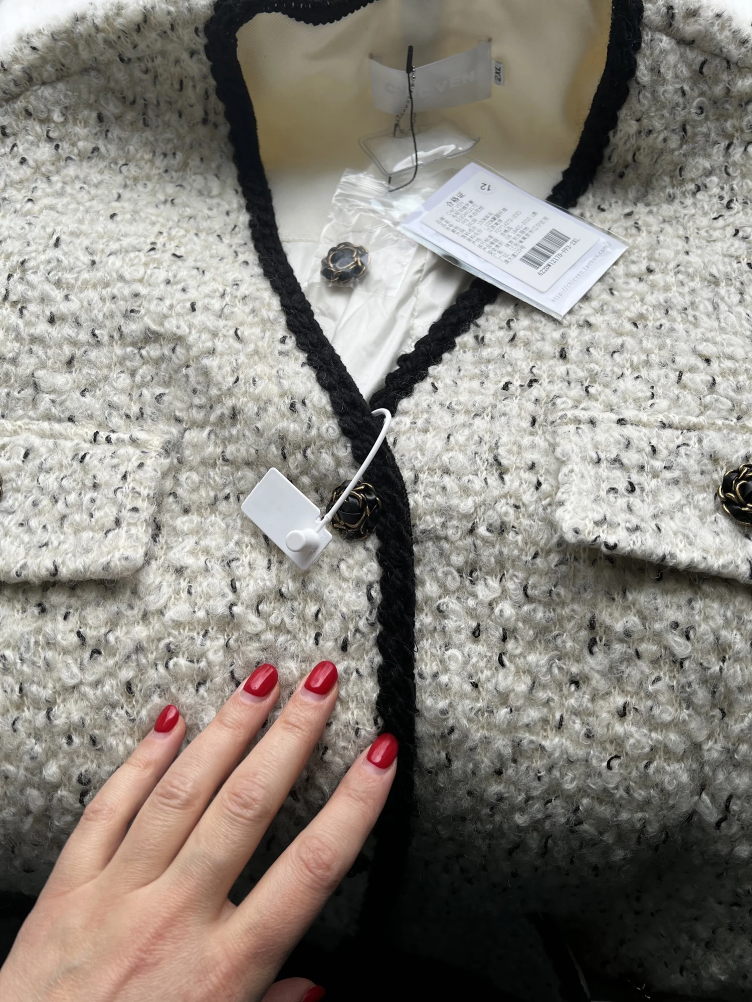 Шерстяное пальто «жакет» На свои параметры 86/66/89 см и рост 160 см заказала жакет в размере S в цвете Off white. По объемам и длине есть запас на бОльшие параметры. Состав: верхняя часть - 100% шерсть; атласный подклад. Жакет утепленный, утеплитель - утиный пух. Материал плотный, тактильно приятный. Качество безупречное! Спереди застегивается на красивые металлические пуговицы в виде розочек. Такими же пуговицами украшены карманы и манжеты. Пальто по краям обшито контрастной каймой черного цвета. Спереди расположена глубокие функционирующие карманы. Прекрасное стильное пальто в стиле жакета известного мирового бренда. Я бы даже газвала его изысканным - смотрится оно роскошно и дорого! Обожаю этот бренд - всегда радут вещи качеством пошива, тканей и внешним видом!