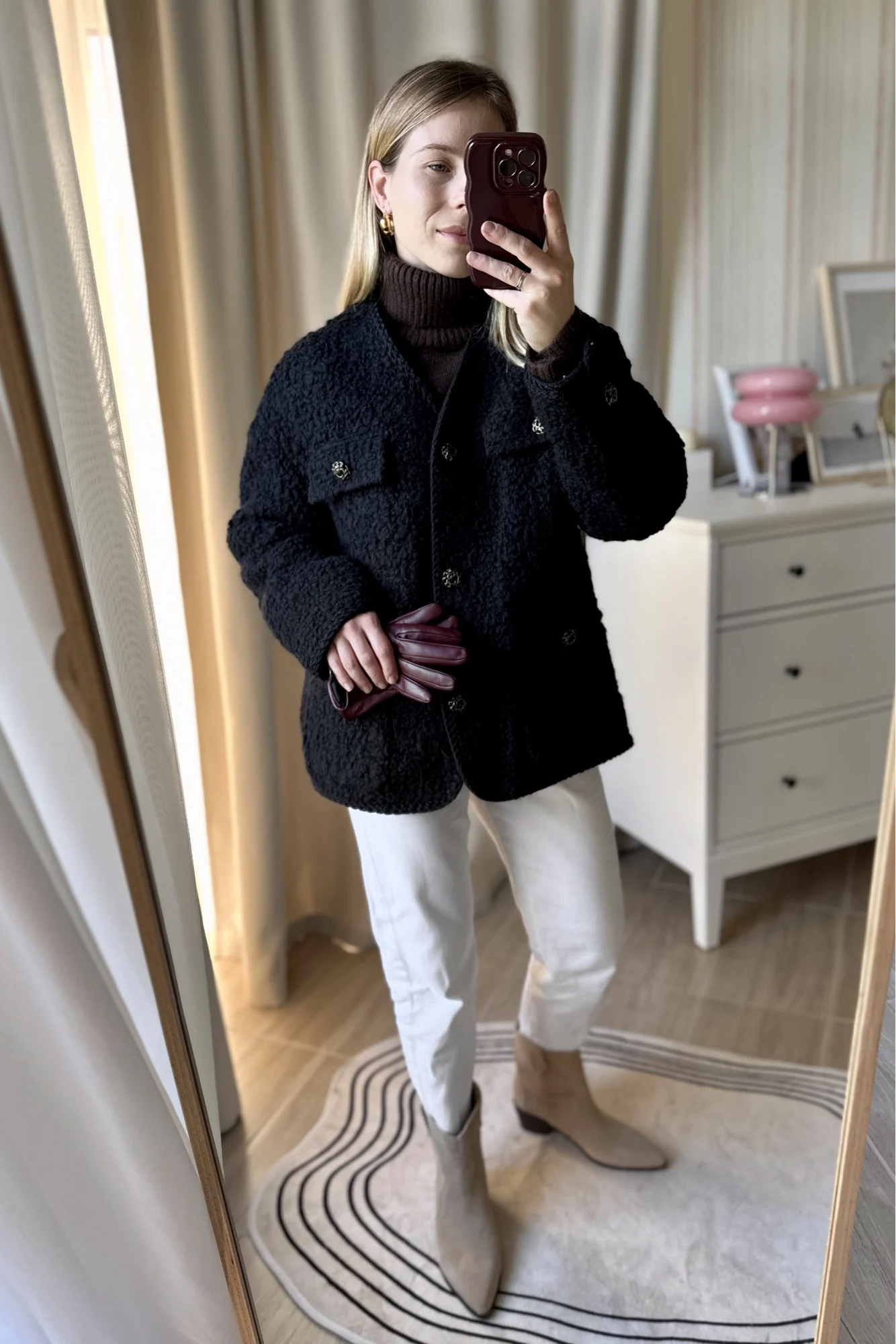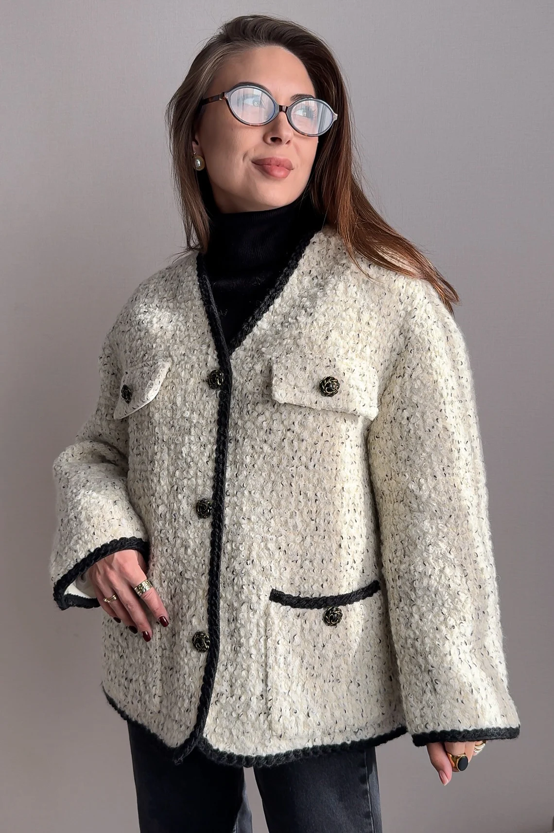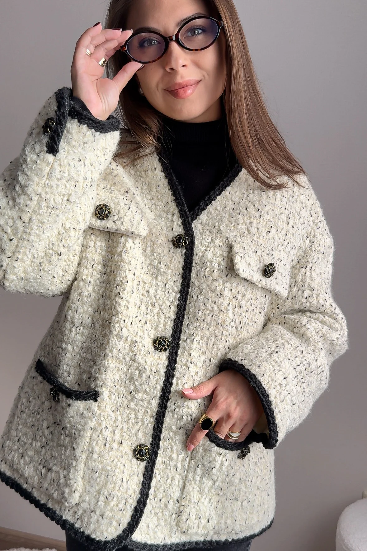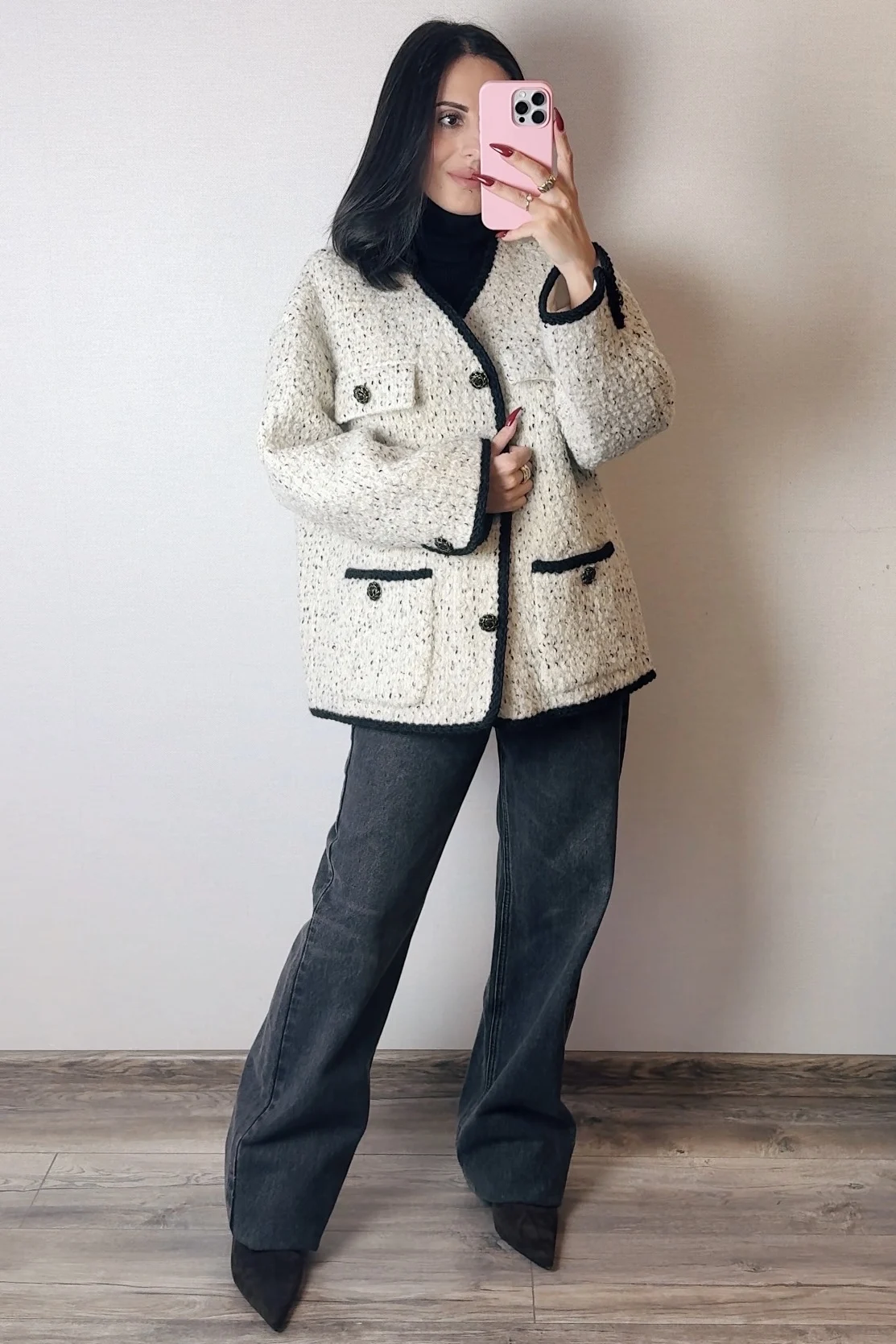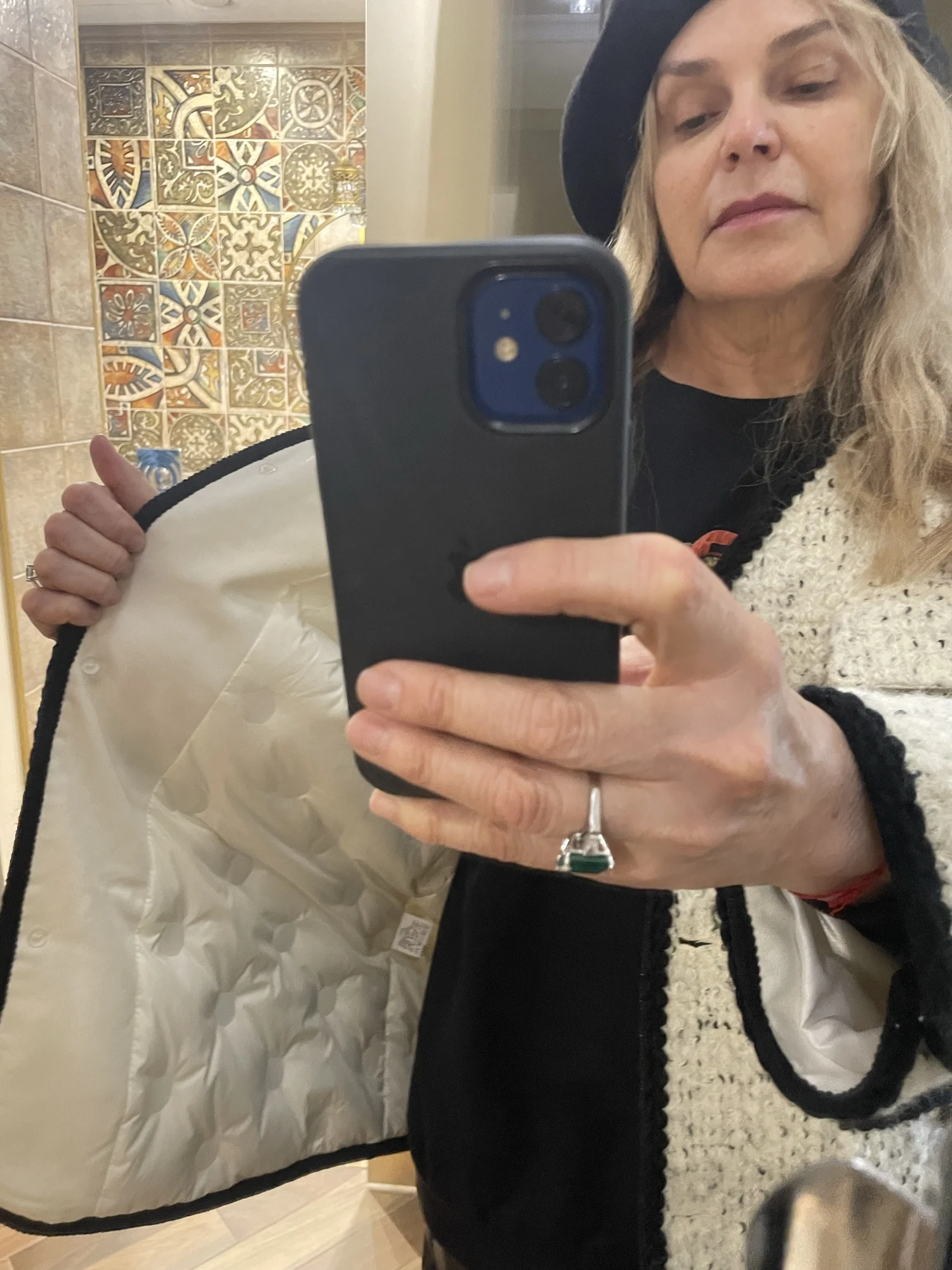 Шерстяное пальто «жакет» На свои параметры 86/66/89 см и рост 160 см заказала жакет в размере S в цвете Off white. По объемам и длине есть запас на бОльшие параметры. Состав: верхняя часть - 100% шерсть; атласный подклад. Жакет утепленный, утеплитель - утиный пух. Материал плотный, тактильно приятный. Качество безупречное! Спереди застегивается на красивые металлические пуговицы в виде розочек. Такими же пуговицами украшены карманы и манжеты. Пальто по краям обшито контрастной каймой черного цвета. Спереди расположена глубокие функционирующие карманы. Прекрасное стильное пальто в стиле жакета известного мирового бренда. Я бы даже газвала его изысканным - смотрится оно роскошно и дорого! Обожаю этот бренд - всегда радут вещи качеством пошива, тканей и внешним видом!