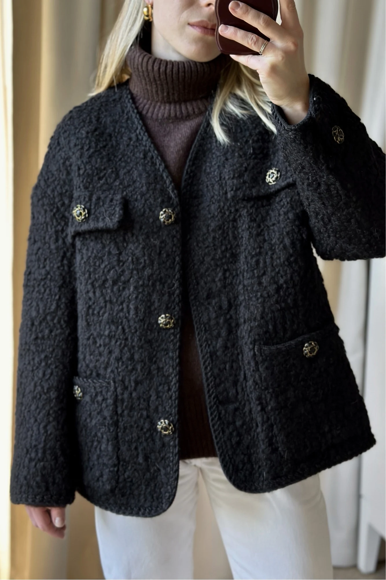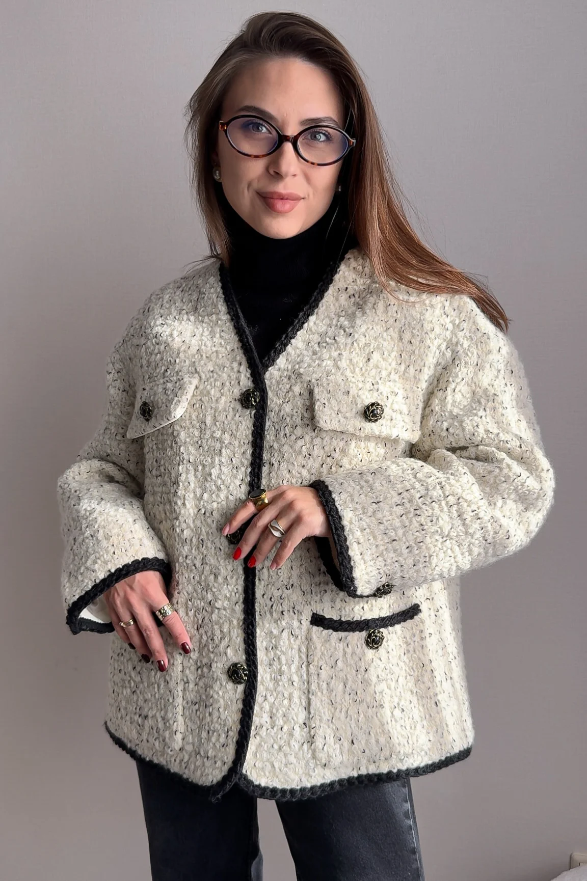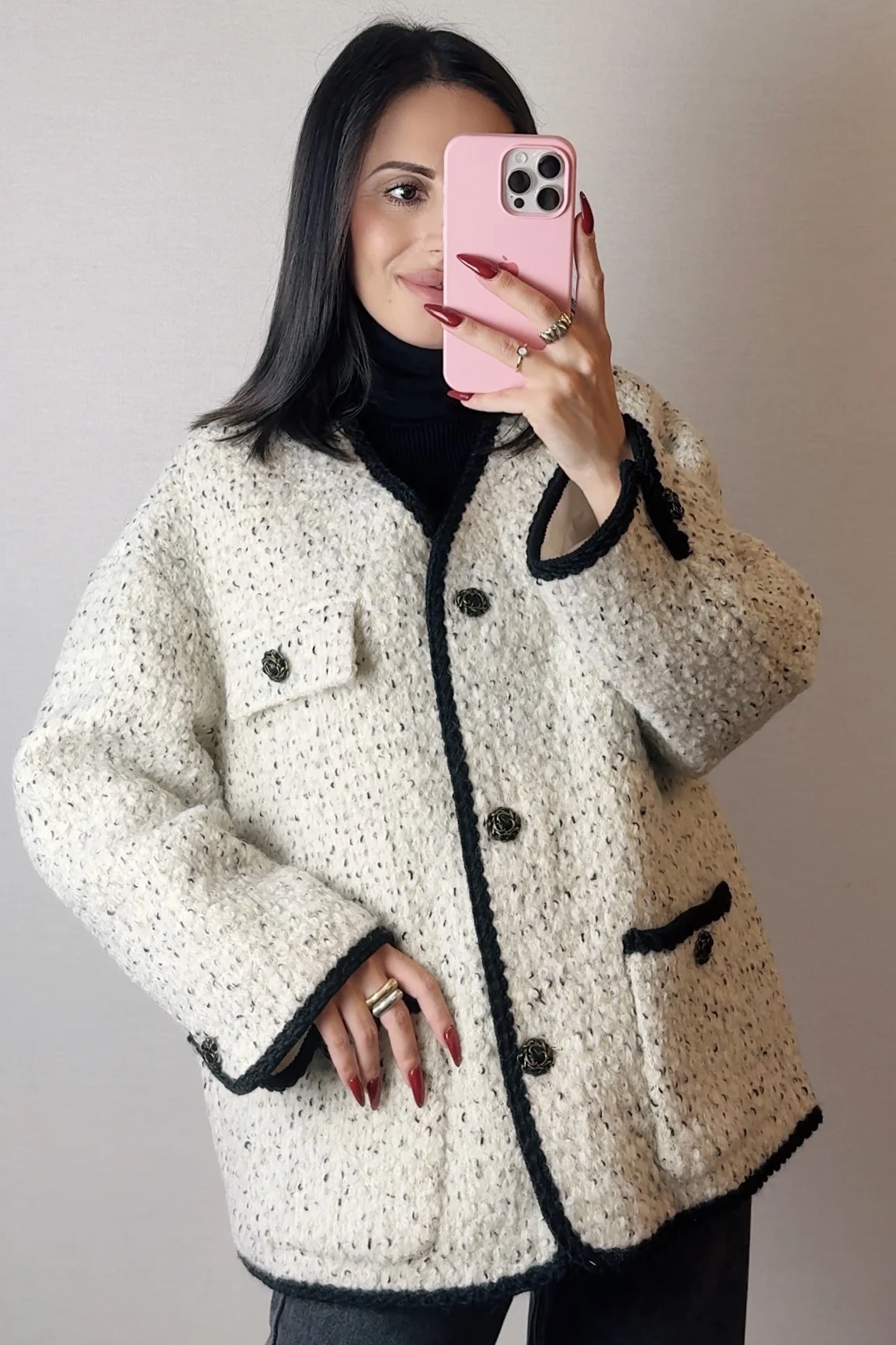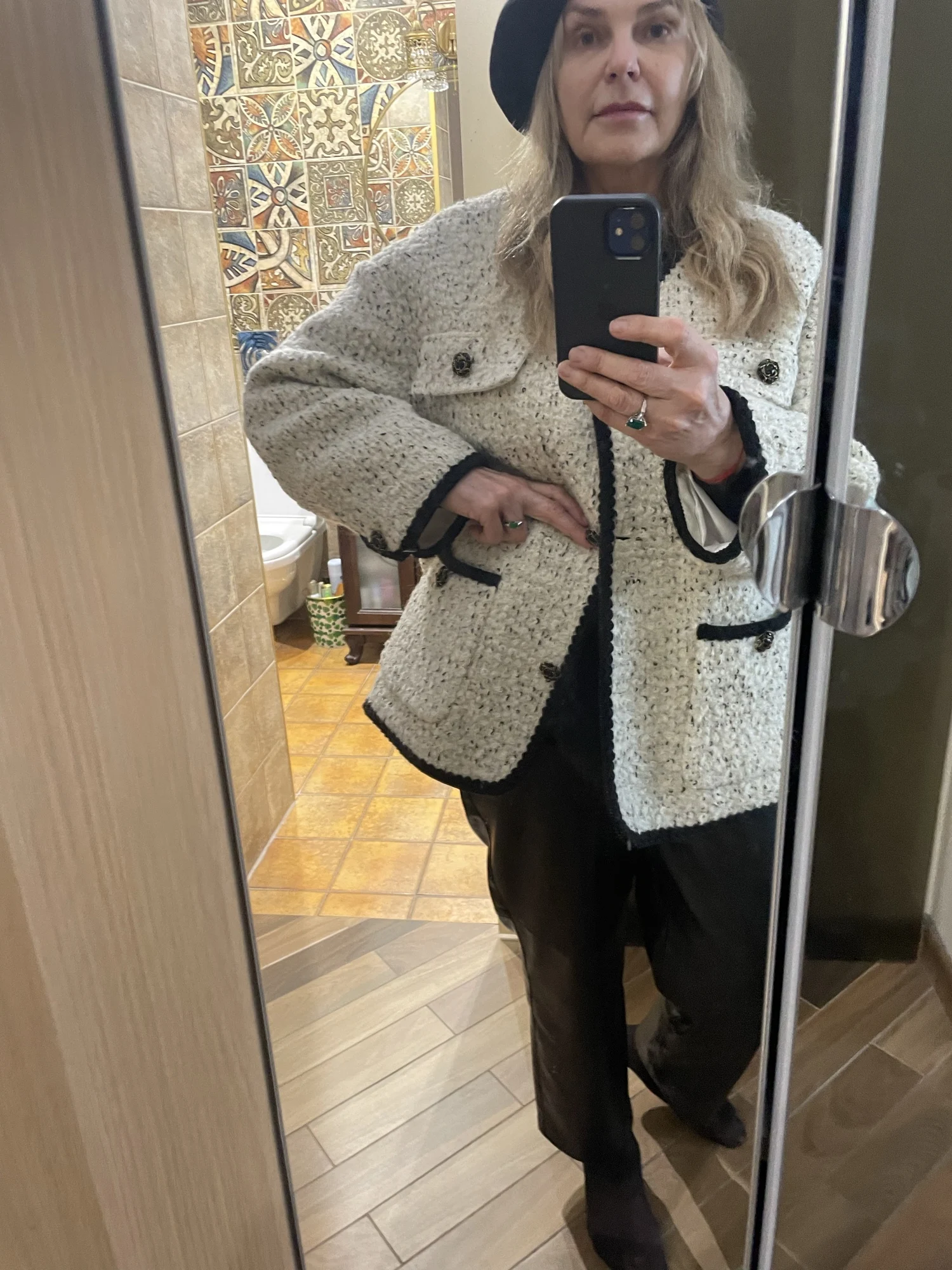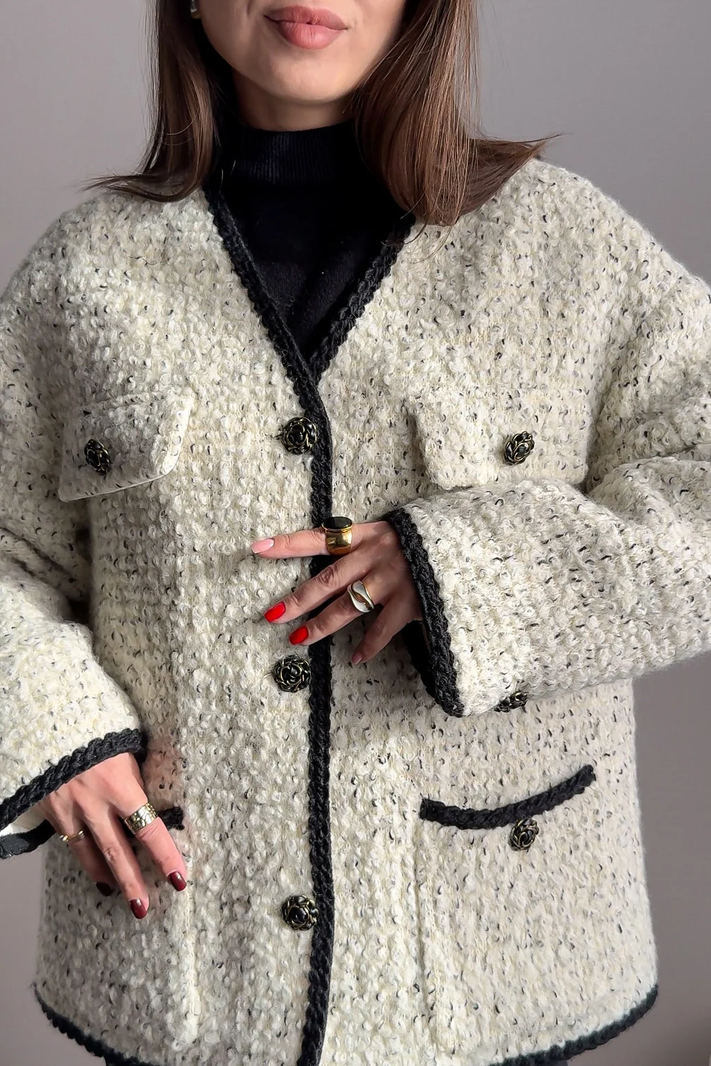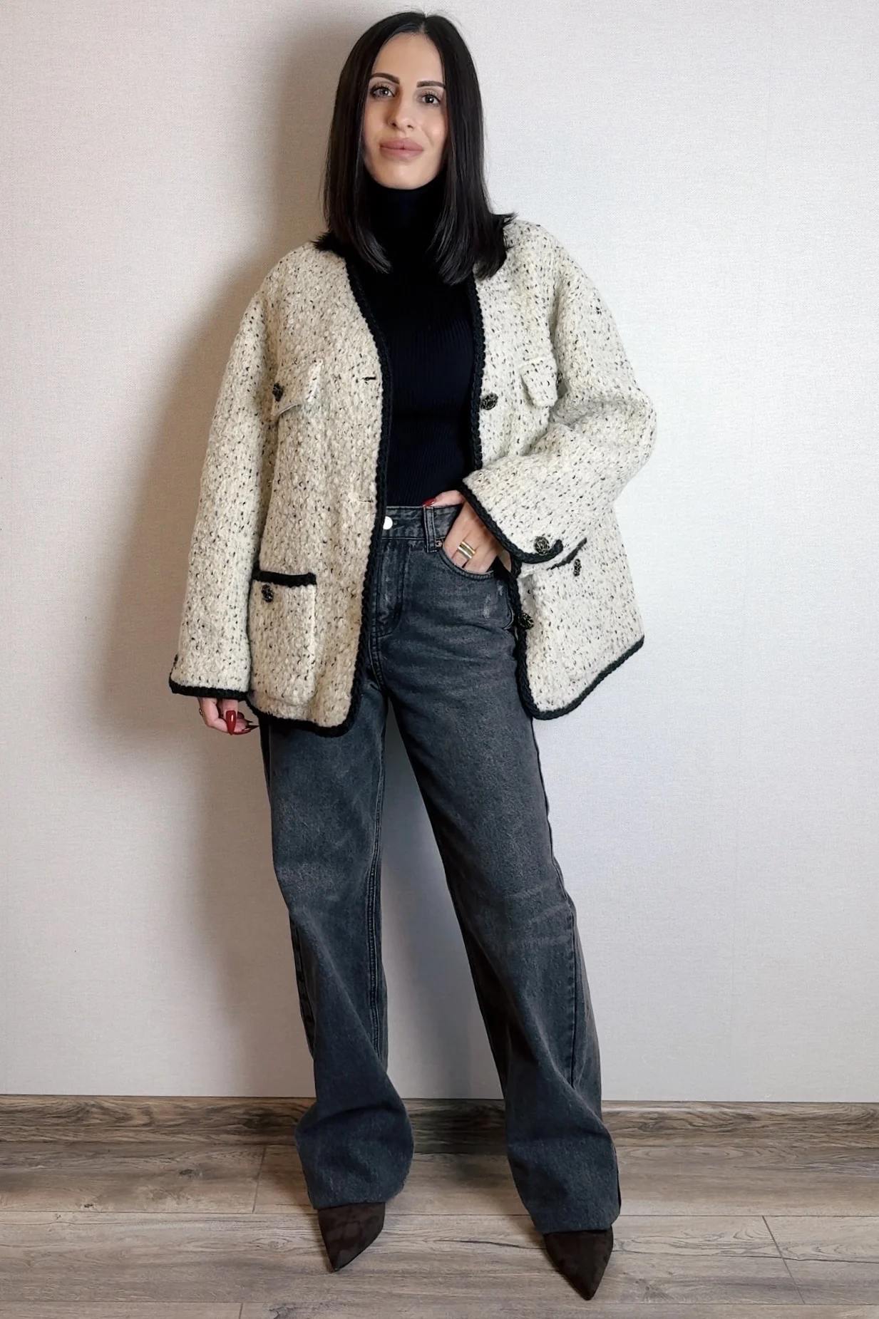 Шерстяное пальто «жакет» На свои параметры 86/66/89 см и рост 160 см заказала жакет в размере S в цвете Off white. По объемам и длине есть запас на бОльшие параметры. Состав: верхняя часть - 100% шерсть; атласный подклад. Жакет утепленный, утеплитель - утиный пух. Материал плотный, тактильно приятный. Качество безупречное! Спереди застегивается на красивые металлические пуговицы в виде розочек. Такими же пуговицами украшены карманы и манжеты. Пальто по краям обшито контрастной каймой черного цвета. Спереди расположена глубокие функционирующие карманы. Прекрасное стильное пальто в стиле жакета известного мирового бренда. Я бы даже газвала его изысканным - смотрится оно роскошно и дорого! Обожаю этот бренд - всегда радут вещи качеством пошива, тканей и внешним видом!