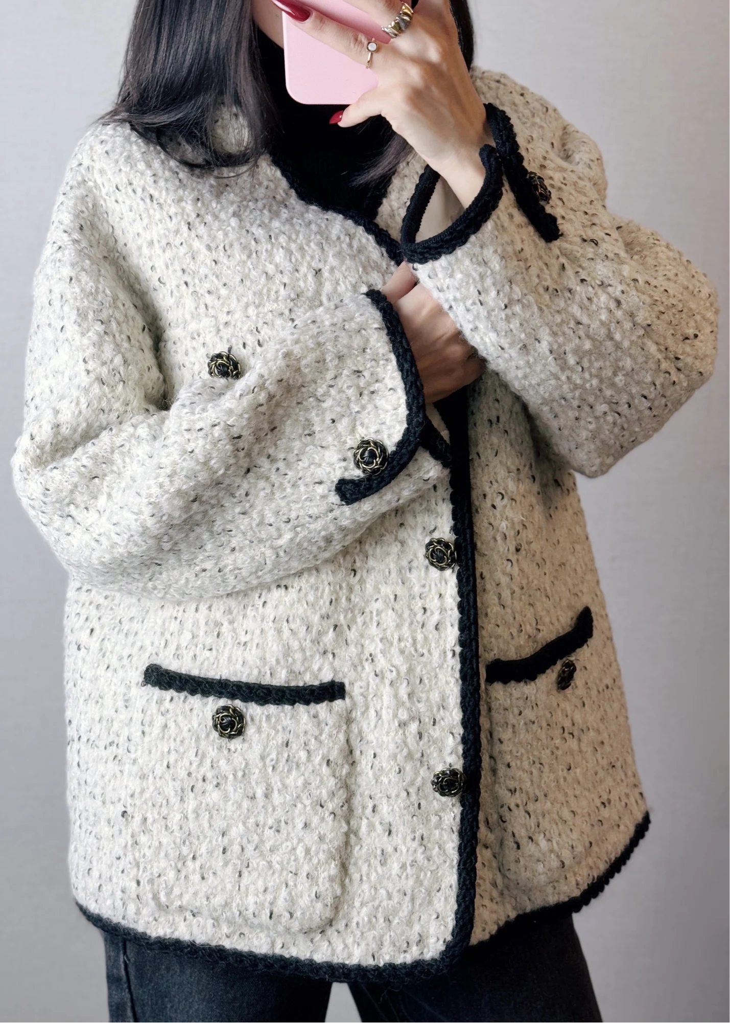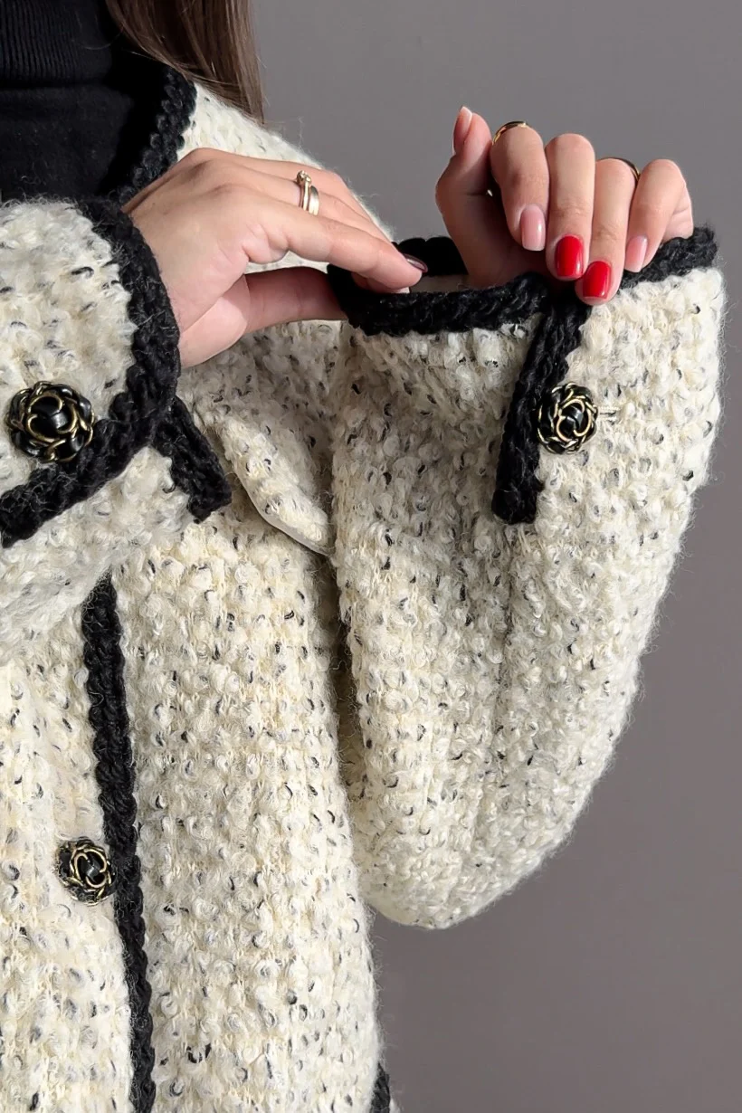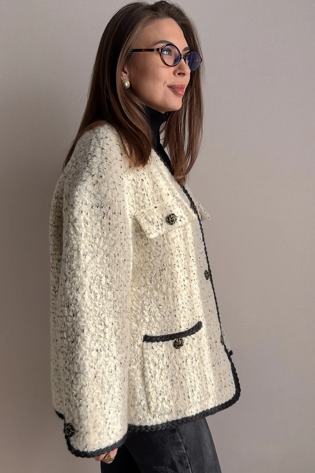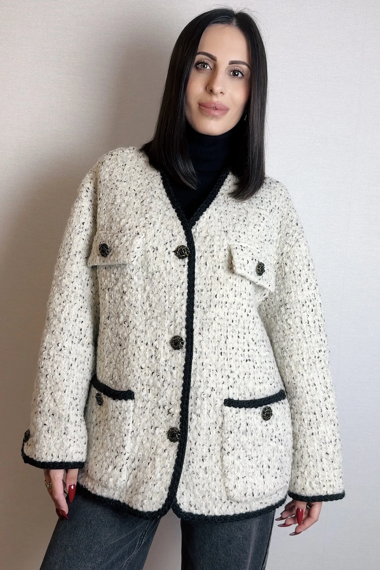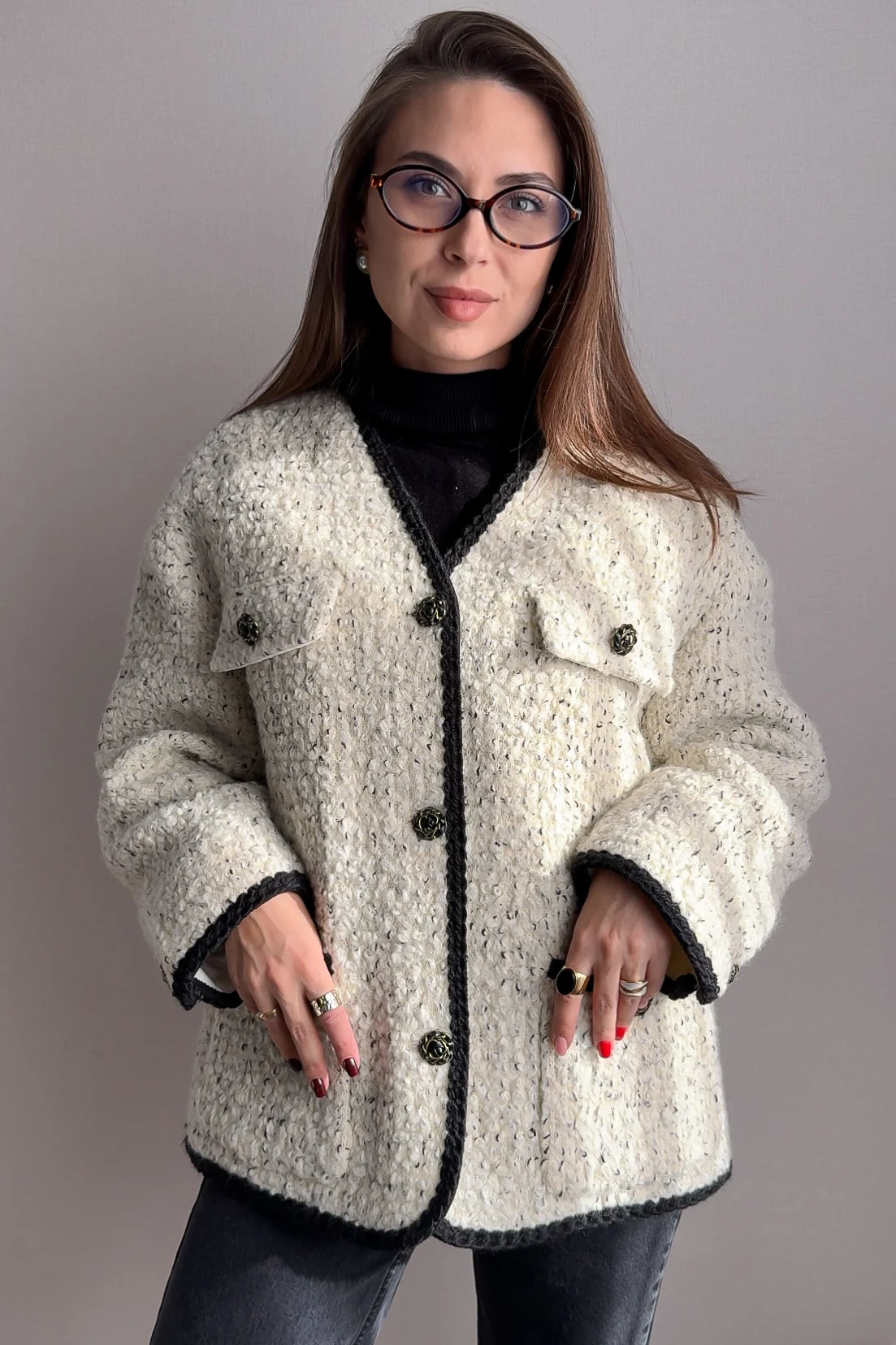 Шерстяное пальто «жакет» На свои параметры 86/66/89 см и рост 160 см заказала жакет в размере S в цвете Off white. По объемам и длине есть запас на бОльшие параметры. Состав: верхняя часть - 100% шерсть; атласный подклад. Жакет утепленный, утеплитель - утиный пух. Материал плотный, тактильно приятный. Качество безупречное! Спереди застегивается на красивые металлические пуговицы в виде розочек. Такими же пуговицами украшены карманы и манжеты. Пальто по краям обшито контрастной каймой черного цвета. Спереди расположена глубокие функционирующие карманы. Прекрасное стильное пальто в стиле жакета известного мирового бренда. Я бы даже газвала его изысканным - смотрится оно роскошно и дорого! Обожаю этот бренд - всегда радут вещи качеством пошива, тканей и внешним видом!