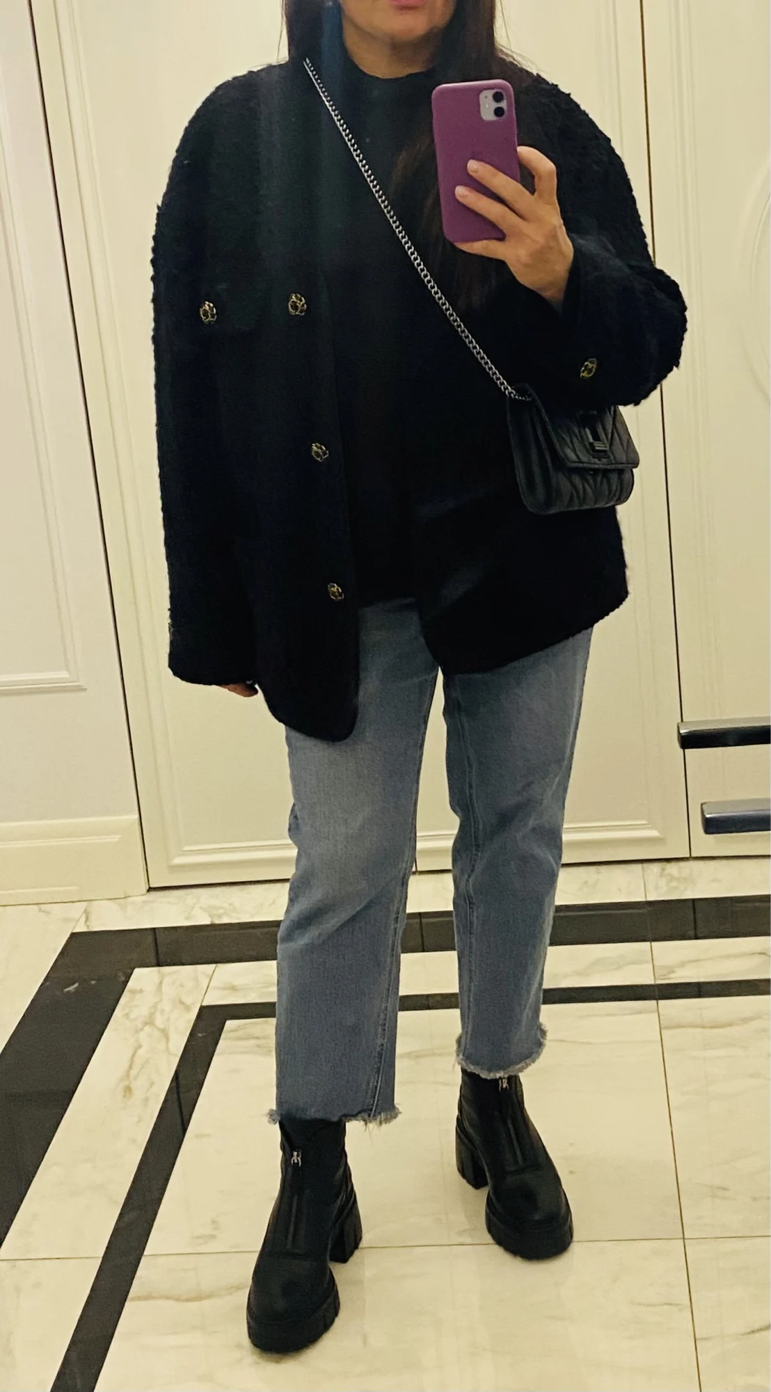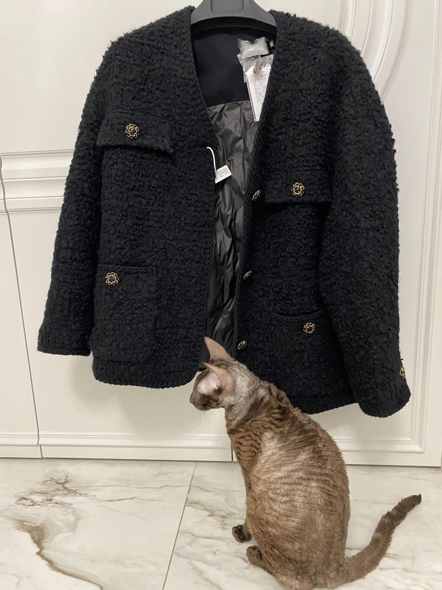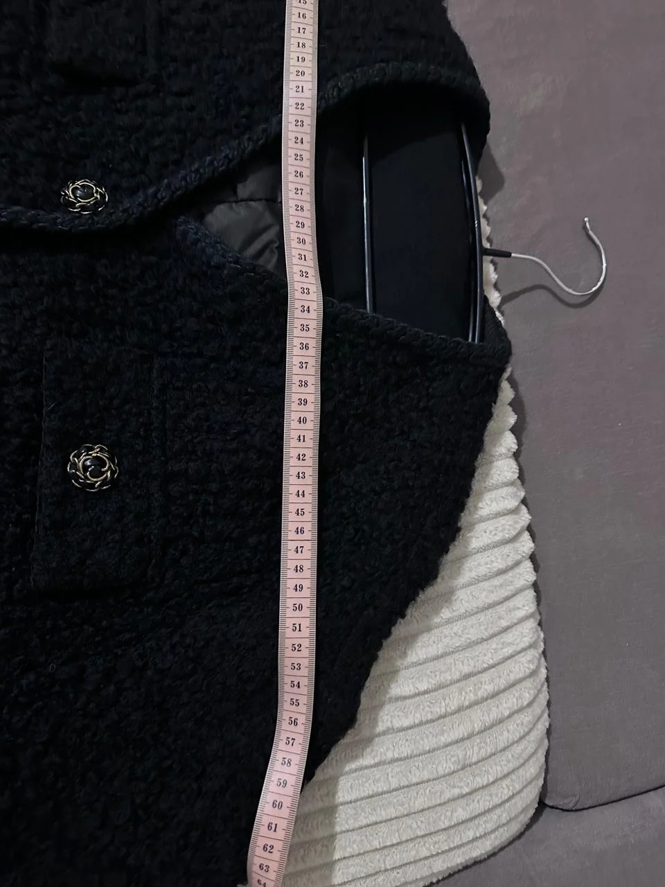 Пальто-жакет Безумно роскошная и стильная вещь. Очень красиво смотрятся контрастные края. Застегивается на 3 пуговицы, карманы так же ими декорированы. Подклад сделан из матовой атласной ткани. Внутри утеплитель на утином пуху. Состав: 100% шерсть. Материал плотный, пушистый. Вес ощущается на теле, но достаточно комфортно. Жакет действительно теплый, подойдет на прохладную погоду или как дополнительный слой под пуховик, дубленку или шубу. В комплекте дополнительная пуговица и образец пуха в воздушном мини-боксе. Как и всегда бренд радует безупречным качеством. Еще ни один товар меня не разочаровал. Все швы ровные, не было постороннего запаха. Само пальто было упаковано в фирменный противоударный пакет. На рост 158, параметры 92-64-88 выбрала размер М и ничуть не пожалела. Рукава отличной длины. Сам жакет не большой. Со свитером сел прекрасно. И я бы не стала брать меньше и не советую никому, особенно, кто примерно таких же параметров и роста. От всей души рекомендую этот жакет, выглядит намного дороже, чем стоит. Берите - не пожалеете, и заглядывайте ко мне на канал.