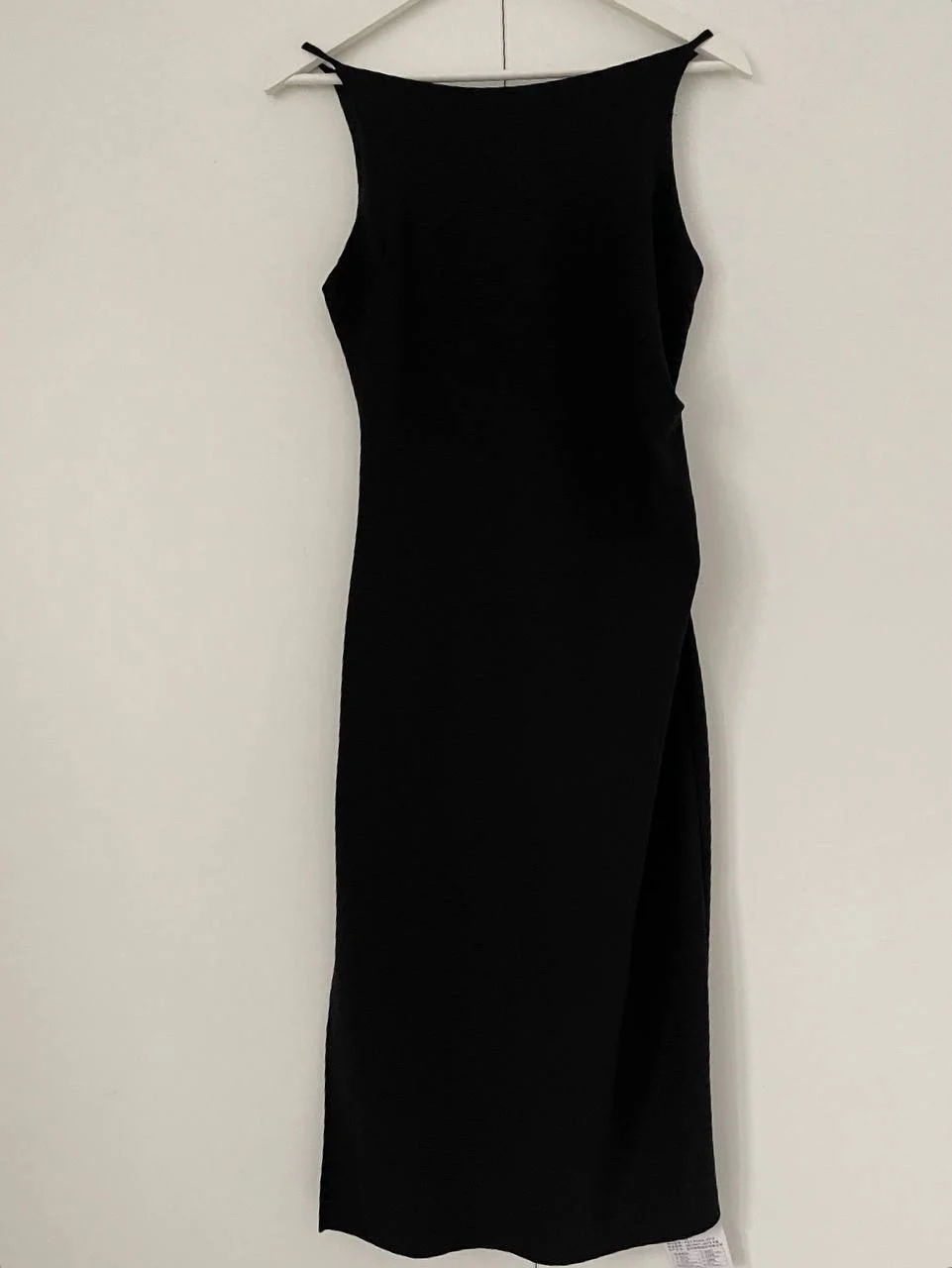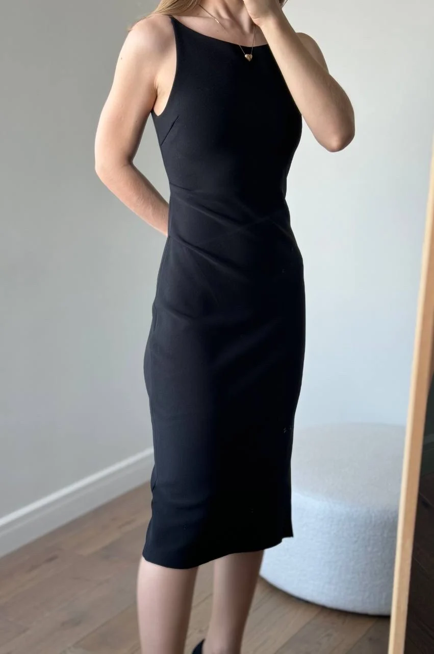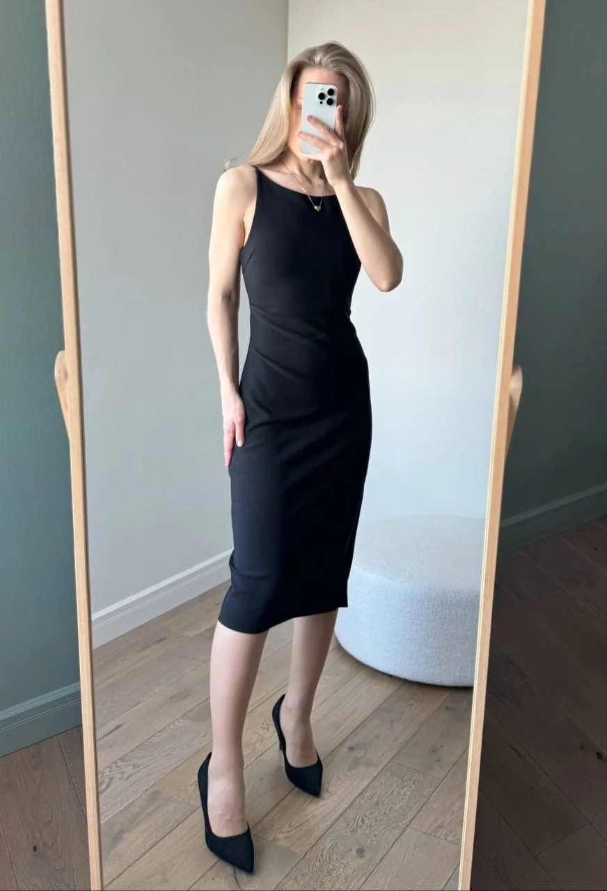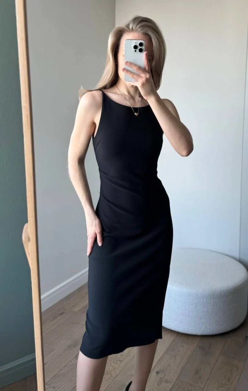 Красивое черное платье Очень понравилось! На мои параметры 80/62/94, рост 165 см платье хорошо подошло в размере S. Материал плотный и эластичный, не просвечивает. В области груди есть подкладка. С одной стороны по ножке идет разрез. С другой - драпировка в области талии.