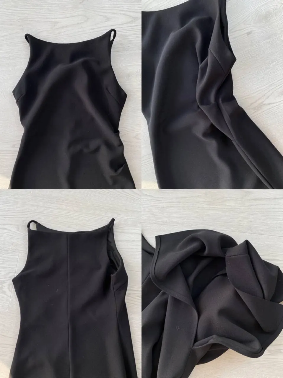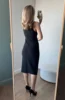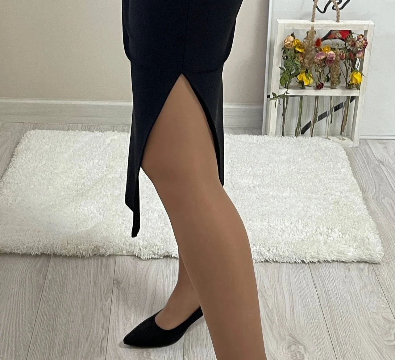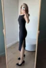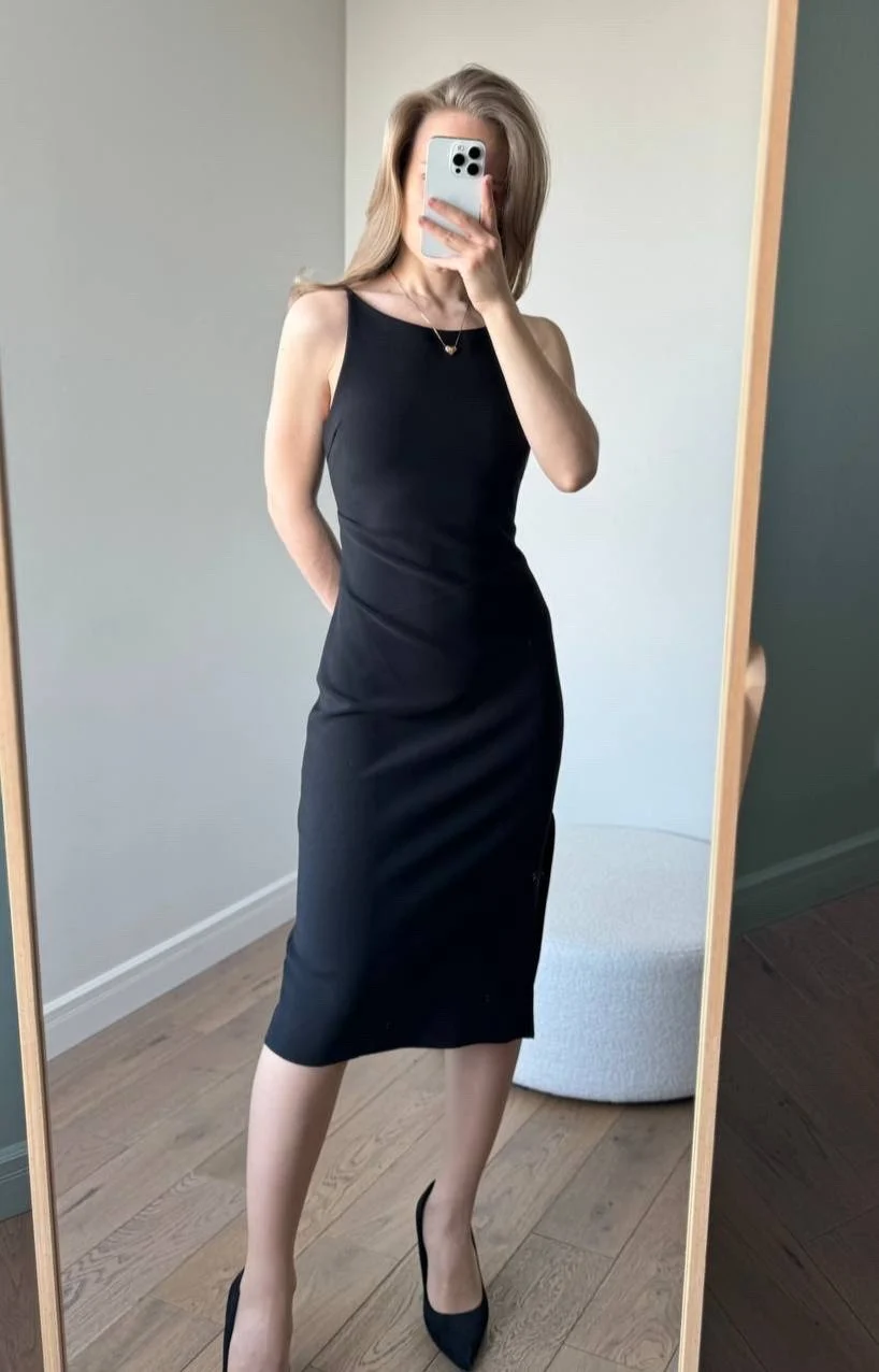 Красивое черное платье Очень понравилось! На мои параметры 80/62/94, рост 165 см платье хорошо подошло в размере S. Материал плотный и эластичный, не просвечивает. В области груди есть подкладка. С одной стороны по ножке идет разрез. С другой - драпировка в области талии.