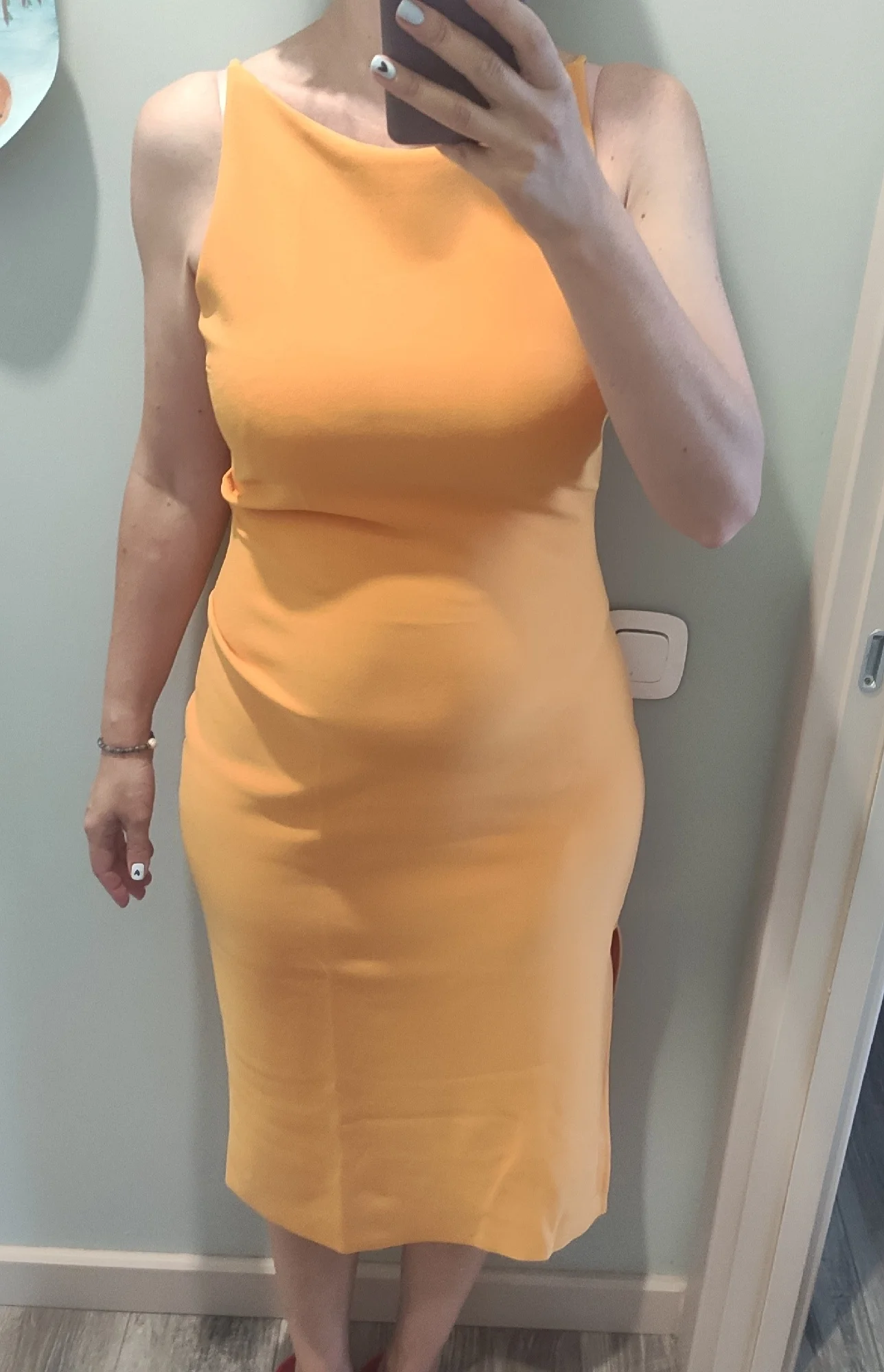 Платье футляр Эффектное платье Костюмная плотная ткань Садится просто превосходно Сбоку есть драпировка Размер на мне М ( 83/72/100 ) рост 164 см небольшой боковой разрез Теперь хочу такое белое и оранж