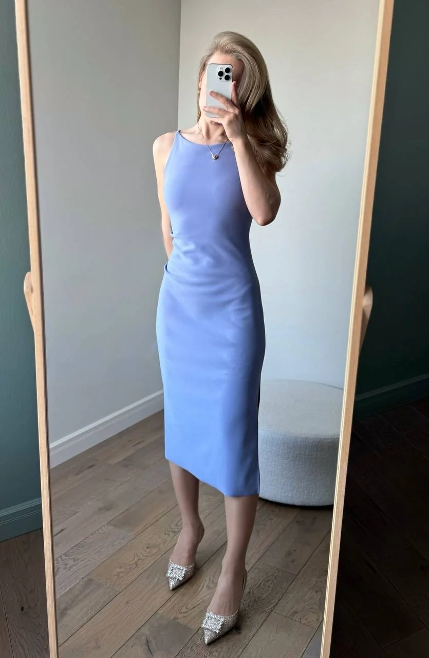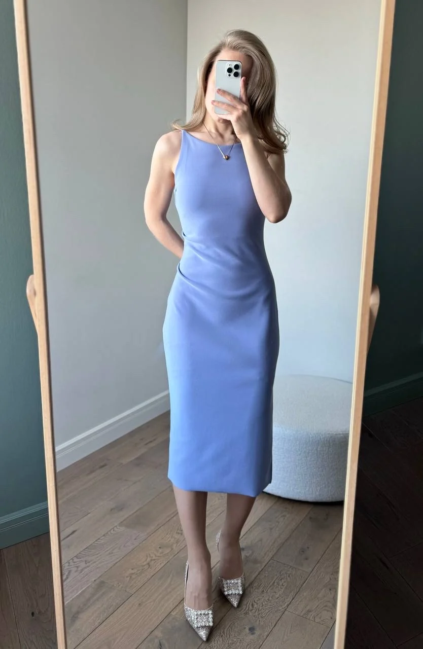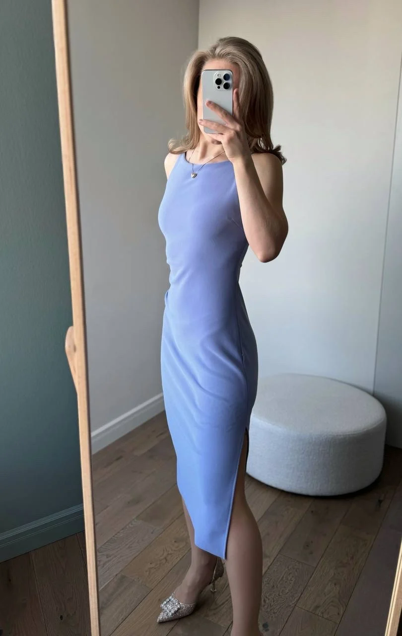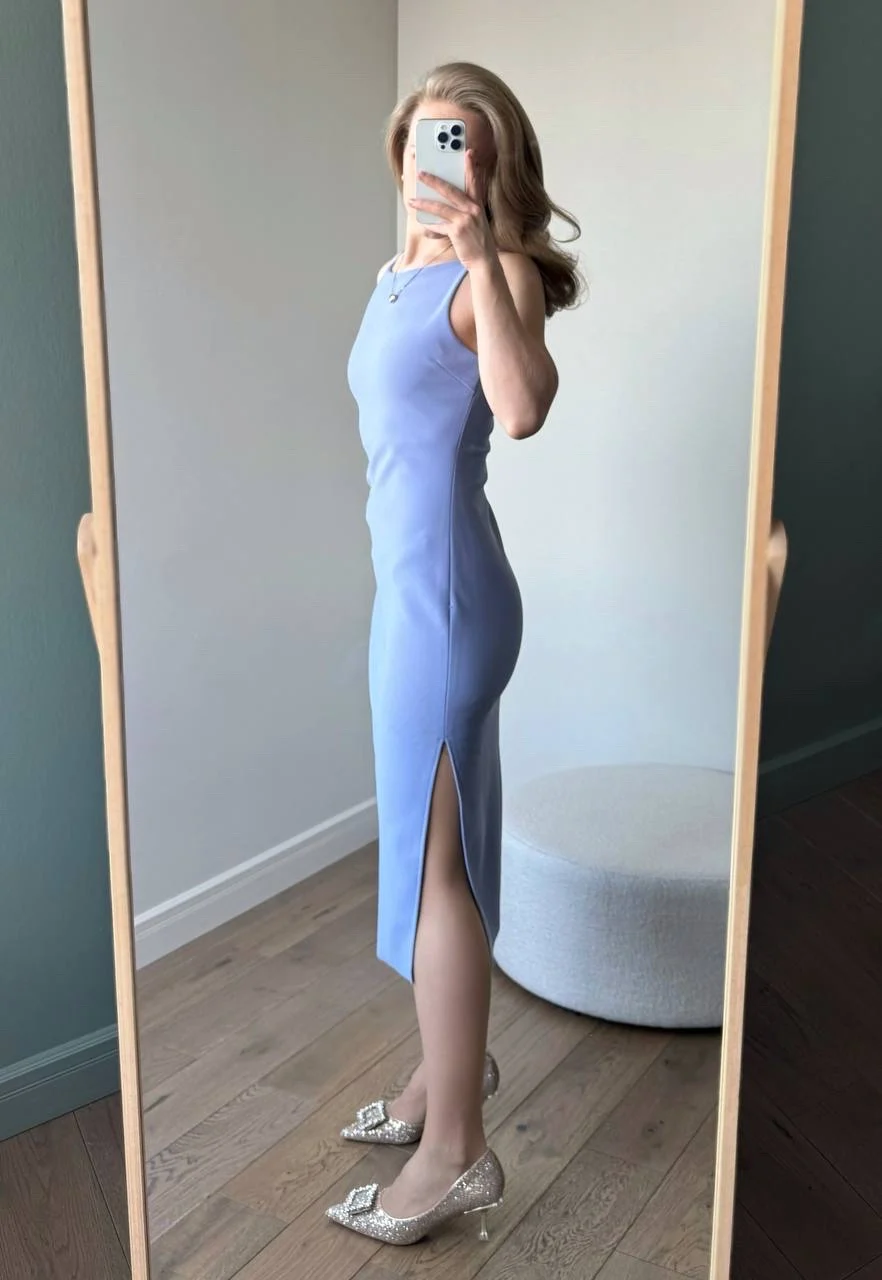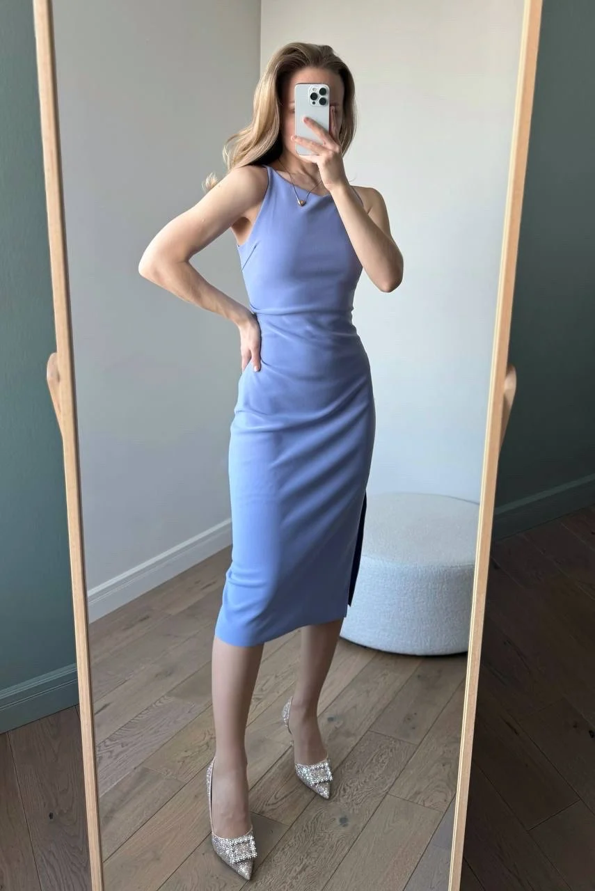 Голубое платье Очень красивое! На мои параметры 80/62/94, рост 165 см платье хорошо подошло в размере S. Материал плотный и эластичный, не просвечивает. В области груди есть подкладка. С одной стороны идет разрез по ножке. С другой - драпировка в области талии.