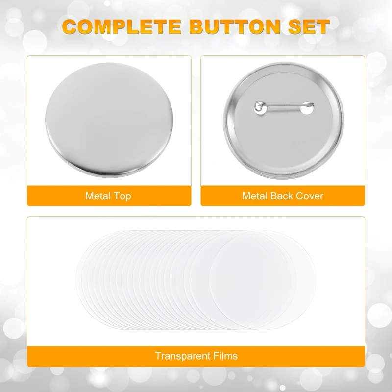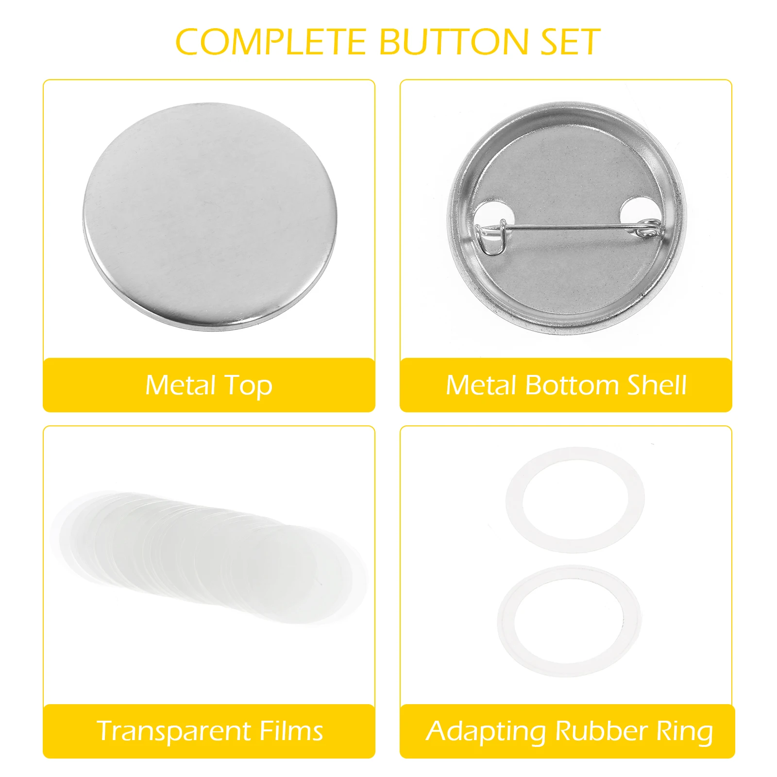 Полный комплект-каждый набор включает в себя: 1 * нижнюю часть железного значка, 1 * верхнюю крышку железного штифта, кусок пластиковая прозрачная пленка и 1 * резиновое кольцо. С помощью этого набора вы можете создавать 200 металлические-булавка сзади кнопки. Металлические детали имеют лучшую текстуру и более прочные, чем другие пластиковые.