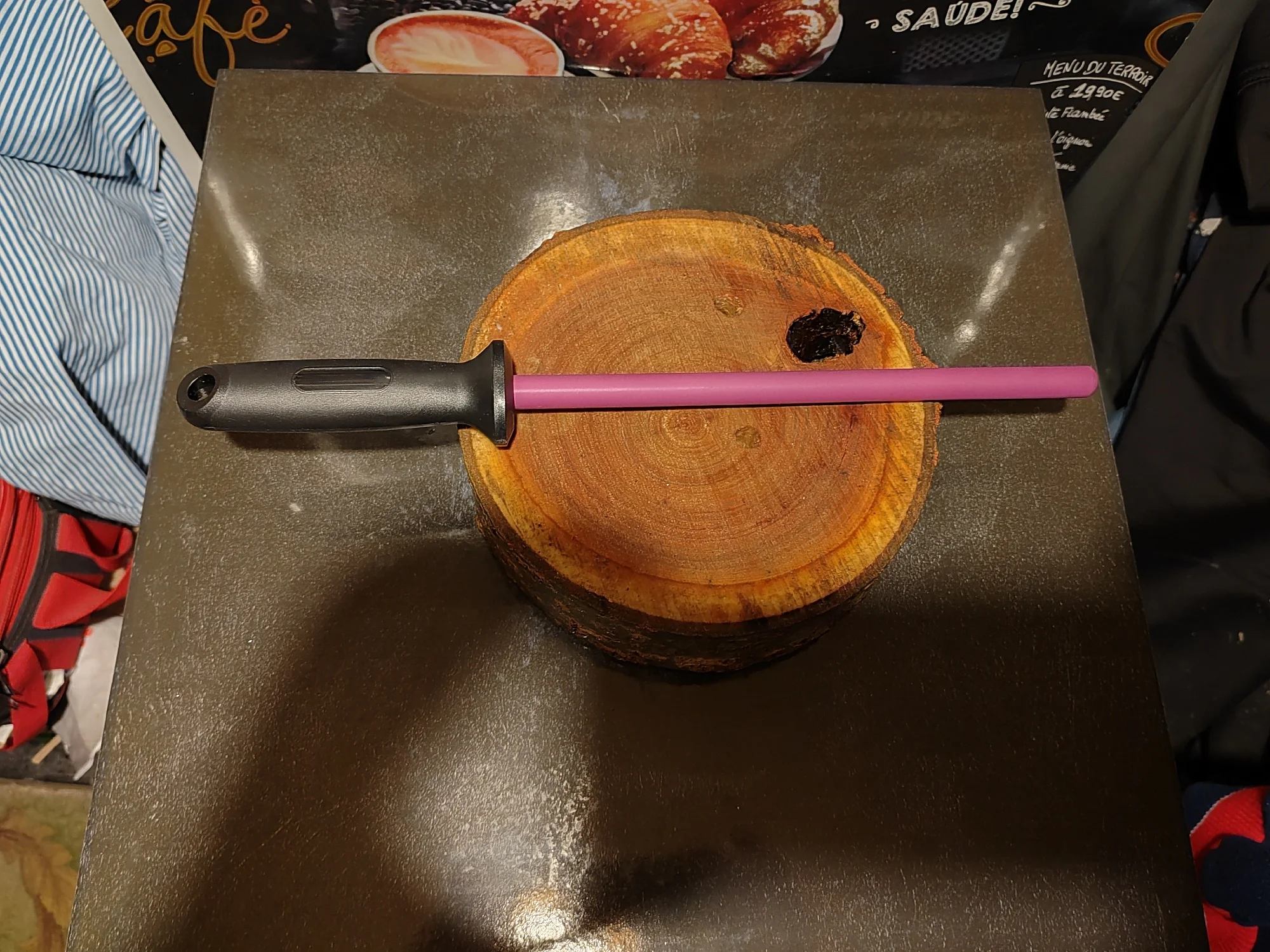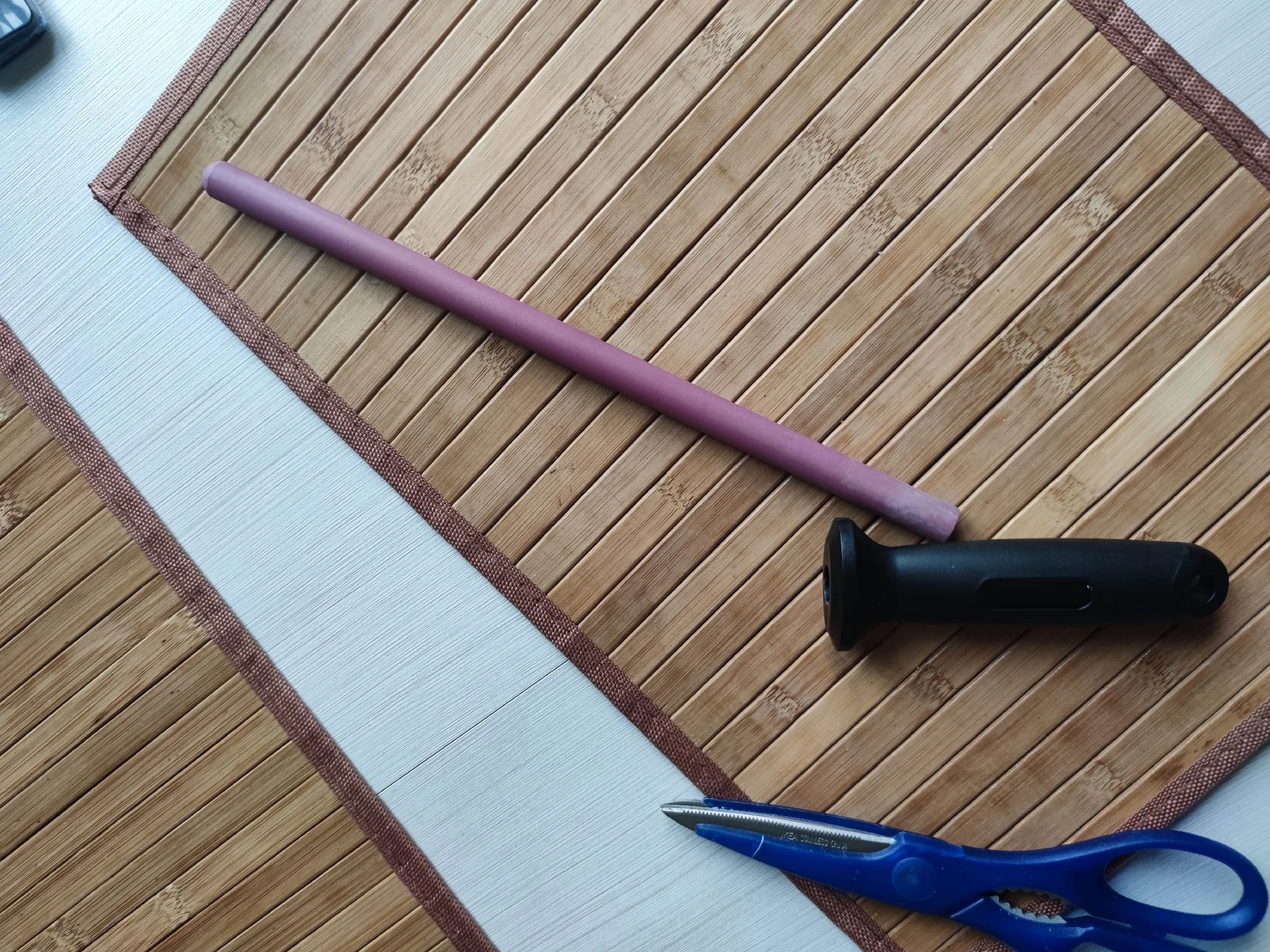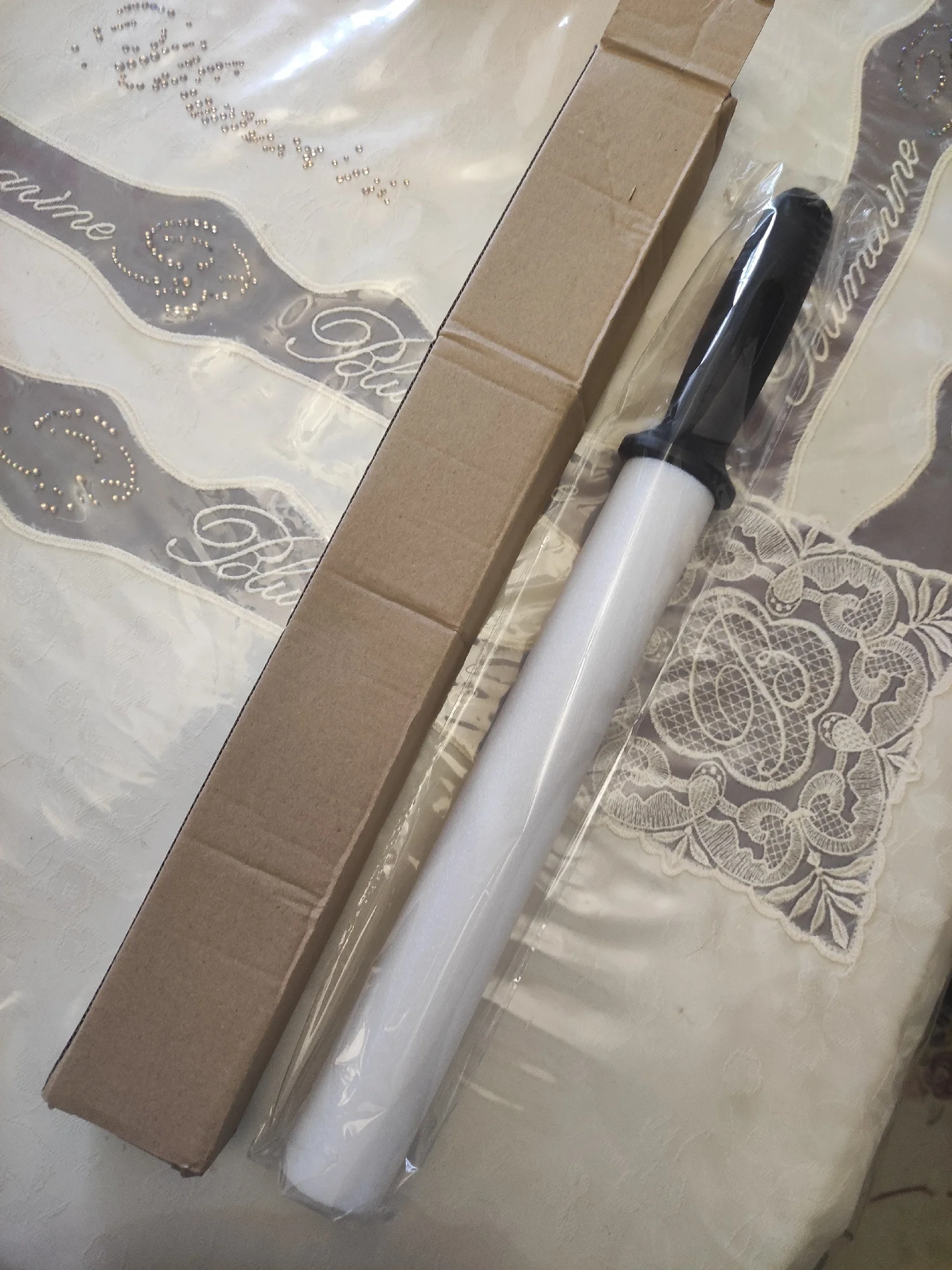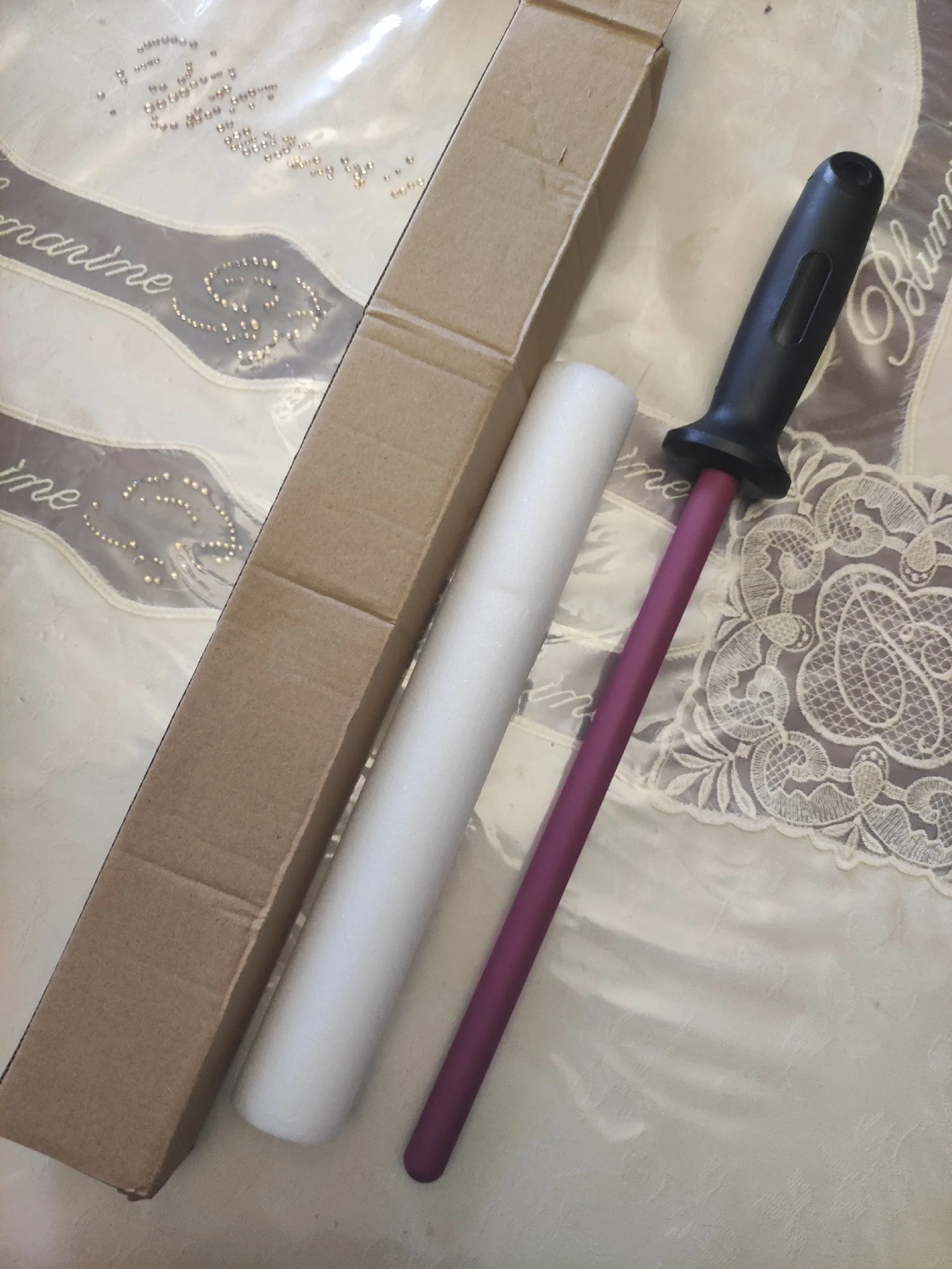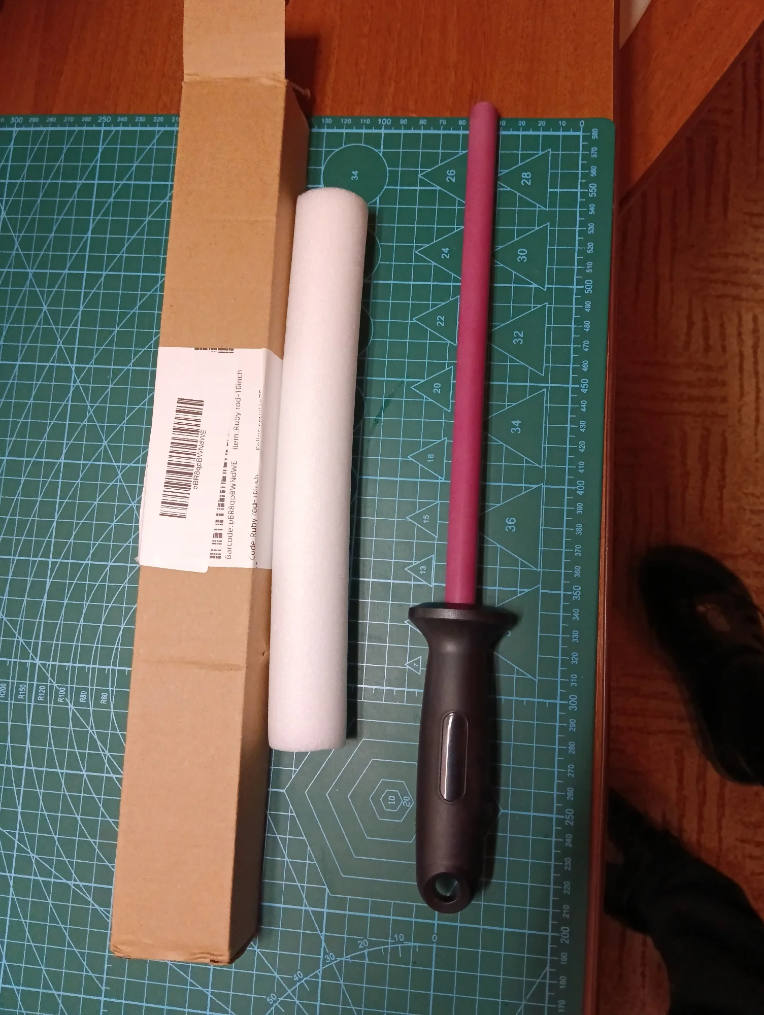 Отличный мусат. (за 1100 получилось взять). пришел быстро, упакован хорошо. Гораздо лучше, чем мусат из белой керамики. Поверхность ровная. Правит ножи очень хорошо, даже из твердой стали, ну может чуть подольше.. Из минусов довольно ощутимых - камень не держится в ручке!!! Но я так давно ждал, когда появится длинный рубиновый стержень (а продавались только 10 см на Али), что не стану снижать оценку. Посадил его на герметик и всё. Комментарий какой то тут прочитал, пишет чел - слезла краска, как он подумал, и типа теперь мусат не работает, он видимо думал наточить мусатом все ножи в доме и засрал камень (теперь поможет только пемолюкс, сода, а если уж совсем сильно забился, то наждачка нулёвка). Мусат - для правки ножей, можно и наточить конечно им, но тогда его нужно смазать маслом. Я лично (рубиновый) всегда смазываю, даже когда правлю. Совет тем, кто точит на этом камне - смажьте вазелиновым маслом (продается в аптеке, или масло -Джонсонс беби) и мусат не будет засаливаться и забиваться шламом! А самое главное, не будет быстро изнашиваться камень, очень на долго хватит. Очистить мусат потом можно - капнуть это же масло и салфеткой протереть и всё! Вообще норм штука, очень выручает, советую.