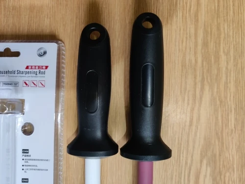 На фото в порівнянні з іншими мусатом від фірми Taidea. Якість хороша. Рівний, без дефектів. Зернистісь думаю відповідає заявленій. На перший погляд знімає метал трохи краще ніж білий. Ручка на рубіновому трохи більша і зручніша ніж на білому. Правда на рожевому ручка більш пластикова по відчуттям, а на білому наче трохи прорезинена. Може просто різний пластик використовується. Для підводу хороших ножів однозначно рекомендую. Якщо треба заточити, то краще докупити якийсь мусат чи точилку з алмазним напиленням.