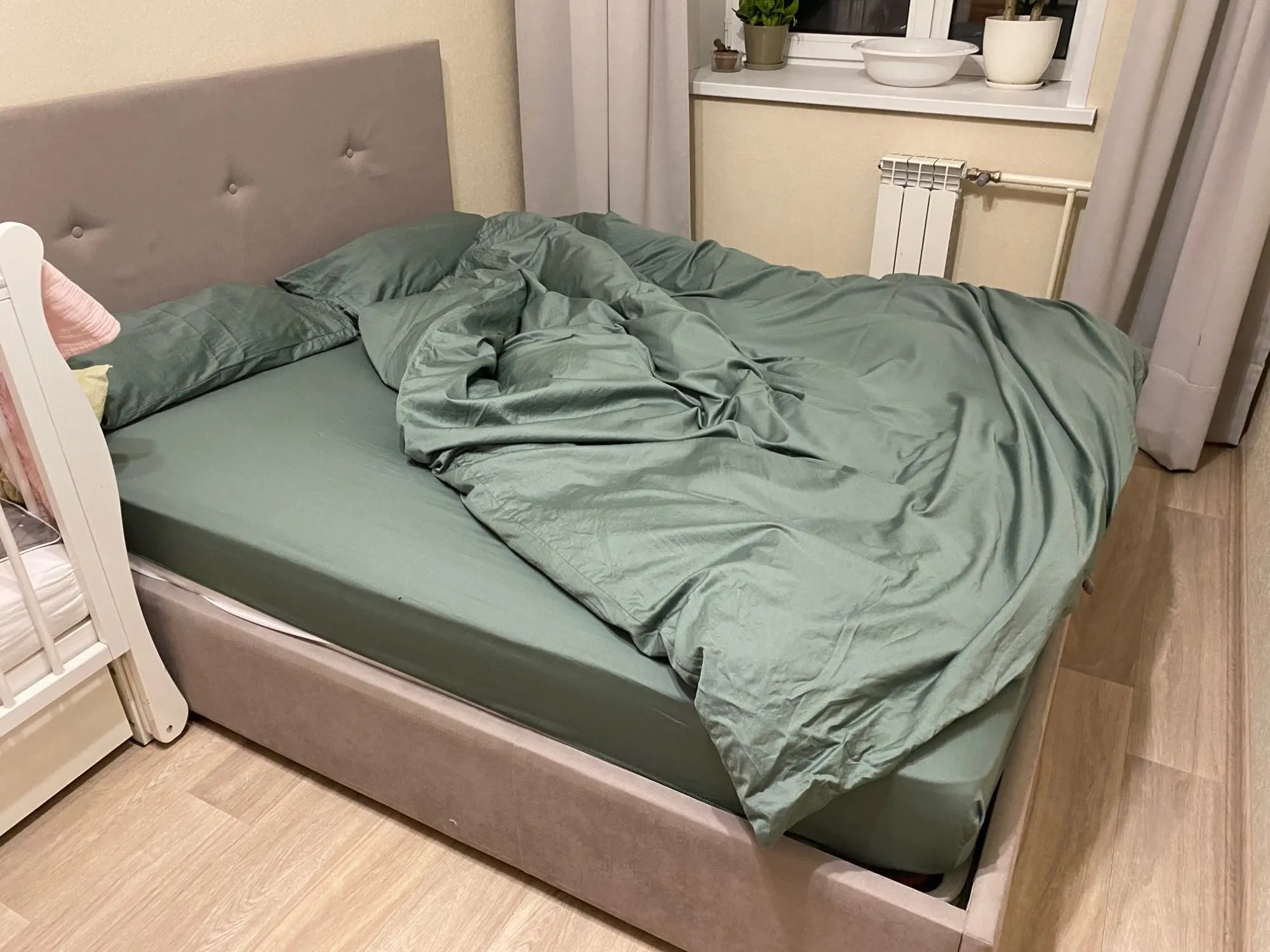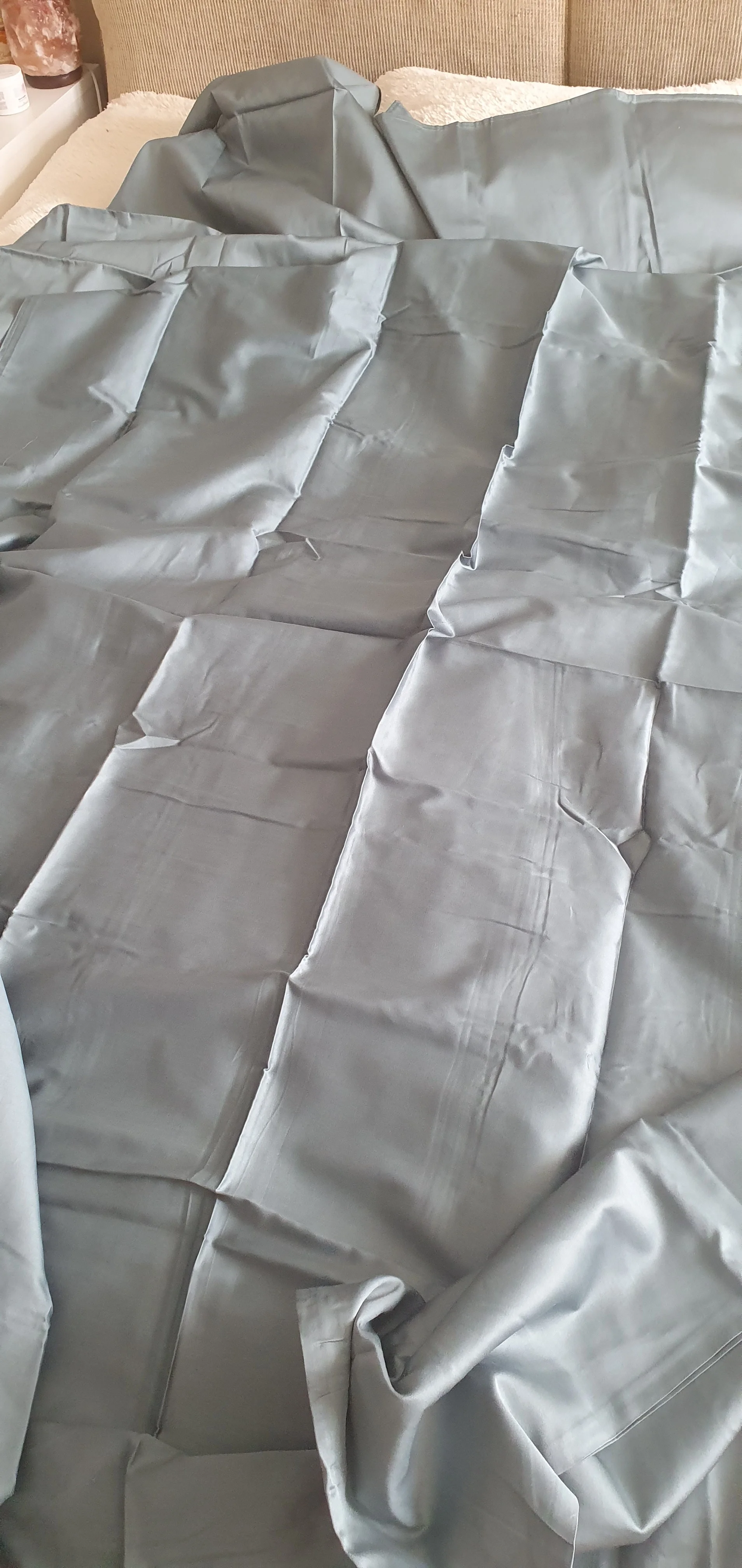 Очень хорошее постельное, 20 из 10 балов, все строчки ровные, нитки не торчат. Очень приятное тактильно и цвет просто космос. На фото почему-то серое, в жизни зелено-голубо-серое, заглядение) 100% хлопок. 2 пододеяльника 1,5, 2 наволочки 50×70.Irina u. 27 апреля 2023
